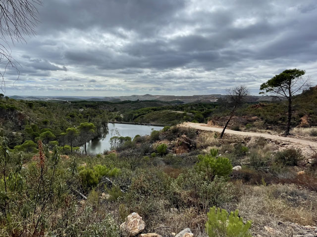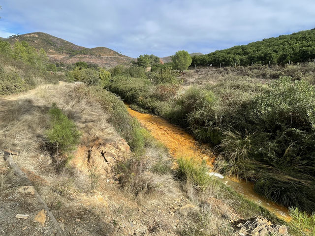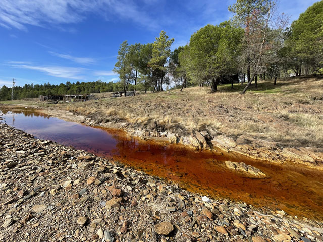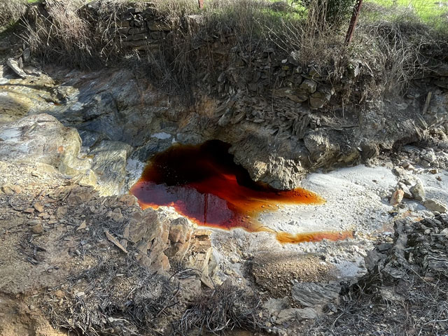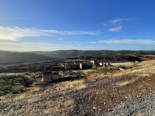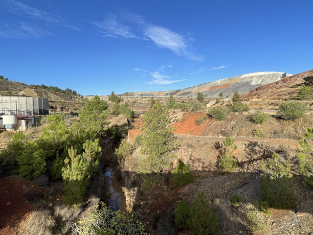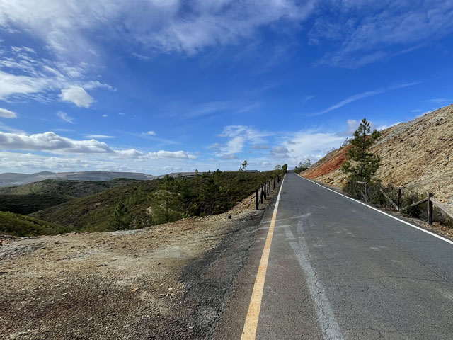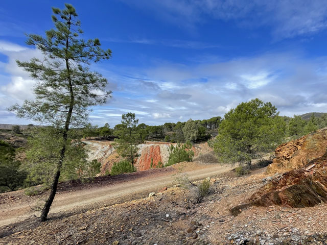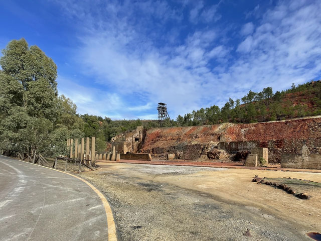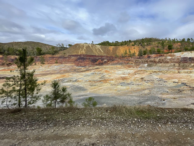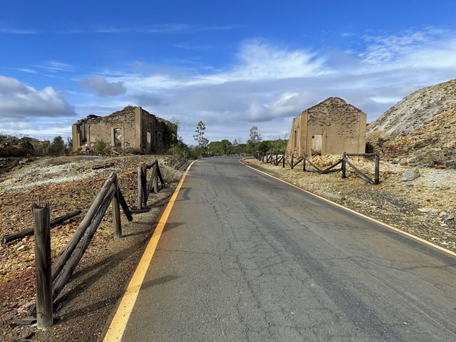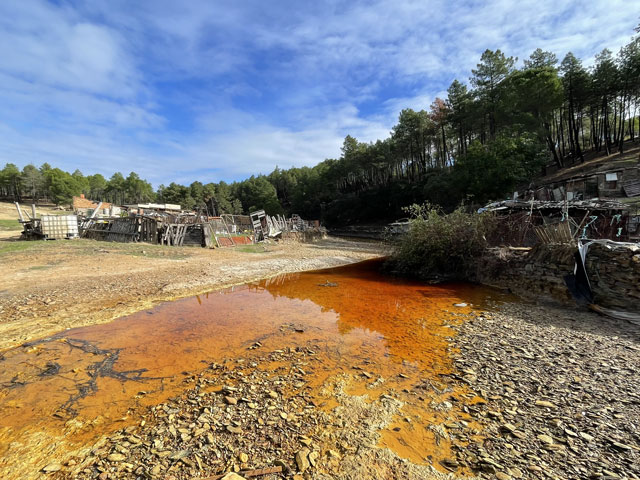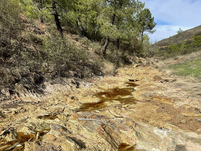 Auf dem weiteren Weg, der zunächst durch regelrechte Slums und dann durch schönen Pinienwald führte, waren immer wieder Reste früheren Bergbaus zu sehen. Der Weg kreuzte außerdem mehrmals einen Bach, der so aussah, wie ich den Rio Tinto von Bildern kenne: eine rote Brühe. Dann führte der Weg durch eine verfallene Bergbausiedlung, in der sich aber ein paar Leute niedergelassen haben. Wovon die hier leben und wie die ihren Tag verbringen, möchte ich gern wissen. Gesehen habe ich keinen Menschen, dafür umso mehr Hunde, die zwar gebellt haben, aber friedlich blieben. Zwei große sind mir ein Stück nachgelaufen, aber vermutlich nur aus Neugier, denn sie haben respektvoll Abstand gehalten.