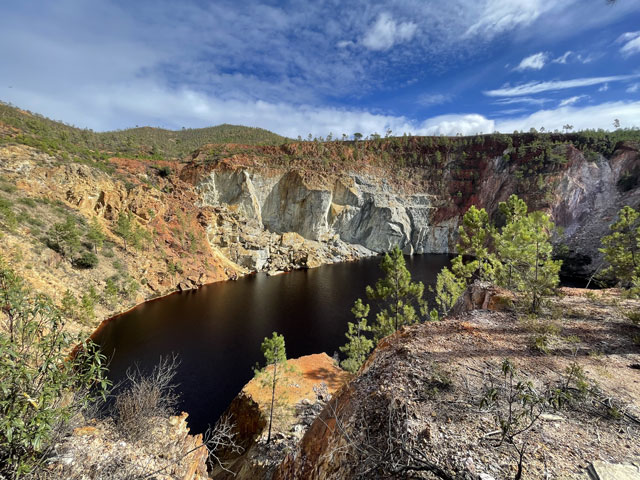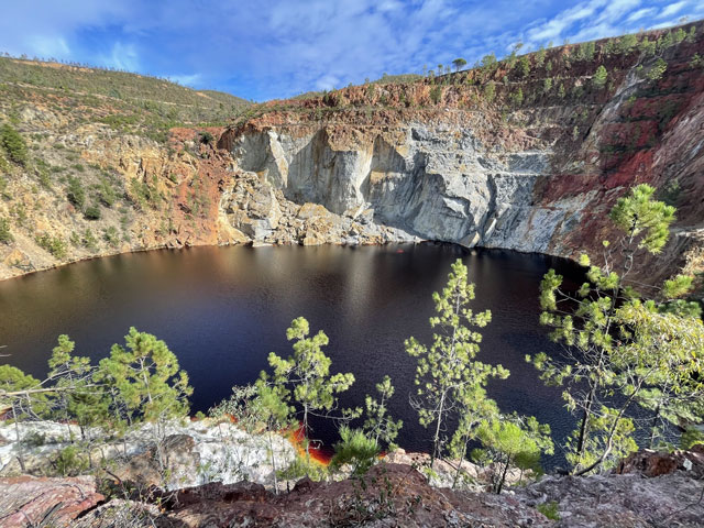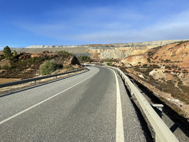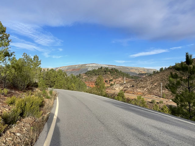 Etwa auf der Hälfte der Strecke kam das, worauf ich mich schon so gefreut habe: die Grube „Peña del Hierro“. Das ist ein vergleichsweise kleiner, fast runder Tagebau, der aufgegeben wurde und voll Wasser gelaufen ist. Da gibt es am Grubenrand einen Aussichtspunkt, von dem man einen hervorragenden Blick auf den „Kratersee“ hat. Das Wasser ist da dunkelrot, als hätte man eine Sau geschlachtet. Da hätte ich stundenlang sitzen und staunen können. Hier wurde übrigens auch unter Tage abgebaut, wie man an dem Förderturm und Resten der Anlage ganz in der Nähe des „Kraters“ sehen kann. Das Bergwerk kann man gegen Eintritt besichtigen, auch einen Tunnel, der zum „Kratersee“ führt und dort knapp über dem Wasser seine Öffnung hat. Dafür war aber keine Zeit. Außerdem haben mich die bunten Halden, die jetzt immer wieder zu sehen waren, viel mehr gereizt.