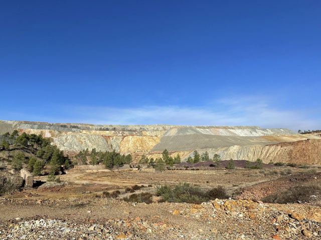 Nach wenigen hundert Metern ging der Weg rechts ab. Genau an der Stelle gab es einen tollen Blick von hinten auf die Halden, die rings um die Grube „Cerro Colorado“ aufgetürmt wurden. Jetzt verstehe ich auch, warum die auf der Webseite der Stadt angegebenen und hier genannten Tiefen der Gruben viel größer sind, als das, was man beim Zählen der Höhenlinien auf der Karte herausbekommt. Vermutlich rechnen die von der Oberkante der Halde. Überhaupt bleibt einem als Laien so vieles schleierhaft. Mich würde zum Beispiel interessieren, wer nach welchen Kriterien entscheidet, ob das, was der Bagger auf die Dumper lädt, auf die Halde oder in die Fabrik kommt. Das, was da auf die Halde geschüttet wird, sieht nämlich genauso bunt aus, wie das, was in der Grube abgebaggert wird. Da wundert man sich, dass da nicht das „Gute“ aus den Steinen rausgeholt wurde. Sicher, weil es sich nicht lohnt. Aber wer entscheidet das nach welchen Kriterien? Wenn man der Sprache kundig wäre, würde man das vermutlich bei einer der angebotenen Besichtigungstouren erfahren.
