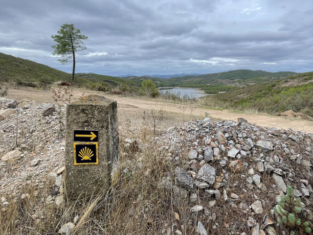 Den Empfehlungen von Fernando und Juan Carlos folgend, bin ich nicht auf der Straße nach Campofrío gelaufen, sondern auf einer neuen Variante des Camino über Nerva. Die war zwar mit über zwanzig statt zehn Kilometern wesentlich länger und mitunter etwas anstrengend, aber wie ich am Ziel gesehen habe, wäre die Straße auf der ganzen Länge ohne brauchbaren Randstreifen gewesen. Da macht es keinen Spaß, am Straßenrand zu laufen. Der neue Weg ist auch schon als Jakobsweg ausgeschildert, wenn auch noch etwas spärlich. Aber Juan Carlos hatte mit einen GPS-Track geschickt, den ich in meinem Kartenprogramm „Mapy“ laden und dann danach laufen konnte.