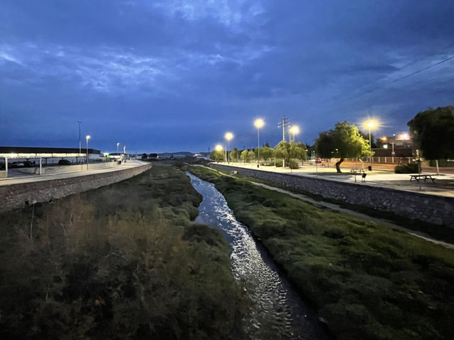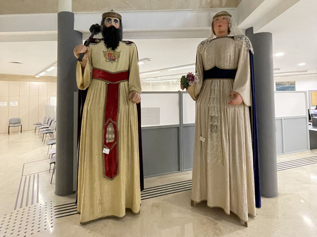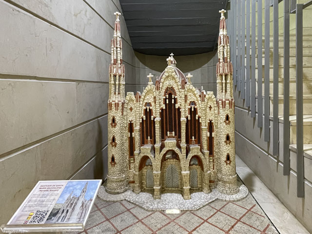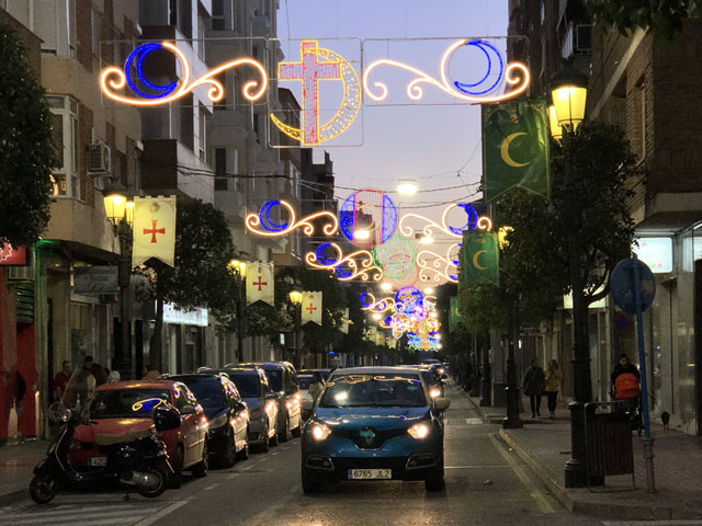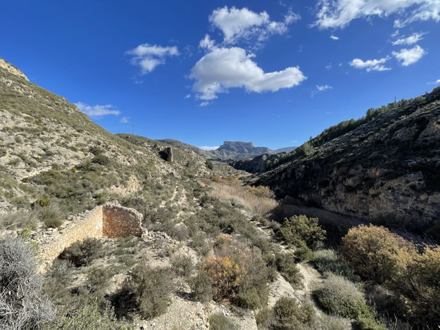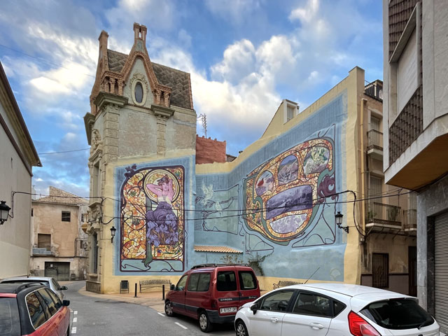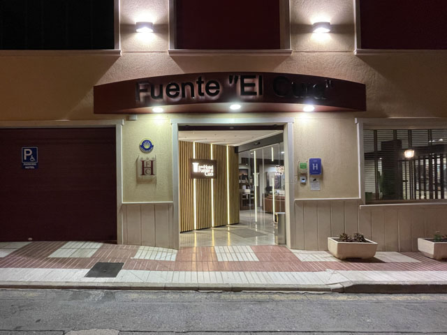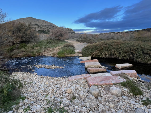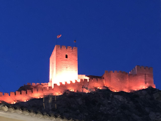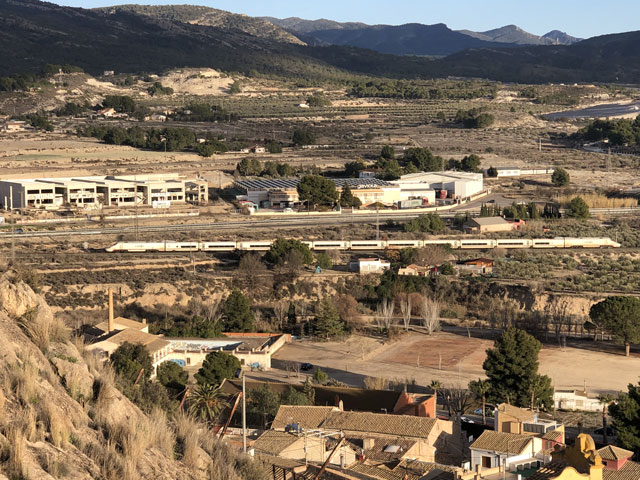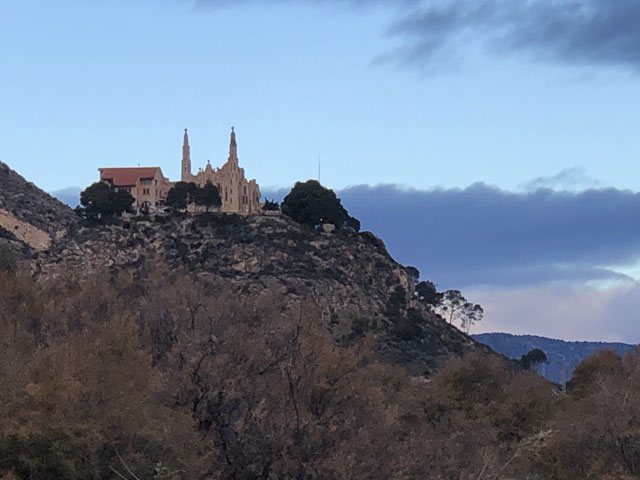 Als ich aus dem Hotel raus bin, war es noch stockfinster und dabei blieb es auch, bis ich im Nachbarort Novelda angekommen bin. Die Orte gehen ineinander über, weshalb die Straße mit einem Fußweg versehen ist. Sonst wäre es im einsetzenden Berufsverkehr nicht möglich gewesen, dort im Dunkeln zu laufen. In Novelda landet man zunächst in einem Gewerbegebiet mit mehreren großen Firmen und einem Lager der Supermarktkette „Hiperber“, der ich hier erstmals begegnet bin und die mir recht preiswert erscheint. Vor dem Lagerhaus war um diese Zeit schon ordentlich Betrieb - viele LKW wurden ein- und ausgeladen. Im Ort bin ich dem Wegweiser zur Kirche und zum Rathaus gefolgt, in der Hoffnung, dort irgendwo einen Stempel abzufassen. Gestern hatte ich übrigens das seltene Glück, in Monforte bei der Polizei einen zu bekommen, denn im Hotel gab’s keinen und das Rathaus war schon zu. Hier in Novelda war zu meiner Überraschung kurz nach acht das Rathaus schon in Betrieb. Die Dame, die ich da angesprochen habe, hat mich in die gegenüber liegende Touristeninfo geschickt, mir aber durch geschickte Zeichensprache zu verstehen gegeben, dass ich zurückkommen soll, wenn ich dort keinen Erfolg habe. Da die Touristeninfo selbst noch nicht besetzt war, habe ich in einem angrenzenden Büro gefragt und drei Damen schwirrten aus, um den Stempel zu suchen, der aber vermutlich im Schreibtisch eingeschlossen war. Ich bin also wieder ins Rathaus, wo mir die nette Dame einen Kollegen ran geholt hat, der über den erbeteten Stempel verfügte. Wenn man kurz nach acht schon auf fünf nette, hilfsbereite Leute getroffen ist, kann es eigentlich nur ein guter Tag werden. Der Herr im Rathaus hat mich da noch die Deko fotografieren lassen und mir sogar angeboten, die Toilette zu benutzen. Die Kirche war übrigens auch schon auf. Da gab innen viel goldene Bemalung. Alle Säulen und Gewölberippen waren vergoldet, aber irgendwie sah das nicht aufdringlich aus. An Altären mangelte es auch nicht. Gleich am ersten bin ich auf den von mir verehrten St. Rochus gestoßen - jenen, der immer einen Hund bei sich hat und auf einen vermeintlichen Hundebiss im Oberschenkel zeigt, was aber eine Pestnarbe sein soll. Gleich um die Ecke hat der Ort ein „Museum der Moderne“ zu bieten, das sich offenbar mit dem Jugendstil befasst, denn überall am Haus fanden sich entsprechende Verzierungen. Hinter dem Ort führte der Weg zum Riu Vinalopó, der momentan nur ein kleines Bächlein in einem breiten, ausgetrockneten Flussbett ist. Der Camino verläuft einige Kilometer in diesem Flussbett, ist aber in der Karte gestrichelt eingezeichnet, was heißt, dass der nicht immer benutzbar ist. Bald hinter Novelda kam links auf einer Bergkuppe eine Kirche ins Blickfeld, die in Kleckerburg-Architektur ausgeführt ist und nicht zufällig Ähnlichkeit mit Gaudis „Sagrada Familia“ in Barcelona hat. Diese hier, die der Hl. Maria Magdalena gewidmet ist, hat ein Schüler Gaudis geschaffen. Da ich vor ein paar Wochen die Sagrada zu sehen bekommen habe, ist mein Bedarf an Gaudi-Bauwerken für den Rest meines Lebens gedeckt. Deshalb habe ich die Zeit und Kraft gespart, zur Kirche hochzusteigen. Im Rathaus hatte ich bereits ein großes Modell gefunden und fotografiert, so dass ich trotzdem mit Bildern aufwarten kann. Beim Modell ist allerdings nicht wie beim Original ein Turm bandagiert. Die ausgefallene Architektur ist offenbar nicht sonderlich langlebig. Abgesehen von wenigen Joggern und Radfahrern ist mir auf dem Weg entlang des Baches niemand begegnet. Noch vor der Kirche auf dem Berg war mal eine Furt zu passieren, was aber Dank der großen Steinquader im Wasser kein Problem war. Kurz vor Elda, nachdem eine Schnellzugtrasse und die Regionalbahn unterquert waren, führte der Weg aber zu einer Furt, die mal großzügig betoniert, aber dann zur Hälfte vom Wasser weggerissen wurde. Da war ein Passieren nicht so leicht möglich. Bei der Suche nach Stöckern, mit denen man sich abstützen kann, bin ich dann auf Pfeile gestoßen, die anzeigen, dass man hier nicht den Bach queren, sondern weiterlaufen soll. Diesem Hinweis bin ich gern gefolgt, obwohl der mit einem großen Umweg verbunden war. Beim Durchqueren von Elda habe ich nichts Bemerkenswertes entdeckt, aber eine Bar gefunden, in der es leckere Tortillas (spanische Omelett) gab. In Elda trifft der Weg wieder auf dem Riu Vinalopó, der als winziges Rinnsal in einem breiten, betonierten Flussbett fließt. Diesem Flussbett folgt der Weg auf der linken Seite in Richtung Norden, wobei es durch ausgedehnte Parkanlagen und vorbei an einem noch in Betrieb befindlichen Taubenturm geht. Info-Tafeln klären auf, dass hier schon zur Römerzeit eine Straße (Via Augusta) verlief. Hinter der Stadt bleibt der Weg weiter dem Fluss treu und windet sich mit ihm durch die Berge. Er ist allerdings an vielen Stellen gestrichelt eingezeichnet, also nicht immer benutzbar. Es geht vorbei an der Ruine eines Elektrizitätswerkes, unter der Straße hindurch und in einem engen Abschnitt des Tals vorbei an einer 300 Jahre alten Staumauer. Solche Sehenswürdigkeiten sind mit Infotafeln versehen, die aber leider nur auf Spanisch sind. Der Weg durch die Berge ist wirklich schön und Dank des Flusses ziemlich eben. Momentan ist die Vegetation nur leider recht grau, im Frühjahr wird es da durch Ginster und Co. sicher etwas farbenfreudiger aussehen. Hinter dem theoretischen Stausee kreuzt die Regionalbahnlinie den Weg im Tal, der sich nun ihr anschließt. Bahn und Weg verlaufen ab hier schnurgerade auf Sax zu. Im ersten Abschnitt hat man dafür einen halben Berg abgetragen, wie man an der hell leuchtenden Felswand erkennen kann. Der Weg führt teils durch das Grün zwischen der Bahn und dem jetzt parallel dazu laufenden Fluss, teilweise auch direkt neben oder im Schotterbett der Bahn. Die Burg über der Stadt, auf die man zuläuft, wird immer imposanter. Sie thront auf dem Kamm eines Felsens, der sich „aus dem Nichts“ erhebt