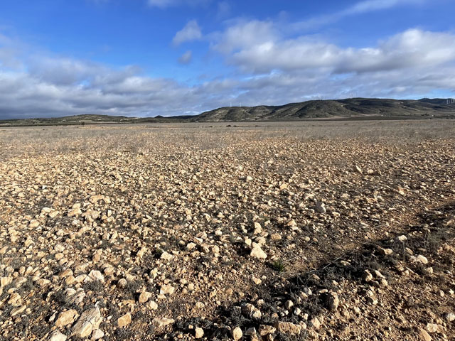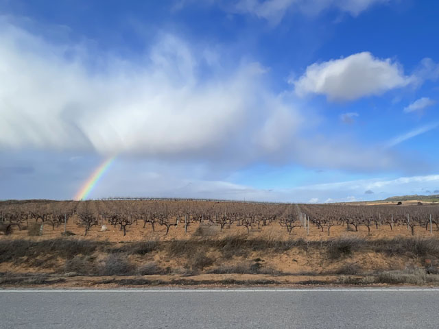 Ich habe in Caudete in der Herberge hervorragend geschlafen. Der Elektroheizer an der Wand hat es geschafft, eine annehmbare Temperatur im Schlafraum zu schaffen. Wenn man aber in den Flur getreten ist, war es dort lausig kalt. Also war es angebracht, bei geschlossener Tür alles einzupacken, sich komplett anzuziehen und dann unten im Aufenthaltsraum die Frühstücksprozedur so kurz wie möglich zu halten. Obwohl ich abends den Stecker des Boilers gezogen hatte, um oben die Heizung einschalten zu können, kam das Wasser noch so heiß aus dem Hahn, dass es für den löslichen Kaffee gereicht hat. Die bereits in Sax gekauften Baguettes waren noch gut brauchbar, die Lätta-Nachahmung, Käsecreme und Kochschinken aus meinem Rucksack sowieso. Ich hab‘ noch schnell ein paar dankende Worte ins Gästebuch geschrieben und dabei gesehen, dass eine Nacht vor mir ein Pilger hier war. Da die Etappen hier praktisch vorgeschrieben sind, wird der wohl bis zum Schluss einen Tag vor mir sein. Anfang Januar war sogar ein Deutscher in der Herberge, überhaupt scheint die ganz gut besucht zu sein. Kurz vor acht bin ich losgezogen und nach wenigen Schritten den Berg runter war ich in der Landschaft, die mich den ganzen Tag begleiten sollte: im Nichts. Aber das klingt so negativ. Im Western sieht man solche Landschaften gern: flaches Land mit spärlichem Bewuchs, eingerahmt von Bergen. Drei Viertel des Weges führten auf einem gewalzten, gut begehbaren Weg vorbei an Olivenhainen, Obstplantagen und später auch an Wein„bergen“. Dazwischen immer wieder Ödland, wo zwischen den allgegenwärtigen Steinen nichts oder nur wildes Gras wuchs. Die meist faustgroßen Steine, die hier auf allen brachen und bewirtschafteten Flächen liegen, legen den Verdacht nahe, dass hier Steine angebaut werden. Wenn sie mal nicht in einer lückenlosen Schicht unter den Oliven- oder Obstbäumen liegen, dann nur, weil sie gerade untergepflügt wurden. Im Herbst sind sie wieder da. Obwohl es nichts Spektakuläres zu sehen gab, hätte das Laufen durch diese karge Landschaft Spaß machen können. Wenn nicht der penetrante Wind gewesen wäre. Der blies vom Morgen bis zum Abend und ist dabei noch stärker geworden. In der Wetter-App gab es eine „mittlere Windwarnung“ wegen Windgeschwindigkeiten von 45 km/h mit Böen bis 80 km/h. Nach meiner Wahrnehmung bin ich von Böe zu Böe geeilt. Es war wirklich schlimm, weil man kaum vorwärts kam. Wo sonst ein Schritt erforderlich gewesen wäre, musste man heute manchmal zwei machen und sich dabei nach vorn stemmen, um nicht umgeschmissen zu werden. Natürlich kam der Wind genau von vorn, aus dem Westen. Gleich nach dem Losgehen kamen ein paar Tropfen runter. Da wäre ich normalerweise ohne Zucken weitergelaufen. Aber da ich der Kälte wegen „lange Männer“ untergezogen hatte, habe ich befürchtet, dass die durch die dünne Wanderhose schnell nass werden und ich dann den ganzen Tag Freude daran habe. Ich habe deshalb schnell den Regenponcho rausgeholt, was wie erwartet dazu geführt hat, dass der Regen sofort aufhörte. Anders als sonst habe ich den Poncho aber nicht wutschnaubend wieder ausgezogen und verstaut, sondern angelassen, weil er einen guten Schutz gegen den Wind und einen zusätzlichen Puffer gegen die mit dem Wind einhergehende Kälte bot. Nach etwa der Hälfte des Weges gab es erstmals eine Abwechslung: eine Straßenkreuzung! Der Weg passiert hier die Straße von Yecla nach Almansa, was mir die erste Rast ermöglicht hat. Die Kreuzung liegt etwas über dem umgebenden Terrain, so dass sich hier eine Böschung fand, an der man sich mal hinsetzen oder besser hinlegen konnte, ohne weggeblasen zu werden. Kaum lag ich da, hielt ein Radfahrer und fragte, ob alles ok sei. Da mir das vermutlich bei jedem Vorbeikommenden passiert wäre, bin ich bald wieder aufgestanden und weitergelaufen. Der Weg war übrigens im ersten Teil sowohl mit der Muschel als Jakobsweg als auch mit einem berittenen roten Elefanten als Camino Anibal (Hannibal-Weg) gekennzeichnet. Hier ist wohl einst Hannibal mit seinen Elefanten langgezogen, um Europa zu erobern. In der zweiten Hälfte gab es nur noch gelbe Pfeile als Wegweiser. Ich bin gespannt, ob ich nochmal dem roten Elefanten begegne. Gegen Mittag nahm der scharfe, kalte Wind nochmal zu. Nun rollten Büsche, die irgendwo ausgerissen wurden, wie Bälle über die Felder und über den Weg. Wäre nicht die Mehrzahl an den Weinstöcken oder den Plantagenbäumen hängen geblieben, wäre das eine regelrechte Invasion geworden. So waren die rollenden Büsche was fürs Foto. Obwohl mir schon längst Beine und Rücken wehtaten, musste ich nochmal alles aus mir herausholen, als es galt, meine Mütze zu retten, die mir der Wind trotz darüber gezogener Kapuze vom Kopf gerissen hat. Auf einem Feld ist die zum Glück an einer Scholle hängen geblieben. Ich werde mir mal beim SEK eine Gesichtsmaske besorgen. Die kann man ggf. auch bei einem Bankraub gut gebrauchen. So etwa 8 km vor dem Ziel stößt der Weg wieder auf eine Straße. Dieses Mal ist es die nach Montealgre, die man ein Stück laufen soll, um dann lt. Karte rechts bzw. ein Stück weiter lt. Ausschilderung links einen parallel verlaufenden Weg zu nehmen. Ich habe Karte und Ausschilderung ignoriert und bin auf der Straße geblieben, nicht nur, um etwas Wegstrecke zu sparen, sondern auch, um nicht allein in der Einöde zu sein, wenn ich nicht mehr weiter kann. Drei Kilometer vorm Ziel zogen dicke, dunkle Wolken auf und da ein etwas verfrühter Regenbogen zu sehen war, war klar, dass es gleich regnen wird. Und das Wetter hat sich an diese Regel gehalten … Den Poncho hatte er ich zwar noch an, aber der hing nur noch am meinem Hals und flatterte wie ein Schal, was wenigstens die Autofahrer veranlasst hat, etwas Abstand zu halten, um den Lack zu schonen. Ich habe also schnell alles wieder arrangieren müssen und konnte dann dem Regen recht gut trotzen. Ganz heroisch habe ich auch das Angebot eines Traktorfahrers a