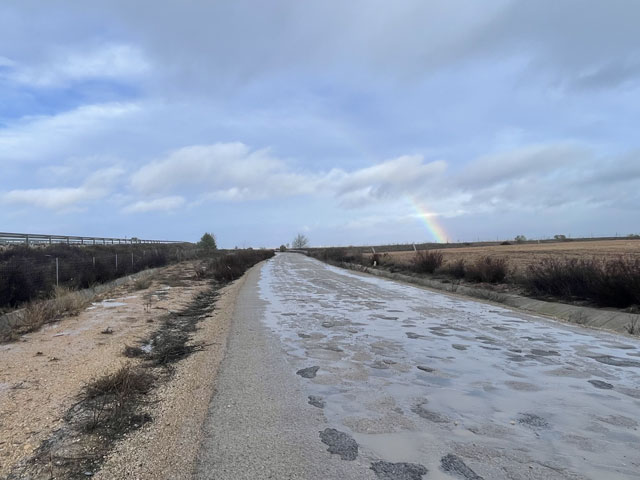 Leider ist die Heizung in meinem „Ratskeller“ kalt geblieben, vermutlich weil ein elektrisches Ventil klemmt. Ohne Schraubenzieher kann man da nichts machen. Ich habe trotzdem den üblichen Zehner in die Spendenbox geworfen, den es bei mir immer gibt, wenn nichts gefordert wird. Die Betreuer der Herberge sollen ja nicht den Spaß an ihrem Job verlieren. Da heute keine lange Strecke anlag, habe ich getrödelt und bin erst zum Sonnenaufgang gegen 8.15 Uhr losgezogen. Da hat es gerade angefangen zu regnen, so wie das angekündigt war. Den Regenponcho habe ich mir deshalb noch in der Herberge angezogen. Weil die Straßen in Chinchilla spiralförmig nach unten führen, war ohne Smartphone vor der Nase nicht genau zu sagen, wo man unten rauskommt. Da die Richtung stimmte, habe ich den nächstgelegenen Weg mit gelbem Pfeil genommen. Dass dies der östlich der Autobahn verlaufende Camino de Levante und nicht der Camino del Sureste auf der Westseite war, hat mich nicht gestört, denn beide führen nach Albacete, wo ich hinwollte.