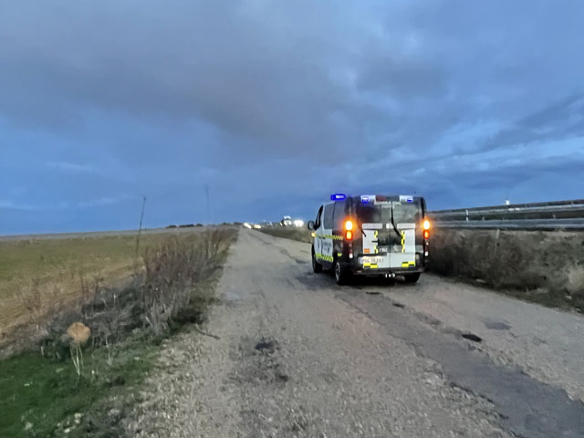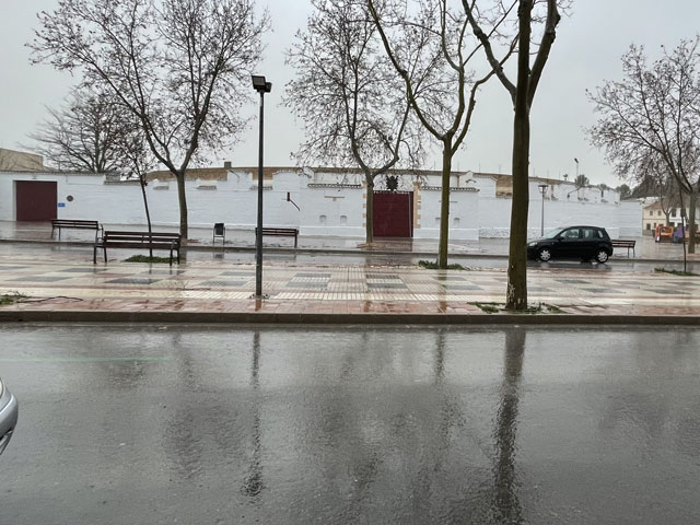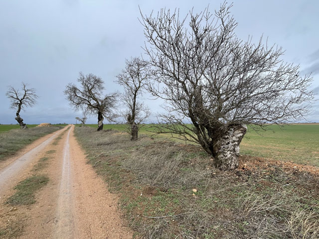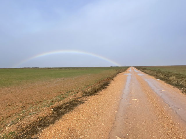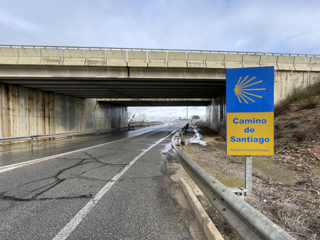 Ich bin trotzdem um sechs losgelaufen, damit ich noch im Hellen in La Roda ankomme. In Albacete im Dunkeln zu starten war kein Problem, denn da waren alle Straßen gut beleuchtet. Ich habe fast eine Stunde gebraucht, um aus der Stadt raus und durch das angrenzende Gewerbegebiet zu kommen. Bis dahin gab es überall Fußwege und damit kein Problem, im Dunkeln zu laufen. Hinter dem Gewerbegebet mündet die Hauptstraße in die Autobahn A 31. Auf der daneben verlaufenden Service-Straße hatte ich vor zu laufen, zumindest solange es dunkel ist. Wegen der schlechten Wetterprognose (100% Regen) wollte ich weder den südlich parallel zur Autobahn verlaufenden Camino de Levante, noch denn nördlich verlaufenden Camino del Sureste nehmen. Beide treffen sich in La Gineta, dem einzigen Ort auf der Strecke und verlaufen dann gemeinsam nördlich der Autobahn, wieder ein paar hundert Meter von dieser entfernt. Da, wo die Straße in die Autobahn mündet, habe ich im Dunkeln irgendwie den Zugang zur Service-Straße verpasst, wahrscheinlich war der dort, wo ich eine riesige Pfütze umrunden musste. Der asphaltierte Weg hinter den Leitplanke, den ich für die Service-Straße gehalten habe, endete an der nächsten Brücke. Da musste ich über die Leitplanke klettern und auf dem Standstreifen der Autobahn weiterlaufen, was eigentlich mit der Taschenlampe in der Hand kein Problem und auch nicht sonderlich gefährlich ist - aber selbstverständlich verboten. Als es dann heller wurde, habe ich gesehen, dass unmittelbar hinter dem Viehzaun entlang der Autobahn die Service-Straße verläuft und dass diese ganz gut befestigt ist. Aber es war kein Hinkommen. Es fand sich keine Lücke und nirgendwo eine Tür im Zaun. So musste ich wohl oder übel am Straßenrand weiterlaufen. Als auf der anderen Seite der Autobahn ein Polizeiauto an mir vorbeifuhr, war mir schon klar, was folgen wird und ich bin vorsorglich über die Leitplanke runter ins Bankett, auf dem man hier auch ganz gut laufen konnte. Wie zu erwarten haben die Polizisten an der nächsten Abfahrt gedreht, sind mir entgegengekommen und haben neben mir gehalten. Ein Polizist stieg aus und kam zu mir runter ins Bankett. Einer von der „Guardia Civil / Trafico“, also Verkehrsüberwachung und damit für Missetäter wie mich zuständig. Der sprach sogar gut Englisch und so konnte ich ihm erklären, dass ich auf dem Weg nach Santiago bin und furchtbar gern die Service-Straße nehmen würde, aber nicht hinkomme. Statt zu meckern hat er versucht, den Zaun anzuheben, damit ich darunter hindurch kriechen kann, aber das ging natürlich nicht. Ich habe gefragt, ob ich denn nicht bis zur nächsten, nur einen Kilometer entfernten Abfahrt im Bankett weiterlaufen darf, aber das konnte er nicht erlauben. Ich solle mich ins Auto setzen und sie würden mich dort hinfahren. Da ich dann mit dem Einwand kam, dass ich auf dem Pilgerweg bin und alles laufen und nicht zwischendurch fahren will, kam dem offenbar pilgerkundigen Polizisten die Idee, mit mir bis zur zurückliegenden Autobahnauffahrt zu fahren, dort zu wenden und auf der Service-Straße genau bis zu der Stelle zu fahren, wo sie mich aufgegabelt haben, nur halt jenseits des Zauns. Eine guter Vorschlag, auf den ich sofort eingegangen bin. So bin ich zu einer kostenfreien Fahrt im Polizeiauto gekommen, ohne einem Meter Fußweg zu überspringen und dadurch vielleicht den Ablass zu gefährden. Statt einer Strafe gab es zum Abschied einen Handschlag und ein „Buen Camino“. Ich war bereits um halb elf in La Gineta, auf halbem Wege, und damit eher als geplant. Ich habe mich in einem Supermarkt am Ortseingang („Charter“, eine Tochter von „Consum“) mit dem Nötigsten für ein Picknick versorgt und dieses auf einer überdachten Fläche mit diversen landwirtschaftlichen Geräten zelebriert - ganz konkret auf der Deichsel eines Traktoranhängers. Dort zu sitzen war eine Wohltat, denn den ganzen Tag gab es entlang des Weges keine brauchbare Sitzgelegenheit. Da ich so gut in der Zeit lag, bin ich mitten im Ort nochmal in eine Bar eingekehrt, um einen Kaffee zu trinken. Weil die dort in einer Vitrine auf dem Tresen verschiedene Leckereien hatten, ist daraus ein längerer Aufenthalt geworden. Ich habe mir einen Teller Rührei mit Pilzen und Bohnen kommen lassen, dazu einen Tomatensalat mit sehr reichlich Knoblauch. Als ich mich gegen zwölf wieder auf den Weg machte, hatte es gerade zu regnen angefangen. Aber ich will ja nicht meckern. Wenn es bei 100% Regenwahrscheinlichkeit erst mittags nass wird, ist das ok. Obwohl es nun ganz danach aussah, dass es sich einregnet, habe ich den in der Karte eingezeichneten Weg genommen, statt weiter neben der Autobahn her zu laufen. Viel mehr gab es da nicht zu sehen, aber wenigstens entfiel der Lärm der Autobahn. Hier ist absolut flaches Land. Kein Hügel, geschweige denn Berg erhebt sich hier aus der Ebene. Der Regen ließ zwar nach einer Weile etwas nach, dafür gab es kleine Hagelkörner von vorn direkt ins Gesicht. Das war nicht schön, denn es fühlte sich an, als wäre man in eine Sandstrahlanlage gekommen. Der permanente Wind hat wieder mit dem Regenponcho getanzt, bis mir dieser wie ein Schal um den Hals hing und der Rest des Pilgers nebst Gepäck auf dem Rücken schutzlos dem Regen ausgesetzt war. Es ging tatsächlich sehr beschwerlich voran. Auf zwei Schritte vorwärts folgte einer rückwärts. Und alle hundert Meter habe ich angehalten und mich gedreht, um Luft zu schnappen. Der stets von vorne kommende Wind hat einem die Lunge vollgepustet, aber nichts wieder rausgelassen, so dass sich schnell Atemnot und Sauerstoffmangel einstellten. Und der Rücken tat mir weh, was sicher nicht dem Gepäck geschuldet war, denn das wog nicht mehr als sonst. Vermutlich war das tagelange Gegen-den-Wind-Stemmen Schuld daran. Überhaupt gab es kurz vor Erreichen des Ziels kaum ein Körperteil, das nicht wehtat. Aber ich habe es trotzdem nicht bereut, die Etappe nach La Roda an meine eigentlich nu