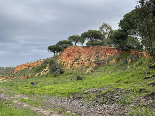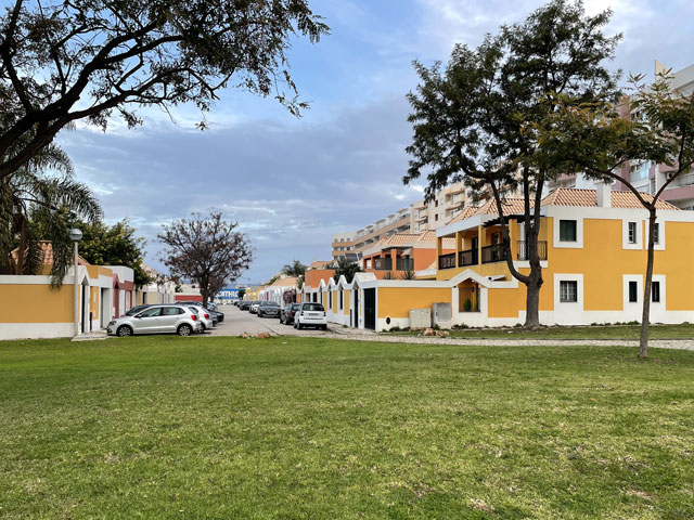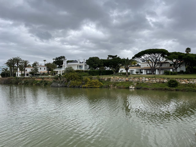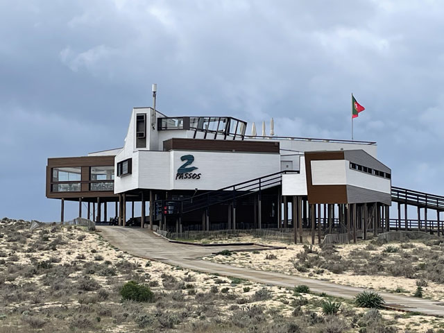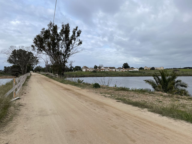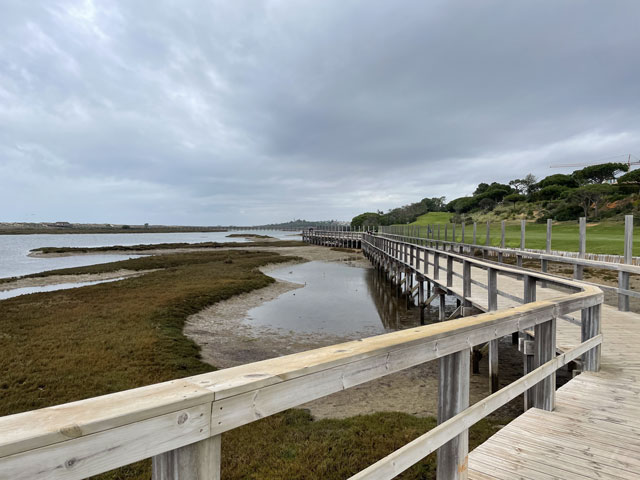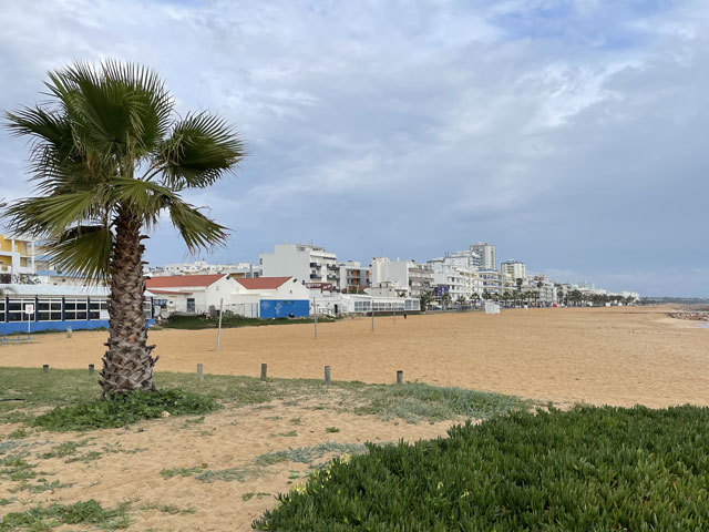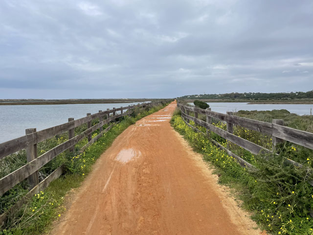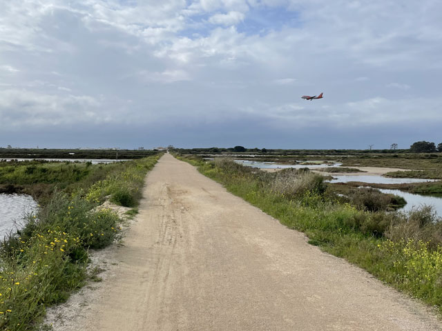 Ich bin auf kürzestem Wege, vorbei an einem großen Einkaufscenter wieder auf die Straße, die ich gestern gekommen bin. Aber nach Überquerung der beiden Flüsse bin ich nicht nach links zum Flughafen abgebogen, sondern geradeaus in die Urbanisation gelaufen, die zur Gemeinde Montenegro gehört. Zu meiner Überraschung bin ich da in unscheinbaren Straßen auf verschiedene Geschäfte und Gaststätten gestoßen. Die hatte ich an der Hauptstraße erwartet, die sich durch den Ort zieht. Aber das war eine richtige Schnellstraße ohne Fußweg, die man auch nicht so einfach überqueren konnte. Ich bin also wieder zurück in die Siedlung und habe eine Straße genommen, die auf eine Fußgängerbrücke über die Schnellstraße stößt, hinter der es in der beabsichtigten Richtung weitergeht. Etwa 500 Meter hinter der Brücke mündet die Straße in einem Kreisverkehr und taucht dahinter in einen lichten Pinienwald ein. Nach einer langen Doppelkurve führt die Straße, die inzwischen zu einem je nach Wetter staubigen oder schlammigen Fahrweg mutiert ist, aus dem Wald heraus und in ein nur spärlich bewachsenes Flussdelta hinein. Das ist der Naturpark „Ria Formosa“. Links breiten sich die Salinen aus, die ich gestern vom Flugzeug aus fotografiert habe, und rechts ziehen sich kleine Wasserläufe zwischen den meist nur knie- oder hüfthohen Sträuchern hin. Unmengen an Störchen, die ihre Nester in eine Gruppe Eukalyptusbäume gebaut haben, stelzen da durchs Wasser und sorgen für ordentlichen Bio-Lärm. Die größtenteils ausgetrockneten Salinenbecken sahen eigentlich nicht so aus, als ob man da Salz zusammenkratzen könnte, aber zwei große Salzhaufen mittendrin bewiesen das Gegenteil. Der Weg, der eigentlich weiter geradeaus führen sollte, war leider auf der Höhe der Salzhaufen gesperrt und mit „Betreten verboten“-Schildern versehen. Da Hundegebell zu hören war, habe ich die Schilder ausnahmsweise mal ernst genommen und den links abbiegenden, direkt zum Meer führenden Weg zwischen den Becken der Saline genommen. In ziemlich dichtem Abstand sind da Flugzeuge von rechts kommend über meinen Kopf hinweg auf die bis an die Salzbecken heranreichende Landebahn zu geflogen. Ich habe gestaunt, was der kleine Flughafen so verkraftet. Gegen 9 Uhr sind mehrere Flugzeuge im 5-Minuten-Abstand gelandet und in den Lücken dazwischen sind immer welche gestartet. Der von mir eingeschlagene Weg führte auf eine Gruppe Hotelbauten zu, aber ohne diese zu erreichen. Die stehen nämlich auf der langen Sandbank, welche die Lagune vor der Stadt und dem Flughafen vom Meer trennt. Am westlichen Ende des Flughafens führt eine Brücke rüber zur Sandbank. Mein Weg endet an der Lagune und stößt dort auf einen parallel zum Wasser verlaufenden Fußweg, der mit Geländer und vereinzelten Bänken versehen, aber leider an manchen Stellen etwas schlammig ist. Ansonsten läuft es sich da aber schön. Linker Hand ist die Lagune und dahinter verläuft die nunmehr unbebaute „Sandbank“ mit einer etwa fünf Meter hohen Düne. Rechts ziehen sich wieder unzählige Wasserläufe durch spärlich bewachsenes Gelände und dahinter sind, etwas höher gelegen, schicke Villen und Hotels sowie diverse, von Pinien eingerahmte Golfplätze zu sehen. Etwa da, wo der über den sumpfigen Grund führende Weg aufs „Festland“ stößt, geht es auf einem Holzweg auf Stelzen weiter. Der ist etwa drei Meter breit, beidseits mit Geländer und in Golfplatznähe mit einem mannshohen Netz versehen. Auf diesem Holzweg geht es um kleine Lagunen herum, manchmal auch mittendurch. Da macht es Spaß zu laufen und trotz des trüben Wetters haben das viele genutzt. Bei den Leuten, die einem da begegnen, handelt es sich überwiegend um Engländer, aber hin und wieder waren auch mal deutsche Stimmen zu hören. Ab da, wo die Lagune endet, also „Sandbank“ und Festland aufeinander treffen, führt der Holzweg durch die Dünen. Oben auf den Dünen stehen einige Gaststätten, natürlich auch auf Stelzen wie die dort hin führenden Wege. Irgendwann ist aber Schluss mit dieser luxuriösen Wegeführung. An einem großen Parkplatz muss man sich entscheiden, ob man sich einen Weg durchs Hinterland sucht, oder runter an den Strand wechselt. Ich habe Letzteres gemacht und es nicht bereut. Der Strand ist hier durchgängig mindestens fünfzig, an flachen Stellen auch über hundert Meter breit. Es ist schöner, feiner, heller Strand, auf dem man dicht am Wasser auch prima laufen kann. An manchen Stellen gibt es etwas Steilküste. Nicht sehr hoch, vielleicht 10 Meter, aber mit tollen Farben von Gelb über Ocker bis Tiefrot. Den ganzen Vormittag war es schon bewölkt, aber mittags zogen sich die Wolken richtig dicht und dunkel zusammen. Für 13 Uhr war Regen angesagt und etwa zu dieser Zeit fing es auch wirklich an zu nieseln. Aber es war nur so viel, dass ich es bis zu meinem Tagesziel Quarteira geschafft habe, ohne mein Regencape rausholen zu müssen. In der Stadt angekommen, wurde der Regen zwar etwas stärker, aber hier konnte man sich ja unterstellen oder mal in ein Geschäft flüchten. Meine Herberge machte erst um drei auf, aber ein paar Minuten eher bin ich doch schon reingekommen. Ich bin hier angenehm überrascht worden, da alles sehr ordentlich und geschmackvoll eingerichtet ist. Ich bin mit einem anderen Herrn in einem 6-Mann-Zimmer, Bad und WC gleich gegenüber. Erstmals habe ich hier ein Gepäckfach unterm Bett, das mit einem elektronischen Schloss versehen ist, welches die Key-Card akzeptiert, mit der man ins Haus und ins Zimmer kommt. Toll, sonst muss man sich immer einen Schlüssel besorgen oder ein Vorhängeschloss ausleihen, wenn überhaupt eine Möglichkeit zum Abschließen besteht. Die Küche ist sehr gut ausgestattet und hat mich schon zu einem selbst gefertigten Omelett verleitet. Ein zweites wird es als Frühstück geben, ich kann ja keine Reste durch die Gegend schleppen. In einer Regenpause habe ich mal eine Runde durch den Ort gedreht, die