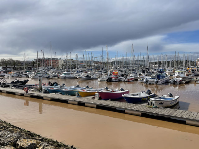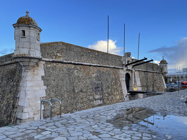 Mit anderen Worten: es hat mit einigen Unterbrechungen den ganzen Tag geregnet. Schon in der Nacht war fast dauerhaftes Trommeln auf den Autodächern vorm Haus zu hören. Aber das Wetter hat sich an die Vorhersage gehalten. Als ich aus dem Bett bin, habe ich gesehen, dass für 8 Uhr nur Wind, aber kein Regen angekündigt war. Da habe ich mich beeilt, um diese Pause nutzen. Und die Vorhersage stimmte auf den Punkt: von fünf vor bis fünf nach acht kam nichts runter. Dummerweise habe ich die Tür ins Schloss fallen lassen, als ich fünf nach acht aus dem Hostel getreten bin. Zum Glück gab es da aber einen überdachten Hauseingang, wo ich in aller Ruhe das Anlegen des neuen Regenponchos üben konnte. Da muss nämlich jeder Griff sitzen. Während bei uns üblicherweise der Regen langsam anfängt und dann stärker wird, geht es hier meist auf einen Schlag los. So, als ob jemand einen Eimer auskippt. Da schafft man es kaum, den Rucksack abzusetzen und den Poncho rauszuholen. Eh man den angezogen hat, ist man schon mal nass. Ich hatte heute nur eine kurze Strecke vor mir. Da ich in Portimão am westlichen Stadtrand genächtigt habe, waren es bis Lagos auf direktem Wege nur 17 Kilometer. Da hätte ich mich gut noch eine Weile im Bett räkeln können. Aber nun war ich einmal draußen, da musste ich auch los. Der Routenplaner hat fast für die ganze Strecke die Straße vorgeschlagen. Das war aber überwiegend die ziemlich stark befahrene EN 125, auf der es keinen Spaß macht zu laufen, obwohl es dort eine WhatsApp-Spur gibt, also eine Spur, in welche jene Autofahrer langsam einschwenken, die unbedingt bei der Fahrt Telefonieren, WhatsApps schreiben oder Lieferscheine sortieren müssen. In dieser Spur standen aber viele Pfützen und man musste immer eine Lücke in der Fahrzeugkolonne abwarten, um diese umrunden zu können. Bei der nächstbesten Gelegenheit bin ich deshalb nach rechts (Norden) runter von der Fernstraße und auf einem Umweg über Figueira und Mexilhoeira Grande gelaufen. Weitere Umgehungsmöglichkeiten gab es nördlich der Fernstraße nur auf fragwürdigen Feldwegen, weshalb ich wieder reumütig zurück an den Fahrbahnrand bin. Nach links, in Richtung Meer, gab es bis Odiáxere gar keine Ausweichmöglichkeiten, weil sich da ein sumpfiges Flussdelta mit Salinen mittendrin ausbreitet. Für Vögel, insbesondere Störche, ist das im wahrsten Sinne des Wortes ein gefundenes Fressen. Auf einem Grundstück standen dicht bei dicht Bäume, die auf etwa vier Meter Höhe gekappt und mit einem Nest versehen waren, manche keine 20 Meter von der Straße entfernt. Und alle Nester waren belegt. Der Straßenverkehr scheint die Tiere gar nicht zu stören, aber wenn man zu Fuß in gleicher Entfernung vorbeikommt, dann fliegen die sonst seelenruhig auf der Erde pickenden Störche ganz aufgeregt davon. Die Störche oben in den Nestern lassen sich auch von einem Fußgänger nicht stören. In Odiáxere ergab sich die zwingende Notwendigkeit, einzukehren, da es wieder stärker regnete. Zum Glück gibt es hier in den kleinsten Orten eine unglaubliche Kneipendichte, so dass man in bewohnten Gegenden nicht im „Regen stehen gelassen“ wird. Aber bei so viel Regen muss man schon aufpassen, dass die Leber mitmacht. Von Odiáxere kommt man auf einer nur wenig befahrenen, kleinen Straße ans Meer - vorbei an Golfplätzen und Nobel-Villen, von denen gerade Unmengen hochgezogen werden. Die Gegend ist auch wirklich ganz nett: sehr grün und zum Meer hin abfallend, so dass man auch in größerer Entfernung noch Meeresblick hat, sofern man kein Haus vor die Terrasse gesetzt bekommt. Am Ufer zieht sich fast schnurgerade ein breiter, von Dünen begrenzter Strand hin. In den Dünen stehen wie schon gehabt diverse Restaurants, die durch Holzstege mit dem Strand und mit einem sich die ganze Düne entlangziehenden Holzweg verbunden sind. Parallel zur Düne verläuft eine Regionalbahnlinie, dahinter eine Straße, die auf der anderen Seite mit teilweise recht noblen Hotels bebaut ist. Der Wind, der heute neben dem Regen wetterbestimmend war, hat für ordentlichen Wellengang gesorgt. Das hat viele Surfer und Wellenreiter angelockt. Auf den letzten paar hundert Metern vor der Stadt war ein regelrechtes Gedrängel auf und in den Wellen. Hier kann man nämlich gleich hinter der Düne gut und kostenlos parken und ist mit seinem Brett schnell am Wasser. Heute, am Sonnabend, sind offenbar viele der Wellen wegen an den Strand gefahren. Aber einige Wellenreiter, darunter auch Deutsche, sahen aus, als ob sie überhaupt nichts anderes machen. Und ganze Familien mit Neoprenanzug und Surfbrett habe ich gesehen. Ein für mich neues Detail ist mir hier aufgefallen. Einige Autos hatten an der Anhängerkupplung oder an einer anderen sicheren Stelle eine Schlüsselbox zu hängen. Clever: man lässt alles im Auto, schließt ab und packt den Schlüssel in die Box. Da muss man (außer dem Zahlencode) nichts mit aufs Brett nehmen oder am Strand ablegen. Lagos wird durch einen Fluss, die Ribeira de Bensafrim, in zwei Teile geteilt. Die eigentliche Stadt liegt westlich davon, also am anderen Ufer. Auf der Ostseite des Flusses, wo ich angekommen bin, sind eigentlich nur Hafenbecken mit den zugehörigen Serviceeinrichtungen, Gaststätten und der Bahnhof. Um rüber in die Altstadt zu kommen, muss man ein ganzes Stück landeinwärts und um ein Hafenbecken herum bis zu einer Fußgängerbrücke laufen. Auf den ersten Blick hat Lagos nicht viel zu bieten. Was anderswo die Strandpromenade ist, ist hier die Promenade entlang des Flussufers. Die ist wie die Seiten- und Nebenstraßen mit vielen Gaststätten und Geschäften bestückt - so wie überall in den Küstenstädten. Aber hier gibt es wenigstens noch eine richtige Altstadt mit einigen Kirchen, einer noch ganz gut erhaltenen Stadtmauer und einer kleinen Festung kurz vor der Flussmündung. Mein Hostel ist so ziemlich mittendrin. Als ich nach der äußeren Inspektion der Stadtmauer wieder in Richtung Ze