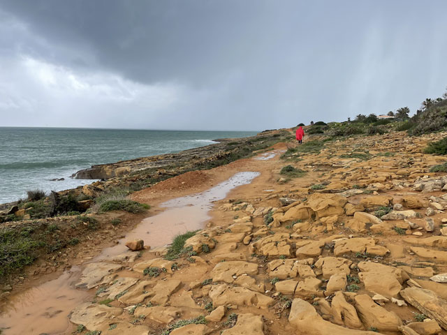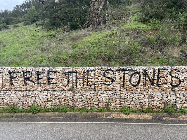 In Lagos beginnt er an der kleinen Festung am Fluss, gar nicht weit weg von meiner Unterkunft. Dort, am Stadtstrand geht es auch schon mit der Steilküste und einzelnen Felsen am Wasser los. Ein Holzweg auf Stelzen mit Geländer führt oben auf den Klippen entlang. Solche Wege führen auch zu einzelnen Aussichtspunkten, die so platziert sind, dass man gut in die Schluchten schauen kann, die das Wasser im Laufe der Zeit in die Küste gefressen hat. Auf einem solchen Weg geht es dann um einen Leuchtturm herum und noch ein ganzes Stück auf den Klippen entlang. Das muss alles ziemlich neu sein, denn der Fischerweg verläuft lt. Karte ein Stück landeinwärts entlang einer Straße. In einem Vorort von Lagos führt der Weg mal kurz von der Küstenlinie weg. Dann geht es so weiter, wie ich es vor zwei Tagen schon mal hatte. Man sucht sich oben auf den Klippen einen der vielen Wege - je nach Geschmack ganz vorn an der Kante (was in der Regel der Fischerweg ist) oder in sicherer Entfernung, ein paar Meter weiter landeinwärts. Da entgeht einem aber der Blick auf die tollen, von Wellen umspülten Felsen im Wasser. Die Felsformationen waren zwar bei weitem nicht so spektakulär wie auf dem „Weg der sieben hängenden Täler“, aber auch sehr eindrucksvoll. Und da heute wieder ordentlich Wellengang war, konnte man sich erneut daran erfreuen, dass die Wellen beim Auftreffen auf den Felsen weit nach oben schlagen und geräuschvoll zerstieben. Die Steilküste hat hier keine konstante Höhe. Auf dem Stück nach Luz werden die Felsen immer höher und stets geht der Weg vorn an der Kante entlang, etwa auf den höchst möglichen Punkten. Das ist aus der Ferne und natürlich vor Ort sehr eindrucksvoll, aber auch recht anstrengend, da der „Weg“ immer nur eine Schneise im Gestrüpp mit felsigem Boden ist. Der Unterschied zu dem Gehabten ist der blau/grüne Doppelstrich, der sich auf Felsbrocken am und im Weg findet. Wenn man die vermutlich höchste Stelle des ganzen Weges erreicht hat, bietet sich ein grandioser Blick auf Luz, eine nette kleine Stadt mit 3500 Einwohnern. Nachdem es gerade geschüttet hatte, lag die Stadt jetzt im Sonnenschein. Ein wundervoller Anblick. Um dort hin zu kommen, musste man aber am Ende der Steilküste einen ziemlich steilen, inzwischen matschigen Weg runtersteigen. Das war nicht wirklich erfreulich und erklärte die verbissenen Gesichter der Wandergruppe, die sich oben auf dem Felsen versammelt hatte. Die Leute waren alle ziemlich alt und hatten sich vermutlich für einen geruhsamen Sonntagsausflug und nicht für eine Abenteuertour angemeldet. Die waren teilweise mit dem Regenschirm im Hagelschauer da hoch gekrochen, wo man sich besser mit beiden Händen im Gestrüpp festhält. Ich habe einige deutsche Stimmen gehört, vielleicht war das auch eine deutsche Reisegruppe. Die haben für ihr Geld wirklich was geboten bekommen. In Luz angekommen, war es kurz nach elf. In der dortigen kleinen Kirche begann um halb zwölf ein englischer Gottesdienst und die Bankreihen waren schon ganz gut gefüllt. Ich habe es aber bei einem Blick in die Kirche bewenden lassen, weil ich doch schon gestern Abend in Lagos einen halben Gottesdienst mitgemacht habe - bis zur Predigt. Dann bin ich gegangen, um die anderen Besucher nicht mit meinem Schnarchen zu belästigen. Der Gottesdienst war im Übrigen sehr schön, weil da ein Chor zum Einsatz kam und es sich um sowas wie eine Firmung handelte, denn eine Gruppe von Kindern wurde vom Pfarrer an der Tür abgeholt, gesegnet und zu den vordersten Bankreihen geführt. In Luz zeigte sich der Himmel von seiner schönsten Seite und ich Trottel habe meinem Fresstrieb nachgegeben und mich für eine Kleinigkeit in ein ganz originelles Restaurant gesetzt. Dort saß bereits eine Familie, die ich schon unterwegs bewundert habe, denn die war mit vier Kindern und Rucksäcken unterwegs. Die Mutter mit zwei Kindern, etwa 10 und 14, lief schon in Lagos vor mir, später stieß der Mann mit etwa 6jährigen Zwillingen dazu. Die waren in Luz sicher noch nicht am Ziel. So löblich ich das Familien-Wandern finde, im Restaurant musste ich auf meine „Loaded Chips“ (Fritten mit Speck und Käse überbacken) lange warten, weil deren Gerichte den Koch voll ausgelastet haben. Als ich nach einer halben Stunde endlich rauskam, war der Himmel schon wieder finster. und es dauerte gar nicht lange, bis erneut ein Hagelschauer herunterkam - mit Körnern, die gar nicht groß waren, aber auf dem Körper ordentlich wehtaten. Ich musste mich letztlich hinter einem großen Strauch verstecken, um Wind und Hagel etwas zu mildern. Da hatte sich auch schon eine Deutsche mit ihrem etwa 8jährigen Sohn versteckt. Dem war bestimmt eine Abenteuertour versprochen worden - die hat er bekommen. Nach diesem zweiten Hagelschauer standen alle Wege unter Wasser und der Boden zwischen den Pfützen war so aufgeweicht und glitschig, dass da kaum ein Vorwärtskommen möglich war. Nachdem ich hinter Burgau wiederholt im Schlamm weggerutscht bin, habe ich kehrtgemacht und bin zurück bis zu einem Weg, der in eine Siedlung und dort auf eine richtige Straße führt. Diese führte in großen Bögen um einen Berg und dann um eine große sumpfige Wiese an der Mündung der Ribeira de Vale Barão herum. Da hat man mit großem Aufwand den Berghang auf mehreren hundert Metern mit Metallkäfigen voll Steinen abgestützt. Darauf hat jemand „Free the Stones“, also so viel wie „Befreit die Steine“ gesprüht. Das ist zwar unschön wie jede Schmiererei an Wänden, aber wenigstens witzig. Hinter der sumpfigen Wiese bin ich nicht wieder auf die Steilküste, sondern auf einer abzweigenden Straße in Richtung Budens gelaufen und kurz vor diesem Ort nach links auf die Fernstraße N 125 gewechselt. Auf beiden Straßen lief es sich ganz gut. Kurz vor Figueira, das es hier mehrfach gibt, ging es wieder runter von der Fernstraße und lange Zeit auf einer schmalen Straße bergauf und bergab, was ich so nicht erwartet hatte 