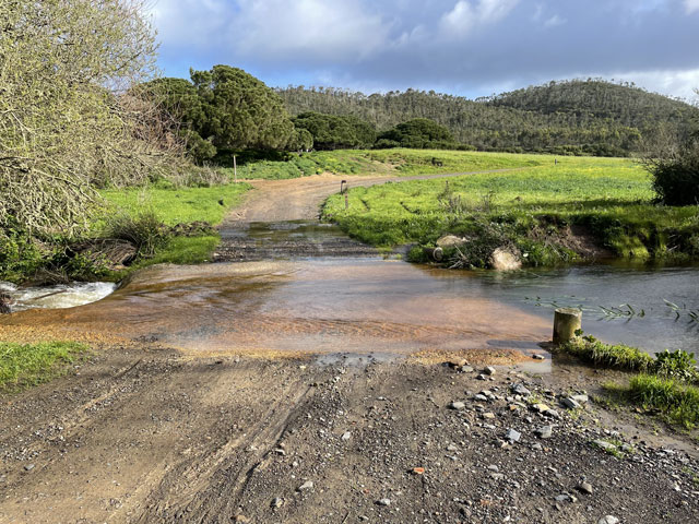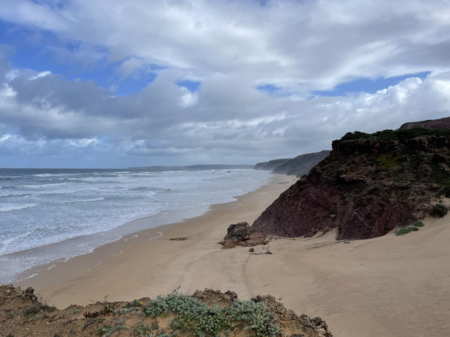Im Hostel in Carrapateira waren unter den etwa zehn Gästen allein fünf Frauen, die den Fischerweg in der gleichen Richtung laufen wie ich, darunter vier deutsche. Da haben wir am Abend natürlich darüber geredet, was wir schon erlebt haben und was uns noch bevorsteht. Letzteres klang nicht so gut, denn die Frauen hatten von Entgegenkommenden erfahren, dass es auf der heutigen Etappe zwei kaum passierbare Stellen gibt - eine nahe Carrapateira und die andere kurz vor Arrifana. Da sind jeweils Bäche zu durchqueren, die angeblich hüfthoch Wasser führen. Zwei Damen aus Karlsruhe, die gestern schon des Wetters wegen mit dem Bus gefahren sind und heute der Problemstellen wegen mit dem Taxi nach Aljezur wollten, hatten sich gestern noch die Stelle bei Carrapateira angeschaut und Bilder gezeigt. Da hatte sich wirklich der Bach einen Weg über den Strand gebahnt und die Wellen haben versucht, durch dieses Bachbett weiter landeinwärts zu kommen. Die Damen konnten aber schwer schätzen, wie tief der Bachlauf ist. Hüfttief erschien er mir nicht, aber wenn sich die Stelle umgehen lässt, dann wollte ich das tun. Da auf der Karte in diesem Bereich noch eine Alternative des Fischerweges eingezeichnet ist, scheint es doch öfter mal vorzukommen, dass der „richtige“ Weg nicht oder nur schwer passierbar ist. Hier habe ich mich schnell für die Alternative entschieden, die erst ein Stück entlang der Straße führt, dann abbiegt, einen Bach überquert, in einem großen Bogen zurück führt und am Strand auf den „richtigen“ Weg stößt.