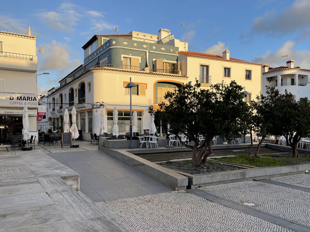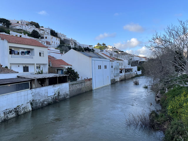 Die zweite Problemstelle war für mich nicht wirklich relevant, da ich nicht unbedingt nach Arrifana musste. Da hatte ich ursprünglich was gebucht, aber dann doch lieber ein Bett in Aljezur genommen, damit die folgende Etappe nicht übermäßig lang wird. Da meine Sachen, die ich gestern Abend gewaschen hatte, noch nicht trocken waren, habe ich diese sorgfältig um meinen Rucksack platziert - die Hose mit zwei kleinen Karabinerhaken an Ösen festgemacht und den Kleinkram (Socken, Schlüppis und ein T-Shirt) im Waschsack am Rucksack angehängt. Das sah aufregend aus, hat aber funktioniert. Zumindest die Hose war ziemlich schnell trocken. Zum Glück blieb es nach einem Regenguss am Morgen, den ich noch im Hostel abgewartet habe, den ganzen Tag weitestgehend trocken. Nur gelegentlich kam mal etwas runter, was ich normalerweise ignoriert hätte, aber der zu trocknenden Wäsche wegen habe ich bei jedem Tropfen der fiel, gleich den Regenponcho übergestülpt. Ich habe wie geplant am Anfang der Tour die alternative Variante gewählt und dabei gelernt, dass nicht alles, was auf der Karte wie eine Brücke aussieht, auch wirklich eine Brücke ist. Es kann auch eine Furt sein. Eine solche fand ich vor, als ich zu der Stelle kam, wo der alternative Weg über den Bach führt. Das Wasser stand da etwa 20 Zentimeter hoch und war so breit, dass da nichts mit Hüpfen war. Also habe ich mir Schuhe und Strümpfe ausgezogen und bin da durch. Als ich am Strand angekommen war, begegnete mir eine junge Frau, die den „richtigen“ Weg genommen hat. Die erzählte, dass der Bach am Strand keinesfalls hüfttief war, sondern auch nur bis zur Wade reichte. Den Umweg hätte ich mir also sparen können, aber verpasst habe ich auch nichts, denn den Strand habe ich auch noch zu sehen bekommen. Außerdem bin ich durch einen Pinienwald gekommen, in dem es in jüngster Zeit gebrannt haben muss. Das sah ziemlich gespenstig aus. Ab dem Zusammentreffen der Wege ging es stets bergauf, immer ziemlich dicht an der Kante der sich langsam aufbauenden Steilküste. Unten war ordentlicher Wellengang und es war toll anzusehen, wie 4…5 schäumende Wellenkronen hintereinander auf die Felsen zuliefen. Nach einer Weile führt der Weg aber weg von der Küste, hoch auf eine Anhöhe, von der man einen tollen Rundumblick hat. Ein Stück weiter stößt der Europa-Radweg EV1 (hier „Atlantic Coast Route“ genannt) dazu und ab dieser Stelle geht es auf halbwegs glattem Weg mit nur moderaten Höhenunterschieden weiter. Bei Monte Novo, dem einzigen kleinen Dörfchen an der Strecke, macht die Straße mit dem Radweg zwei Bögen, während der Fischerweg eine Abkürzung nimmt. Dieser bin ich dummerweise gefolgt und an eine den ganzen Weg einnehmende Pfütze gelangt. Das Blödeste, was man in einem solchen Fall machen kann, ist der Versuch, die Pfütze auf dem angrenzenden Acker zu umgehen. Schon beim ersten Schritt war ich bis über den Knöchel im aufgeweichten Boden versunken. Anschließend bin ich freiwillig in die Pfütze, um den Schlamm am Schuh wieder loszuwerden. Etwa zwei Kilometer weiter trennen sich Rad- und Fischerweg wieder. Letzterer biegt nach links ab und führt wieder zum Meer, auf die zweite schwer passierende Stelle zu, um dahinter wieder vom Meer wegzuführen. Viel bekommt man da vermutlich nicht vom Meer und von der Steilküste zu sehen. Ich hätte unter normalen Umständen trotzdem diesen Weg genommen, um nach Aljezur zu kommen. Aber zwei mir entgegenkommende deutsche Frauen erzählten, dass das Wasser dort nicht nur hüfthoch steht, sondern dass es ihnen beim Überqueren bis zur Brust stand. Das fiel für mich schlichtweg aus. Also bin ich auf dem „Euro Velo“-Radweg geblieben und auf diesem ziemlich gerade nach Aljezur gelaufen. Recht unerwartet gab es da auf halber Strecke eine Ferienunterkunft mit einer Gaststätte. Der junge Wirt war zwar etwas mürrisch und auf dem Nachbartisch saß eine Katze, aber ich bin trotzdem geblieben und habe mir ein Toastbrot als Stärkung für die letzten Kilometer machen lassen. Kurz vor dem Ziel ging es nochmal ein Stück entlang der Straße, was etwas unangenehm war. Am Abzweig nach Aljezur konnte ich zwischen zwei Varianten wählen: entweder steil bergab direkt in die Stadt, oder auf gleicher Höhe bleibend zur Burg und hinter dieser bergab. Da ich sicher nach dem Einchecken keine Lust gehabt hätte, nochmal hoch zur Burg zu laufen, habe ich diese jetzt gleich „mitgenommen“. Allerdings war es ein Trugschluss zu glauben, dass man diese leicht erreicht, wenn sie auf Augenhöhe ist. So wie es sich für eine Burg gehört, steht sie nämlich auf einem Hügel und man muss erstmal ein ganzes Stück bergab und dann schweißtreibend wieder hoch. Viel ist allerdings von der Burg nicht übrig, die im 10. Jahrhundert von den Mauren gebaut wurde und als letzte Burg der Algarve im Jahr 1249 von den Christen erobert wurde. Unter anderem hat das Erdbeben von 1755 ordentlichen Schaden angerichtet. Von da oben hat man aber einen schönen Blick. Unterhalb der Burg stehen alte Häuser, ganz unten an der Brücke ist mein „Amazigh Hostel“ und auf der anderen Seite des Flusses breitet sich ein etwas neuerer Stadtteil aus. Mittendrin ein großer, optisch gar nicht in die weiße Bebauung passender Intermarché. Im Hostel waren wieder einige Wanderer, darunter drei etwa 50jährige deutsche Frauen mit ihren etwa 20jährigen Söhnen. Ob die sich erst hier kennengelernt, oder zum gemeinsamen Wandern verabredet hatten, weiß ich nicht. Im geräumigen Aufenthaltsraum saßen abends die Mütter schwatzend in einer Ecke und die Söhne in einer anderen. |