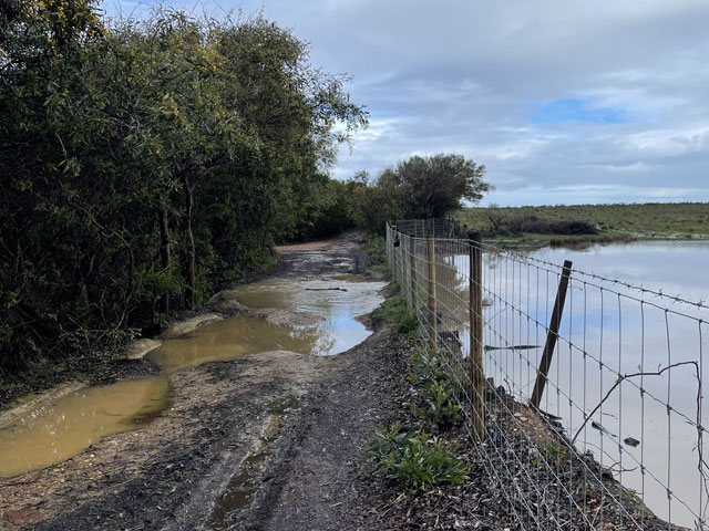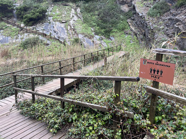 Heute bin ich wieder viel später aufgewacht, als gewollt. Ganz ohne Wecker geht es offenbar doch nicht. Als ich los wollte, regnete es. Da habe mir noch einen Kaffee gemacht. Kaum hatte der Regen aufgehört und ich war draußen auf der Straße, fing es schon wieder an. Und dieses Mal war es ein nicht übermäßig heftiger, aber ein lang anhaltender Landregen. Zum Glück führte der Fischerweg nach einer kurzen Runde auf einem Kap lange Zeit auf einem separaten Fußweg entlang einer Straße. Da kam ich trotz Regen gut voran. In den Taxis, die an mir vorbei fuhren, saßen bestimmt einige Wanderer, die in der gleichen Richtung unterwegs waren, denn gesehen habe ich von denen den ganzen Tag über niemand. Am besagten Fußweg waren alle paar hundert Meter Rastplätze auf Planken angelegt, alle mit Bänken und manche sogar mit etwas Überdachung und mit Sportgeräten. Das alles hat mir leider heute im Regen nichts genützt. Dann führte der Weg mal an die Klippen, wo sich schaurig-schöne Blicke in die Tiefe boten, dann ging es wieder ein Stück weg von der Kante, dafür auf einem Weg, auf dem die Pfützen in voller Breite standen. Von den angrenzenden Feldern floss zudem das Wasser über den Weg, um ein paar Meter weiter als kleiner Wasserfall in die Tiefe zu stürzen. Bei den breiten Pfützen macht es wenig Sinn, sich im dornigen Gestrüpp eine Umgehung zu suchen oder am glitschigen Rand der Pfütze zu balancieren und einen Sturz samt Smartphone in die Pfütze zu riskieren. Am besten ist es, einfach durchzulaufen. So habe ich auf dem relativ kurzen Wegstück bestimmt ein Dutzend Pfützen und Bäche durchquert. Irgendwann merkt man das gar nicht mehr und bei dem heftigen Wind trocknet zumindest die Hose ganz schnell. Es ist ja zum Glück Regen- und kein eisiges Schmelzwasser. So ging es etwa bis Cavaleiro - sehr feucht, aber ansonsten nicht übermäßig anspruchsvoll. Das änderte sich dahinter. Da ging es wieder ausschließlich auf Sand durch eine Dünenlandschaft, wo zwar nur wenige Pfützen standen, dafür aber eine spektakuläre Wegführung geboten wurde. An manchen Stellen führte der ausgeschilderte Weg auf weichem Sand wieder bis ganz dicht an die Kante heran. Das ist so schon gruselig, aber wenn man vorher gesehen hat, dass da oben die Felsen überstehen und man praktisch auf einem Balkon läuft, kann einem schon komisch werden. Und wenn man dann bei der Passage auch noch nach unten schaut, wo die schäumenden Wellen gegen den Felsen klatschen, dann kann man nur hoffen, dass der obere Magenverschluss richtig funktioniert. Ich muss gestehen, dass ich mir an einer Stelle, wo der etwa 50 cm breite und noch dazu abschüssige Sandweg genau an der Kante des etwa 30 Meter hohen Felsens verlief, einen alternativen Weg ein paar Meter weiter landeinwärts gesucht habe. Den Fußspuren zufolge haben das vor mir auch andere Weicheier gemacht. Da die entgegenkommenden Wanderer, von denen ich bis Almograve 66 gezählt habe, alle trockene Hosen und Schuhe hatten, war klar, dass ich bezüglich Wasser das Gröbste hinter mir hatte. Amüsiert habe ich mich über jene, die über den Schuhen Gamaschen trugen. Die sind bei Regen hilfreich, weil sie verhindern, dass das Wasser von oben in die Schuhe läuft. Aber ob die auch in einer 20 cm tiefen Pfütze Schutz bieten? In Almograve hatte ich gerade mal 19 km hinter mir - da war es nach 14 Uhr. Damit stand fest, dass ich den Rest des Weges bis Vila Nova de Milfontes, ca. 13 km, nicht auch noch auf dem Küstenweg zurücklegen kann. Der Routenplaner sagte mir, dass ich selbst auf der kürzesten Strecke noch über vier Stunden vor mir habe, also Ankunft kurz vor Sonnenuntergang. Ich bin folglich einer der vom Kartenprogramm vorgeschlagenen Routen gefolgt: zunächst auf Feldwegen, unter anderem entlang des Wanderweges „PR1ODM“, was wahrscheinlich „Portugiesischer Wanderweg 1 in Odemira“ heißt. Der führte halbwegs trocken durch landwirtschaftlich genutzte Flächen. Da es inzwischen aufgehört hatte zu regnen und der Wind im Hinterland nicht ganz so heftig blies, lief sich das ganz gut. Lediglich in den kleinen Wäldchen wurde man durch umgestürzte Bäume am schnellen Laufen gehindert. Auf der vom Routenplaner vorgeschlagenen Stelle bin ich dann vom Feldweg weg zur Fernstraße EN 393, die nach Vila Nova de Milfontes führt. Da lief es sich zwar bei dem regen Verkehr wegen fehlender Randstreifen nicht gut, aber ich kam voran. An einem Abzweig habe ich überlegt, ob ich nicht doch nach links in Richtung Meer abbiege und das letzte Stück auf dem Fischerweg laufe. Das hätte nicht viel länger gedauert, wäre aber mit einem Abstieg zum Strand und einem Aufstieg zurück aufs Straßenniveau verbunden gewesen. Ich war noch gar nicht fertig mit Überlegen, da habe ich gesehen, dass die Fernstraße ab besagtem Abzweig eine breite Standspur hat, auf der sich wunderbar laufen lässt. Da habe ich mir den Abstecher gespart, bin auf der Straße geblieben, habe auf einer hohen Brücke den Rio Mira überquert und war so noch vor dem Sonnenuntergang in meinem Zielort, Vila Nova de Milfontes. Das „Pirata Milfontes Guest House“ war Dank der zugesandten Instruktionen schnell gefunden und die Schlüsselbox hat nach Eingabe des mitgeteilten Codes den Schlüssel zum Haus und zum Zimmer rausgerückt. Der Name der Unterkunft hat übrigens nichts mit Seeräubern zu tun, sondern rührt daher, dass die Vermieterin Ina Pirata heißt. Ob deren Vorfahren vielleicht Seeräuber waren, weiß ich nicht. |