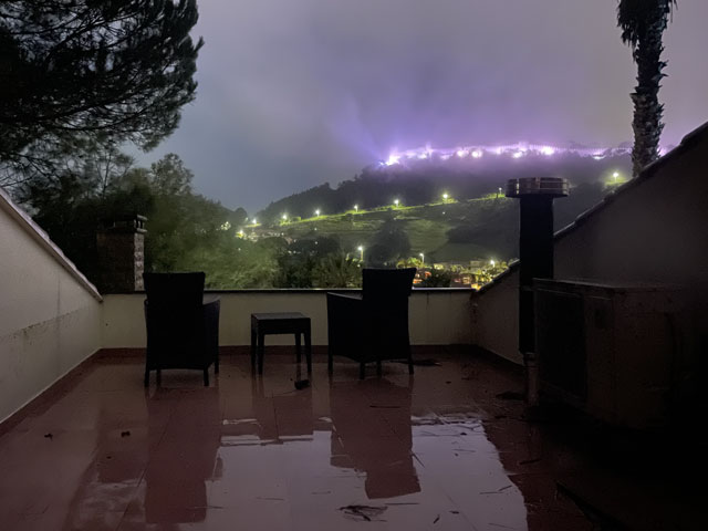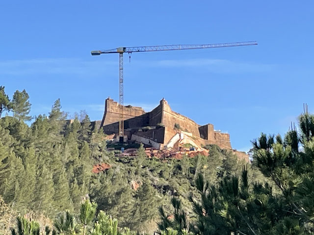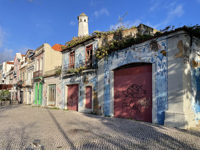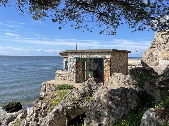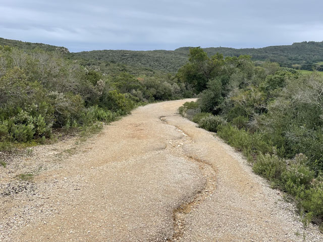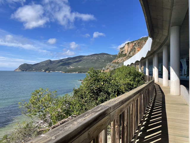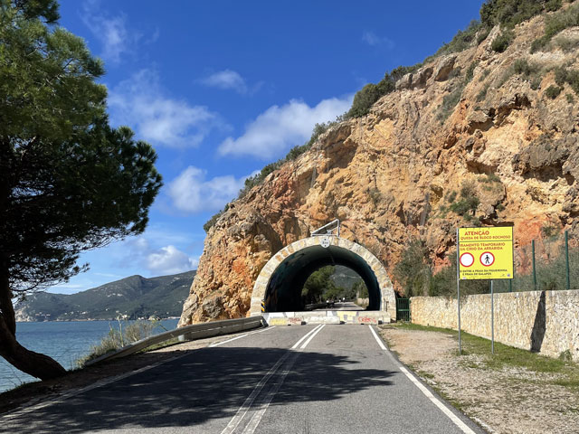 Da, wie schon gesagt, zwischen Sines und Setúbal zwei Übernachtungen weggefallen sind, hatte ich nun zwischen Setúbal und Almeda zwei Übernachtungen gut. Statt an einem Tag quer über die Halbinsel zwischen den Flüssen Sado und Tejo zu laufen, habe ich mich entschlossen, in drei Tagen soweit es geht an der Küste entlang zu wandern. Für heute hatte ich mir den Küstenabschnitt von Setúbal nach Sesimbra vorgenommen, morgen will ich zum Cabo Espichel und zum Übernachten nach Alfarim, was gar nicht weit von Sesimbra entfernt ist. Übermorgen geht es dann von dort nach Almeda (gegenüber von Lissabon, auf der anderen Seite des Tejo), wo ich mich in der Jugendherberge nahe der weithin sichtbaren Christus-Statue einquartiert habe. Um noch ein bisschen variabel zu sein, hatte ich für die zwei Stationen nichts gebucht. In Sesimbra waren schon seit Tagen in der Pension „Lá em Cima“ fünf Zimmer frei, auch gestern Abend noch. Als ich dort heute früh buchen wollte, waren die plötzlich alle weg, einen Tag später aber wieder verfügbar. Ich glaube nicht, dass sich da über Nacht fünf Leute angemeldet haben. Vermutlich wollten die Vermieter mal einen Tag „blau“ machen und haben die Zimmer aus dem Angebot genommen, damit kein Gast die Ausflugspläne durchkreuzt. Da habe ich vor Schreck gleich in einer anderen Unterkunft im Ort gebucht, die leider etwas auswärts liegt. Da werde ich abends bestimmt nicht nochmal nach Sesimbra reinlaufen, sondern mir die Stadt morgen auf dem Weg zum Kap anschauen, wenn das Wetter nicht allzu übel ist. Von Setúbal bin ich zunächst auf der Avenida Luísa Todi und dann dicht am Wasser in Richtung Westen gelaufen, bis ich in einer umzäunten Sackgasse gelandet bin und ein ganzes Stück zurück musste. Es ging hier also nur auf der Straße weiter. Die führt zunächst hoch auf etwa 50 Meter, dann zwecks Überquerung eines kleinen Flüsschens runter fast bis auf Null und schließlich auf dieser Höhe vorbei an einem Campingplatz, einer Zementfabrik und einem Hospital nebst Leuchtturm in alten Festungsmauern zu einem schönen Strand mit Gaststätte und großem Parkplatz. Der war bei dem schönen Wetter, das vormittags herrschte, vor allem von Motorradfahrern gut besucht. Hier war auch für mich der richtige Platz für eine Pause. Die Schiffe, die nach Setúbal wollen, fahren hier ganz dicht am Strand vorbei, weil die Fahrrinne des Rio Sado, der hier in den Atlantik mündet, nah am diesseitigen Ufer liegt. Ein paar Meter hinter dem Parkplatz ist, wie weiter vorn schon angekündigt, die Straße komplett gesperrt, weil da wohl was an zwei kleinen Tunneln gemacht werden muss. Vermutlich sollen derweil auch keine Fußgänger durch, denn man hat die erste Tunneleinfahrt mit Betonblöcken versperrt, über die man mühsam rüber klettern muss. Ein paar hundert Meter weiter, nach dem nächsten Tunnel, kommt nochmal eine solche Barriere. Dahinter dürfen dann auch wieder Autos fahren. Der Lohn für die zweimalige Kletterei war eine vom Durchgangsverkehr befreite Straße. Es waren aber bei dem schönen Wetter trotzdem recht viele Autos in den Sackgassen unterwegs. Die Straße führt nun stetig bergauf, auf der rechten Seite begleitet von steil aufragenden Felsen, die an vielen Stellen mit Stahlnetzen gesichert sind. Eine schmale Straße, auf der auch ein Wanderweg (PR3STB) verläuft, führt dann irgendwann mal links runter zum Ufer, vorbei an ein paar Gaststätten und wieder hoch zu „meiner“ Straße. Ich habe mir das ganz nette Gebäudeensemble unten am Strand lieber von der Höhe aus angesehen, statt die bereits erklommenen Höhenmeter für einen kurzen Ausflug zum Wasser zu opfern. Auf der rechten Seite führt ein steiler, steiniger Wanderweg hoch zu einem Kloster (Convento de Nossa Senhora da Arrábida), das später mal kurz von der Straße aus zu sehen ist. Daneben stehen aufgereiht sechs kleine Kapellen im Wald am steilen Berghang. Von weitem sahen die aus wie Wachttürme einer Festungsmauer. Wer die besichtigen will, muss bergtauglich sein. Für mich fallen die also aus, denn ich hatte mit dem bisschen Anstieg der Straße schon ganz schön zu kämpfen. Die nun sehr kurvenreiche Straße wand sich immer weiter hoch, bis sie in 250 Meter Höhe in die Fernstraße mündet. Rechts geht es weiterhin steil nach oben, hier ist der höchste Berg (Alto da Pena) 400 Meter hoch. Aber auch links, dicht am Wasser, stehen nun Berge. Einer davon ist der Píncaro mit 381 Metern, der mich an den Affenfelsen von Gibraltar erinnert, weil er landseitig begrünt ist und etwa 45 Grad Neigung hat, aber zum Wasser hin steil abfällt. Bevor dieser Berg erreicht ist, biegt die Straße aber nach rechts ab. Das Kartenprogramm hat mir empfohlen, bald nach der Kurve links einen Feldweg zu nehmen, der auf halbwegs konstanter Höhe durch lichte Wälder zum Dörfchen Boeiro führt. Der Weg war an sich ganz gut und gegenüber der Straße eine deutliche Abkürzung, aber er stand voller Pfützen. Ich hatte keine Lust, mir die Füße nass zu machen und bin deshalb um jede Pfütze mühevoll herum getänzelt. Hätte ich gewusst, dass ich noch völlig durchweichen werde, wäre ich da einfach durchgelaufen. Da meine Getränkevorräte inzwischen aufgebraucht waren, bin ich in Boeiro in eine „Café“ genannte Kneipe und habe mir da eine Flasche köstlichen Schwarzbieres zusammen mit einem Glas aus dem Kühlschrank geholt. Das Glas habe ich aber gleich wieder zurückgestellt, weil mir das nicht ganz sauber schien. Der Wirt hat aber gedacht, es wäre mir nicht kalt genug, und hat mir aus seinem Tiefkühlschrank ein Glas geholt, wie ich es in Galicien lieben gelernt habe. Auf meine Frage nach einem Süppchen hat mich der Wirt an die Gaststätte an der Hauptstraße verwiesen. Aber auch da gab es keine Suppe und da die Wirtin mir nichts anderes aufschwatzen wollte, gab es vermutlich auch nichts anderes. Vermutlich war ich zu spät, denn draußen glimmte im Grill noch Kohle. Derweil hatte es angefange