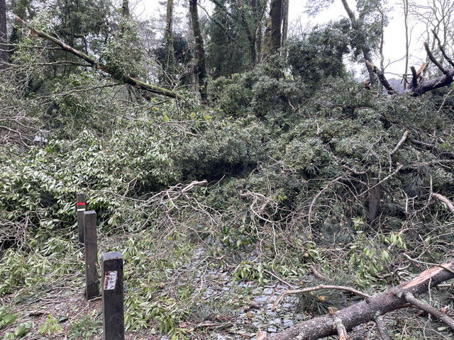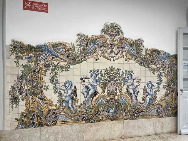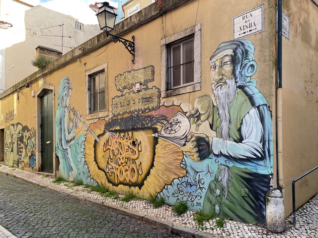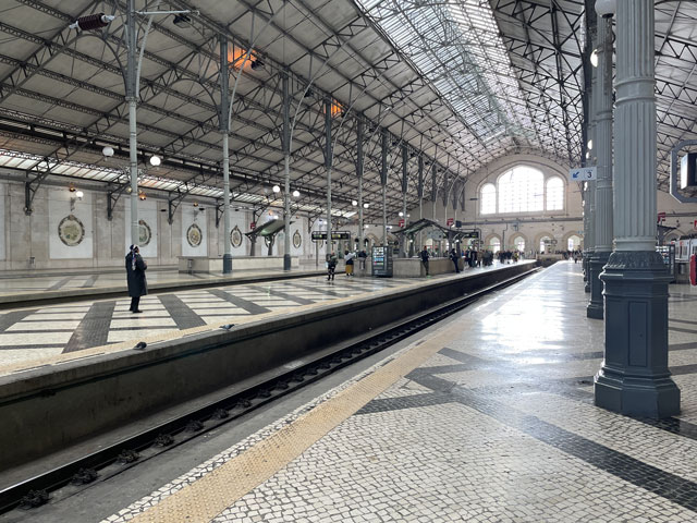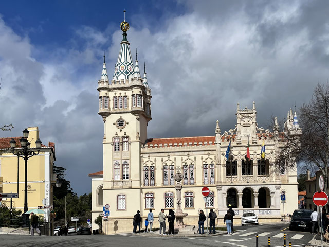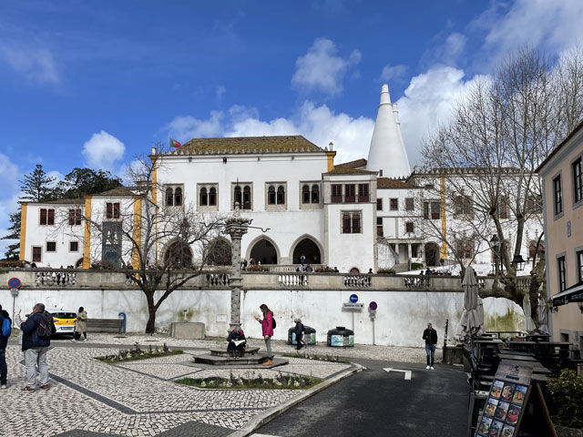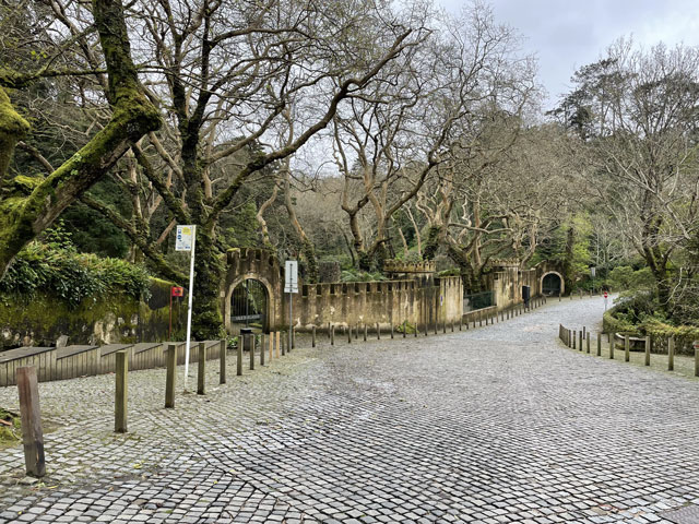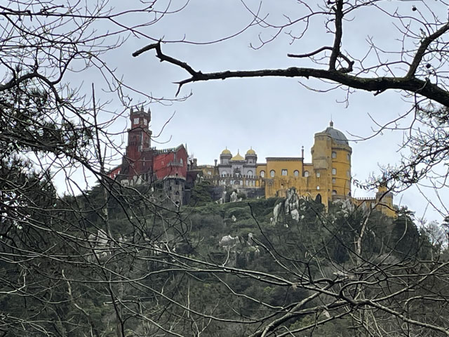 Morgens setzte dann irgendwann der Flugverkehr ein. Der Flughafen ist zwar am anderen Ende der Stadt, aber die Maschinen sind offenbar alle in Richtung Süd-West über unser Stadtviertel abgeflogen. Da ich fast mein ganzes Leben in einer Einflugschneise gewohnt habe, stört mich das nicht wirklich. Aber jetzt, da Tegel zu und der BER auf ist, und nur noch selten was über unser Dorf fliegt, fallen mir die Fluggeräusche plötzlich auf. Bei der Morgenprozedur im Waschraum flog auch gerade was über uns hinweg. Aber plötzlich waren da die aus Kriegsfilmen bekannten Stuka-Geräusche, die mich erschreckt haben. Dann habe ich jedoch mitbekommen, dass der junge Mann am Waschbecken neben mir nur eine monströse elektrische Zahnbürste in Betrieb gesetzt hat. Der Schreck hat gesessen. Apropos Waschbecken: Das sind hier wieder welche in dem Format, das kein Sockenwaschen zulässt, weil die Socken gar nicht in voller Länge reinpassen. Schlimmer ist eigentlich, dass man beim Waschen seine Sachen nirgendwo hinlegen oder anhängen kann. Auf dem schmalen, schrägen Ablagebrettchen kommt sogar eine konventionelle Zahnbürste ins Rollen. Das habe ich mir doch gedacht, dass ich auch bei diesem Quartier einen Makel finde. Nicht zu beanstanden war das Frühstück, das wieder Wurst, Käse und sehr guten Automatenkaffee in allen denkbaren Varianten zu bieten hatte. Sogar Gurke und Tomaten gab es und die Liebhaber süßer Sachen haben sich zudem über Croissants und Pastel del Nata freuen können. Etwa um neun bin ich los, da war richtig schönes Wetter: blauer Himmel und nur am Horizont ein paar weiße Wölkchen. Von Wind keine Spur. Als Wetter-App-gläubiger Mensch bin ich ohne Sonnencreme und -brille los. Bergauf und -ab, wie hier wohl jeder Weg in der Stadt verläuft, bin ich direkt zum Bahnhof Lissabon-Rossi und von dort mit dem nächsten Zug nach Sintra gefahren, wo es auf und um einen Berg verteilt eine maurische Burg und einige Paläste zu besichtigen gibt. Das Ausflug dorthin wird in jedem Reiseführer dringend empfohlen und das haben offenbar auch viele gelesen, denn der Bahnsteig war ziemlich voll, als ich ankam. Aber die Portugiesen denken mit und haben in diesem wunderbaren alten Kopfbahnhof aus Eisen und Glas die Bahnsteige so angelegt, dass man von beiden Seiten gleichzeitig einsteigen kann. Da der Zug zudem mit schon ausgefahrenen Trittbrettern ankommt, beschleunigt das die Abfertigung enorm. Der Zug, eine hiesige „S-Bahn“ mit Oberleitung, war richtig lang, so dass sich die Leute gut verteilt haben. 45 Minuten dauert die Fahrt und die war ganz entspannt. Draußen gab es viel zu sehen - vorwiegend Neubauviertel, die sich eigentlich bis Sintra hinziehen. Zwischendurch aber auch in mehreren Orten Aquädukte, mal niedrig und unscheinbar, mal so wie man sie von Postkarten kennt. In Sintra wälzte sich dann der gesamte Inhalt des Zuges in Richtung Stadtzentrum. Da manche nicht so schnell sind und alle halbe Stunde ein neuer Zug ankommt, ergießt sich ein nicht abreißender Touristenstrom über den kleinen Ort. Dort verteilen sich die Ankommenden auf die Gaststätten, Souvenirläden und Sehenswürdigkeiten. Vor dem „Palácio Nacional de Sintra“, der mit seinen kegelförmigen Schornsteinen die Silhouette prägt und Vorlage für das Logo der Stadt war, hatte sich schon eine etwas längere Schlange gebildet. Da hatte ich keine Lust, mich einzureihen. Ich wollte lieber ein Stück laufen und praktisch „von hinten“ zum weithin sichtbaren, mehrfarbigen „Palácio de Peña“ und zur Maurenburg „Castelo do Mouros“, die auf 500 m bzw. 460 m hohen Bergen liegen - Sintra selbst liegt etwa auf 200 m Höhe. Wegen der Entfernung und der Höhe fährt wohl die Mehrzahl der Touristen mit dem Bus, der auf einer Rundtour alle Sehenswürdigkeiten abklappert. Nach Besichtigung der St.-Martin-Kirche im Ort und einem Besuch der Touristeninformation bin ich losgelaufen. Am Seteais Palace, einem jetzt als Nobelhotel dienenden Palast aus dem 18. Jahrhundert, von dem aus man einen guten Blick übers Land hat, lichtete sich die Schar der Läufer. Nur wenige haben sich wie ich auf den 75-Minuten-Weg zum Peña-Palast gemacht. Leider setzte da gerade ein kurzer Regen ein, der es angebracht erschienen ließ, sich erstmal unterzustellen. Als es dann weiter ging, kam uns Polizei entgegen und forderte uns auf, umzudrehen, weil die Straße wegen Unwetterschäden gesperrt ist. Also habe ich doch den Wanderweg (PR4SNT) genommen, der gegenüber dem Seteais-Palast zwischen zwei Grundstücksmauern bergauf führt. Diese Schneise wollte ich eigentlich meiden, weil sich da wieder Weg und Bächlein den Platz teilen. Mit etwas Balancieren bin ich dann aber doch ganz gut und mit trockenen Füßen oben angekommen. Die Straße, auf der ich gelandet bin, ist jene, die „von hinten“ zum Peña-Palast und zur Maurenburg führt, der Weg zwischen den Mauern war also nur eine Abkürzung. Auf der Straße zeigte sich dann, dass hier in den letzten Tagen ordentlicher Sturm gewütet hat. Es lagen nicht nur viele abgerissene Äste auf der Straße. Es waren auch viele Bäume umgeknickt oder entwurzelt und manche lagen quer über der Straße, so dass ich wiederholt irgendwo rüberklettern oder unten durch kriechen musste. Die Bruchstellen bzw. die sichtbar gewordenen Wurzeln der Bäume bewiesen, dass die in den letzten Tagen, manche vermutlich in der vergangenen Nacht umgestürzt sind. Es hatten sich noch keine Trampelpfade um die Hindernisse herum gebildet und nur vereinzelt ist schon eine Kettensäge im Einsatz gewesen. Eigentlich hätte man denken können, dass heute unentwegt Kettensägen im Einsatz sind, aber es gibt vielleicht gar nicht genug, um die Schäden schnell zu beseitigen. An den Zugängen zum Park, der den Peña-Palast umgibt, waren die Tore geschlossen und Schilder verwiesen darauf, dass der Palast geschlossen ist. Auf der angegebenen Webseite erfuhr man, dass dieser und weitere Paläste des schlechten Wetters wegen am 19. 