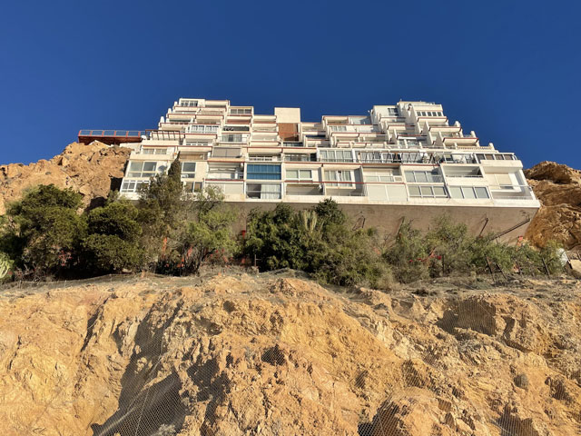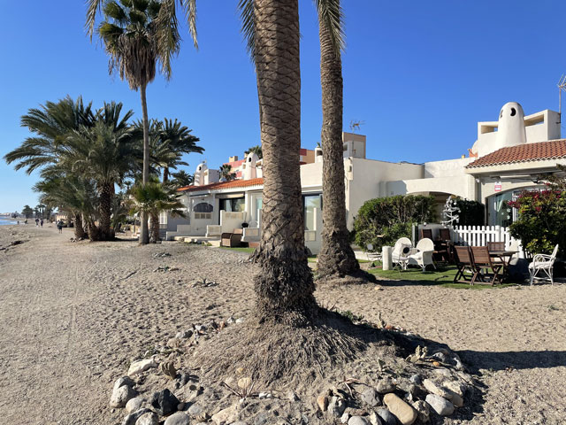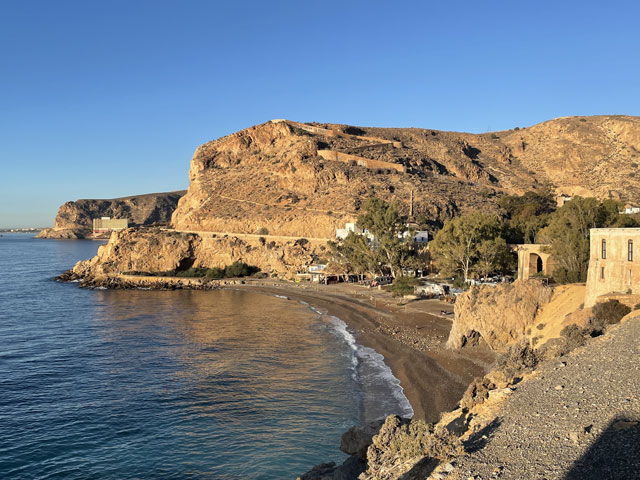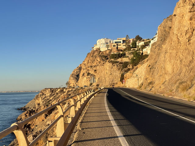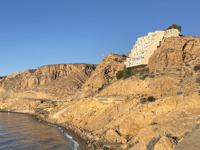 Ich bin um sieben aufgestanden und um acht los. Da war es draußen schon recht hell, weshalb ein paar Minuten später die Laternen ausge-schaltet wurden. Ich bin nicht auf dem kürzesten Weg raus aus der Altstadt, sondern runter auf die Promenade, die sich als „Parque Nicolás Salmerón“ entlang der gleichnamigen Straße hinzieht und einen schönen Blick auf den Hafen erlaubt. Da auf der anderen Seite immer mal wieder zwischen den Häusern die maurische Festung „Alcazaba“ zu sehen war, bin ich aber wiederholt in diese Richtung abgeschwenkt. Gestern Abend war ich noch bis zur Festungsmauer gelaufen, wo ich eine Parkanlage mit vielen verschlungenen Wegen und vielen kleinen Lichtern an den Wegen gefunden habe. Das sah aus wie ein Friedhof mit lauter Grablichtern. Da die umstehenden Bänke aber alle von gelangweilten Jugendlichen belegt waren, bin ich da im Dunkeln nicht weiter rumgeschlichen. Auf besagter Promenade ging es vorbei an verschiedenen Hafenbecken. Am Fischereihafen endet sie und ich musste mich für einen der schmalen Fußwege entlang der viel befahrenen Straße „Carratera de Málaga“ (N-340A) entscheiden. Da sollte man den auf der Wasserseite wählen, auch wenn der sehr holprig ist, da es später keine sichere Möglichkeit gibt, die Straßenseite zu wechseln. Gleich hinter der Stadt gabelt sich die Straße und beide Äste ver-schwinden in Tunneln. Einer führt danach weiter an der Küste entlang, der andere dient als Zufahrt zur parallel, aber viel höher verlaufenden Autobahn. Hier begann der schönste Teil des heutigen Weges. Kurz vor den Tunneleinfahrten führt eine Treppe runter zu einer dicht am Wasser entlang führenden Straße, die vor dem Tunnelbau Benutzung fand und nun nur noch ein paar Angler und Wohnmobile anlockt, die ganz dicht am Wasser stehen wollen. Auf dieser Straße ging es 8 km entlang der Steilküste, stets etwa 20…30 Meter über dem Wasser und von einer fast immer senkrecht aufragenden, mit Stahlnetzen gesicherten Felswand begleitet. Hinter dem Tunnel vereinigt sich diese Straße wieder mit der N-340A und man bekommt die Autobahn zu sehen, die hoch über einem auf einer gewagt aussehenden Brücke eine Schlucht überquert. Beim nächsten Tunnel dient die alte Straße wieder als Umfahrung. So hat man fast auf der ganzen Strecke bis zum Ende der Steilküste einen unverbauten Blick auf das Wasser und kann zum Beispiel eine aus zwei Dutzend kreisförmigen Käfigen bestehende Muschelzuchtanlage bestaunen. Eine mit Maschinen bestückte Platt-form daneben pumpt offenbar Luft in die Anlage, denn von ihr führen Schläuche zu allen Käfigen. Ein kleines Schiff mit einem Kran darauf fuhr gerade von Käfig zu Käfig - vielleicht stand da schon die Ernte an. Auf der Bergseite der Straße geht nur ganz selten mal eine Straße ab und hoch auf den Berg, wo mitunter noble Behausungen zu sehen sind. Einmal gibt es in einer Ausbuchtung neben der Straße eine große Gaststätte und ein anderes Mal geht es auf einer alten Brücke über einen ganz toll gelegenen Campingplatz. Die alte Straße schlängelt sich dahinter wieder um die Klippen herum, während die neue wieder durch einen Tunnel führt. In den hell beleuchteten Tunneln wären übrigens Fußwege, aber der Weg zwischen Wasser und Felswand ist viel verlockender. Bei jeder Kurve „hinaus aufs Meer“ gibt es neue Ansichten. Dann geht es mal, wieder vereint mit der neuen Straße, ein ganzes Stück geradeaus auf ein weithin sichtbares Hotel zu, das sich beim Näherkommen als in der Winterpause befindlich erwies. Unterhalb der Straße steht am Strand ein winzig erscheinendes, 7geschossiges Wohnhaus und rechts an der Felswand klebt wie ein Schwalbennest eine mehrgeschossige Wohnanlage. Auf Metallstützen sind da lauter containergroße Wohneinheiten übereinander gestapelt. Da kann man sich streiten, ob dies die Küste verschandelt - eindrucksvoll ist das allemal. Hinter dem verrammelten Hotel geht es noch einmal um einen Felsen herum und dann ist der Blick frei auf Aguadulce, einen modernen Badeort mit endlos langem Strand, der von einer ansprechenden Promenade und terrassenförmig angelegten Ferienwohnungen begleitet wird. Dahinter stehen diverse Hochhäuser, die schon immer mal hinter den Klippen hervorschauten. Die Steilküste ist jetzt erstmal passé. Stattdessen geht es vorbei an einem Sportboothafen und dann auf gut gepflastertem Weg immer am fast menschenleeren Strand entlang. Im Sommer ist hier sicher die Hölle los, aber jetzt sind nur ein paar Spaziergänger, Jogger und Radfahrer unterwegs. Das hat zwar zur Folge, dass die meisten Gaststätten geschlossen sind, aber man hat wenigstens die vereinzelt an der Promenade stehenden Toilettenhäuschen offen gelassen. Hinter Aguadulce kann man trockenen Fußes ein Flussbett überqueren, dahinter breitet sich auf etwa 4 km am Wasser eine Landschaft aus, die eigentlich ein Sumpfgebiet sein soll. Hier muss man sich entscheiden, ob man weiter am Strand, auf einem asphaltierten Fußweg oder verbotenerweise auf dem Radweg durch dieses Gebiet mit spärlichem Bewuchs laufen will. Ein paar hölzerne Stege deuten an, dass es hier auch mal nass sein kann. Aber momentan sind da höchstens ein paar Pfützen zwischen den flachen Sträuchern zu sehen. Ich bin am Strand geblieben und so sind mir wohl ein paar archäologische Ausgrabungen entgangen, die in der Karte verzeichnet sind. Beim nächsten „Fluss“, bestehend aus einem breiten, trockenen Bett und einem kleinen, von einem Steg überbrückten Wassergraben war Roquetas de Mar erreicht. Hier setzt sich das in Aguadulce Gesehene fort: endloser Strand, Promenade, Ferienwohnungen. Hier wird aber auch im Winter gewohnt. Der vom Navi vorgeschlagene Weg hat mich gleich hinter dem Flussbett nach rechts in die Stadt geführt. Dort geht es hinter der Hauptstraße, vorbei an einem schicken Platz und an der Stierkampfarena, direkt auf einen ALDI zu, wo ich meinen Proviant auffrischen und gleich vor der Tür verzehren konnte. Hi