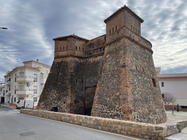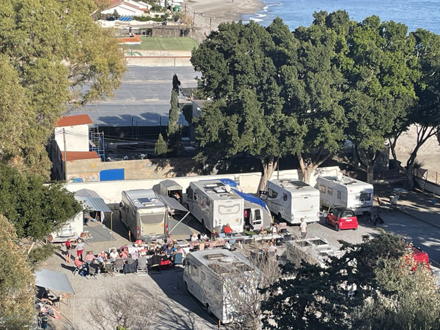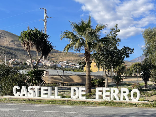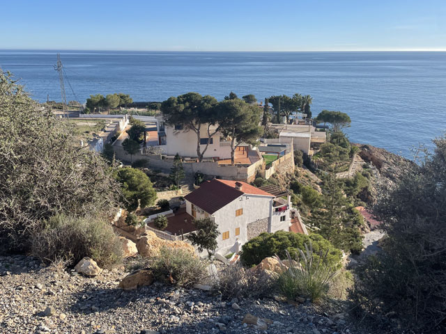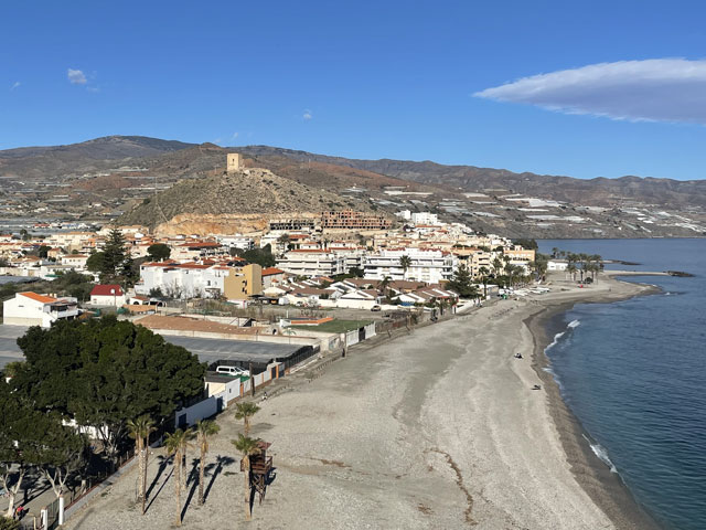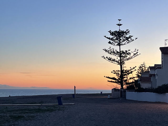 Kurz nach acht bin ich aufgebrochen und als ich die lange Kehre runter zum Wasser hinter mir hatte, war genau der Zeitpunkt des Sonnen-aufgangs und ich konnte sehen, wie die Sonne aus dem Wasser aufstieg. Hell war es zu diesem Zeitpunkt eigentlich schon, aber nun sah alles ganz anders aus. Die Sonne hat hier ein schönes, warmes Licht, das selbst baufälligen Häusern einen mediterranen Charme verleiht. In Pozuelo, dem ersten Ort unten am Wasser, muss es ein paar strickwütige Frauen geben. Da waren alle Laternen in bunte Strickwaren eingepackt, einige Straßenbäume von aneinander gehefteten oder einfach an den Baum genagelten Topflappen eingehüllt und an manchen Bäumen hing noch gestrickte Weihnachtsdeko. Alles nicht übermäßig schön, aber originell. So wie der als Weihnachtsbaumersatz gedachte grüne Kegel auf dem Dorfplatz. Für Fußgänger führt ein schöner Weg aus dem Ort heraus. Neben einer Reihe Palmen hat man einen Fußweg aus aneinander geschraubten, etwa 1x1 Meter großen, hellen Platten gelegt, auf denen es sich wie auf einer Tartanbahn läuft. Und beidseits dieses Weges sah es einigermaßen aufgeräumt aus, obwohl auch hier Folienzelte stehen. Aber da heute, am Sonntag, die Müllabfuhr unterwegs war, scheint man hier ein Auge darauf zu werfen, dass sich gar nicht erst viel Müll ansammelt. Der Weg endete an einer etwa 20 Meter breiten, beidseits mir hohen Mauern eingefassten Rinne, in der ggf. das Wasser aus den Bergen ins Meer schießen kann. Bei der jetzigen Witterung ist es unvorstellbar, dass solche Flutrinnen notwendig sind. Jetzt kann man an einer bestimmten Stelle zu Fuß oder mit dem Auto die Rinne passieren. Wenn da Wasser drin ist, muss man einen Umweg bis zur nächsten Brücke machen. Auf der anderen Seite der Rinne ist man schon in La Rábita, einem sehr netten Küstenort mit den Resten einer alten Burg. Hinter dem Ort, der wie alle Küstenorte hier eine schöne Uferpromenade hat, führt die Straße ziemlich steil bergauf, bis sie auf die N-340 trifft, die ich, abgesehen von ein paar Ortsbesichtigungen, bis zum Ende des Tages nicht mehr verlassen habe. Das klingt schlimm, ist es aber nicht. Am Sonntag ist da nicht viel los, da sind mehr Radfahrer und Biker (vorzugsweise im 12er-Pack) als Autos unterwegs. LKWs sieht man auf der Straße fast gar nicht, die fahren alle auf der nahen Autobahn. Die Straße hat einen breiten Randstreifen und manchmal sogar einen Fußweg hinter der Leitplanke. Da kann man überall gut und sicher laufen und darüber staunen, wie man den Felsen Platz für die Straße abgerungen hat und wie man durch Brücken und Dämme in den sich zum Meer öffnenden Schluchten versucht hat, enge Kurven zu minimieren. Das ist eine bautechnische Meisterleistung, die noch dazu schön anzusehen ist. So ging es heute den ganzen Tag an der Steilküste entlang und hinter jeder Kurve bot sich ein neuer, oft atemberaubender Blick. Ab der ersten, weit ins Wasser reichenden Klippe hinter La Rábita, konnte ich gut die gesamte Küste bis zu meinem Tagesziel Calahonda einsehen. Das waren ab dieser Stelle noch knapp 25 km Wegstrecke. Es war ein großartiger Anblick. Da lagen im Sonnenlicht aufgereiht die Orte Melicena, Los Yesos, La Mamola, Castillo de Baños de Abajo, Los Cambriles, Castell de Ferro und an der letzten sichtbaren Klippe halt Calahonda, wo mein „Hostal Miguel“ direkt an dem steil aufragenden Felsen liegt, der den Ortseingang dominiert. Leider war es auf der ganzen Strecke nicht so sonderlich gut mit Kneipen und Geschäften bestellt. Erst in La Mamola fanden sich offene Gaststätten und ein kleiner Supermarkt, dann erst wieder in Castell de Ferro. Dazwischen gab es zwar in La Lance ein Restaurant direkt an der Straße, aber da war es ziemlich voll, unter anderem durch eine größere Gruppe Biker. Ich hatte zwar keine Eile, aber mich da nur für ein Getränk der Gunst oder Missgunst eines gestressten Kellners auszusetzen, hatte ich keine Lust. Da musste ich gezwungenermaßen zwischendurch auf den mitgeschleppten Wasservorrat zurückgreifen. In der Kneipe in La Mamola, wo ich um zwölf endlich zu einem Früh-schoppen gekommen bin, hätte ich fast eine Keilerei zwischen dem Wirt und seinen beiden Kellnerinnen, offenbar alles Familienmitglieder aus Osteuropa, miterlebt. Die haben sich angeschrien und gerempelt, da habe ich lieber schnell bezahlt und mich aus dem Staub gemacht, zumal mir die Biersorte „Amber“ nicht so zugesagt hat. Kurz darauf kam ein kleiner Supermarkt, der in einem ganz normalen Haushaltskühlschrank schwarz/rote Büchsen mit meinem Lieblingsgetränk hatte. Mit einer solchen habe ich mich auf einer Bank an der Uferpromenade niedergelassen, meine Essensreste ausgebreitet und Picknick gemacht. Das war herrlich. Hinter mir übten am Strand zwei Kinder mit ihrem Vater Drohnenflug, vor mir spazierten ein paar überwiegend alte Paare vorbei und an der Straße war ein fast geschäftiges Treiben. In Castell de Ferro, einem eingangs recht schön anzusehenden Ort, der seinen Namen vermutlich von der Burgruine auf einer Bergkuppe hat, waren am Ortsausgang einige Investruinen zu sehen. Darunter war ein recht großer Rohbau, für den man extra einen Teil des Burgberges abgetragen hat. Welch Frevel! Und so schade für den Ort. Auf den verbleibenden 8 km bis Calahonda ist die Straße vermutlich in letzter Zeit nochmal ausgebaut worden. Da hat man mit endlos langen Bohrern, deren Spuren noch deutlich sichtbar sind, den Felsen so abgetragen, dass senkrechte Wände zurückblieben. Mit dem ange-fallenen Material hat man schließlich die nächste Schlucht teilweise verfüllt, so dass sich hinreichend Platz für eine Straße mit zwei Bergauf- und einer Bergabspur nebst breiten Rändern ergab. Die ist immer noch sehr kurvenreich und mit Anstiegen bis auf hundert Metern versehen, was das Laufen zwar anstrengend, aber interessant macht. Zwischendurch gibt es einige Aussichtspunkte, die sogar mit Sitz-gelegenheiten versehen sind. Von da konnte man g