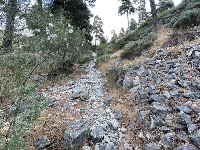 Wie froh war ich, als der Pfad in einer breiten, glatt gewalzten Forststraße seine Fortsetzung fand. Die ging nur ganz moderat bergauf und lief sich wunderbar. Als die dann aber nach Süden abknickte, hab‘ ich doch mal auf die Karte geschaut und gesehen, dass ich falsch bin. Also zurück. Das waren nur ein paar hundert Meter und der Zeitverlust war gering. Als ich wieder an der Stelle war, wo ich falsch weitergelaufen bin, habe ich gesehen, dass gegenüber dem gemachten Aufstieg ein Pfeil am Felsen war und dort der nächste Aufstieg auf mich gewartet hat. Den Pfeil habe ich aber auch nur gesehen, weil es inzwischen hell wurde. Hier habe ich mich ein bisschen über Koo geärgert. Wir waren ja mit dem stillen Übereinkommen losgezogen, uns auf dem schwierigen Wegstück gegenseitig Beistand zu leisten. Dass er da schneller hochkraxelt ist ja ok, aber ich würde dann zwischendurch mal warten, bis der Andere ran ist. Da, wo der Weg auf die schöne Forststraße trifft, wäre ein guter Platz zum Warten gewesen …