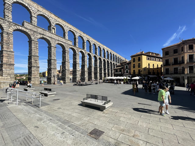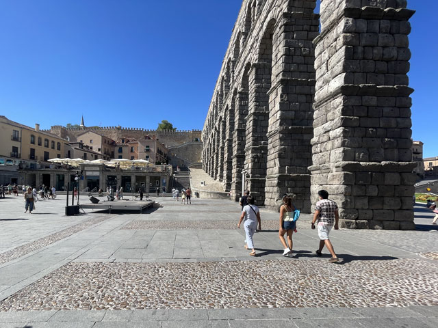 Etwas erholt ging es nach einer halben Stunde weiter in die Innenstadt, wo ein riesiges, aus Steinquadern gefügtes Aquädukt über den Marktplatz verläuft und auf der anderen Seite auf dem Hügel mit der Altstadt verschwindet. Auf dem Platz und in den dorthin führenden netten Gassen wimmelte es an Menschen. Es war schließlich Sonnabend. Alle hatten eine Wasserflasche unterm Arm und die Kamera im Anschlag. Auf der Treppe, die neben dem Aquädukt hoch in die Altstadt führt, war kaum ein Durchkommen, weil da so viele Leute Selfies machen wollten, was mit einem solchen riesigen Bauwerk im Hintergrund gar nicht so einfach ist.