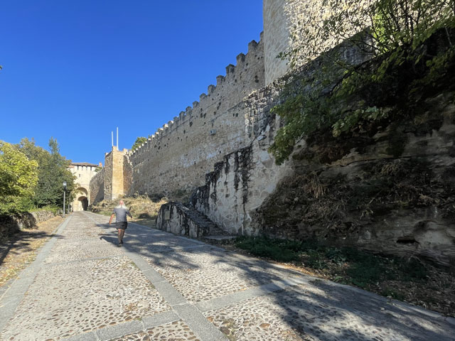Am Fuß dieser Buckel war dann steppenhafte Ebene, die sich bis zum Horizont erstreckt. Mittendrin waren immer wieder Dörfer und Städte zu sehen, wie z.B. Segovia, mein heutiges Ziel. Der Weg dahin zog sich aber endlos hin und die inzwischen hoch am Himmel stehende Sonne hat das Laufen zur Qual gemacht, obwohl angeblich nur 25 Grad waren. Nachts losgelaufen bin ich natürlich mit einer Jacke, kurz vorm Pass musste ich mir dann sogar noch meinen Pullover anziehen, denn es waren dort morgens nur 12 Grad und es blies ein kalter, scharfer Wind.