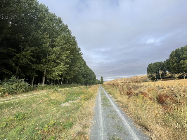 Dann ging es mit der Landschaft so weiter. Da wird man wirklich nicht abgelenkt. Allerdings ging es auch mal mehrere Kilometer ganz glatt auf einem Radweg entlang des kanalisierten Río Eresma, der hinter einer wilden Hecke kaum auszumachen war. Vielleicht war ich aber auch durch die vielen Brombeeren abgelenkt, die alle verkostet werden wollten. Hinter dem Flüsschen waren große Baumplantagen. Da waren Pappeln (?) so in Reih und Glied angepflanzt, so dass man sie leicht ernten kann. Da alle Bäume gleich hoch waren, sah es aus, als hätte sich da gerade einer mit der Heckenschere ausgetobt.