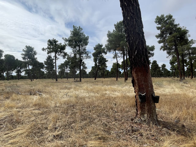 Es ging auch mal durch einen Kiefernwald, in dem alle Bäume angeritzt und mit Töpfen zum Auffangen des Harzes versehen waren. Das war bei uns auch mal üblich, ist aber ganz aus der Mode gekommen.