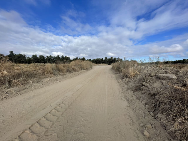 Im Wald hat man zwar breite Brandschneisen angelegt, aber wie es aussieht, werden die nicht sonderlich gepflegt. Die sind dicht mit Kiefernnadeln belegt und an vielen Stellen wächst Gras aus dem Sand. Im Falle eines Waldbrandes stoppt das nicht unbedingt die Flammen.