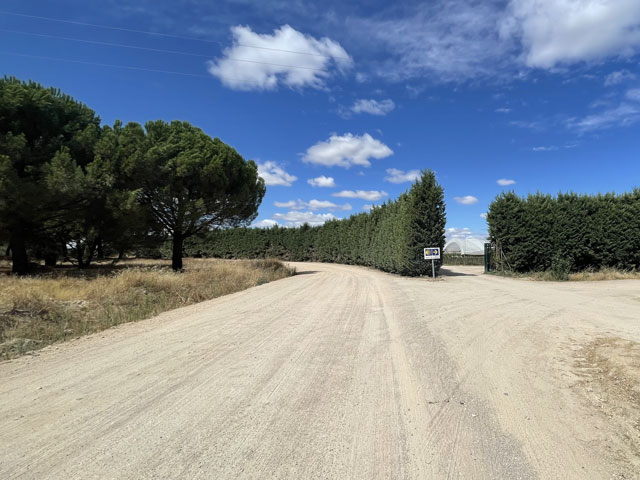Immer schön der eigentlich sehr guten Ausschilderung folgend, bin ich auf halbem Weg in eine Kiesgrube geraten, d.h. auf einer unheimlich staubigen Werksstraße zwischen der Grube und den Verarbeitungsanlagen. Das war beides eindrucksvoll anzusehen, auch die riesigen Dumper, die dort zwischen beiden Werksteilen pendeln und dabei den Sand auf dem Weg zu Staub zermahlen. Ein Blick auf die Karte verriet mir dann, dass man diese Anlage hätte umgehen können und sollen. Aber das hat kein Schild angezeigt und hinter der Grube, wo die „Umleitung“ wieder auf den Weg gestoßen wäre, war die Umleitungsstrecke verbarrikadiert und mit einem Gesperrt-Schild versehen. Es wäre wahrscheinlich am besten gewesen, so früh wie möglich auf den parallel verlaufenden, schnurgerade verlaufenden Radweg zu wechseln und auf diesem vermutlich ehemaligen Bahndamm bis Nava de la Asunción zu bleiben. Das hätte einigen Staub an und in den Schuhen erspart.