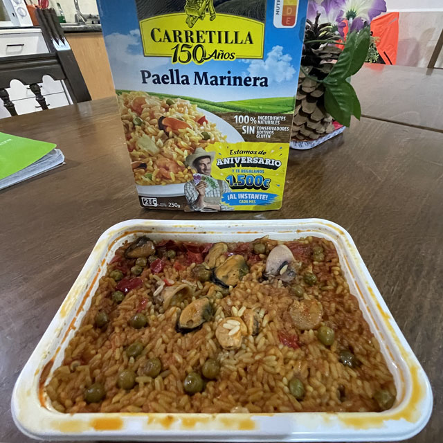 Nun aber schnell zum Dorfkonsum, denn es war schon weit nach fünf. Welch Schreck: die beiden, sich gegenüber liegenden Supermärkte, an denen ich um drei vorbeigekommen war, waren zu. Aber um die Ecke rum war ein dritter, der offen war und ein recht gutes Angebot hatte. Da habe ich mich mit Essen und Trinken für den Abend und für morgen früh eingedeckt. Für den Abend habe ich eine Paella mit toten Meeresfrüchten gewählt, von der gleichen Firma, von der ich letztens die leckeren Lenden hatte. So wie ich die Angaben in Erinnerung hatte, habe ich auch dieses Mal die Uhr der Mikrowelle auf eine Minute gestellt und erst nach dem Verzehr gesehen, dass da „mindestens 2 Minuten“ draufstand. Wenn mir morgen komisch ist, dann liegt das vielleicht daran, dass das Meeresgetier noch nicht richtig tot war. Übrigens: Die Garnele, die auf dem Titelbild ganz vorne an liegt, hat leider jemand anderes in seine Schale gehabt. Bei mir waren eher die Tierchen mit Ohrläppchen-Konsistenz vertreten. Hat aber gut geschmeckt.