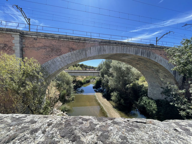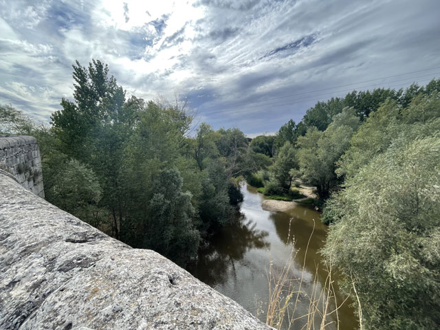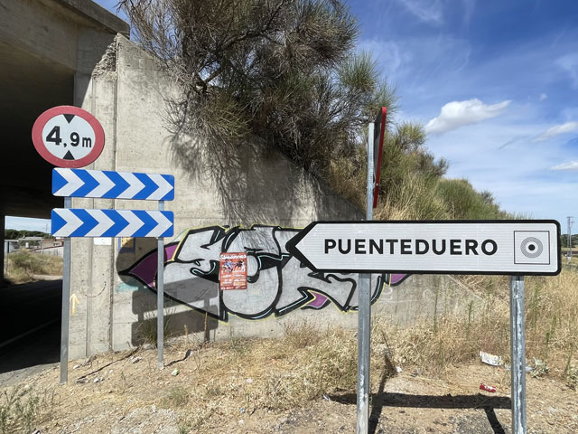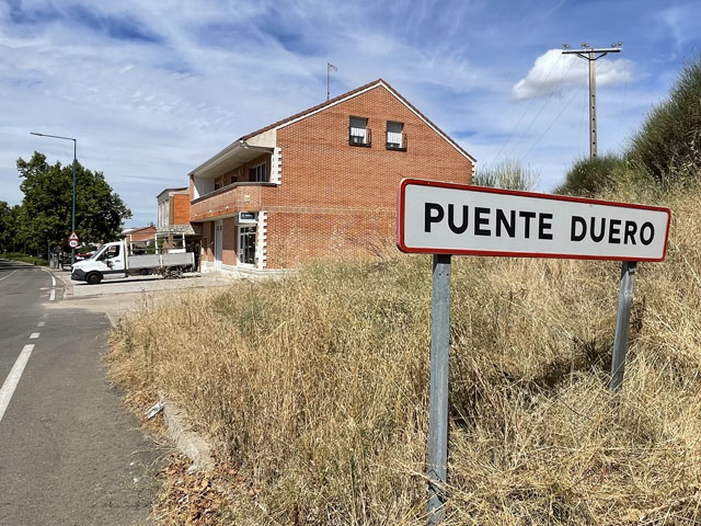 Puente Duero heißt so viel wie „Duero-Brücke“. Ob das zusammen oder getrennt geschrieben wird, hängt von der Farbe des Schildes ab. Auf schwarz umrandeten Schildern wird es zusammengeschrieben, auf rot umrandeten und in der Karte hingegen getrennt. Der Duero ist übrigens jener Fluss, der weiter westlich auf vielen Kilometern die Grenze zu Portugal bildet und später als Río Douro durch Porto fließt und in den Atlantik mündet. Den habe ich auf meinen Pilgertouren schon wiederholt überquert, unter anderem in Zamora auf der Via de la Plata.