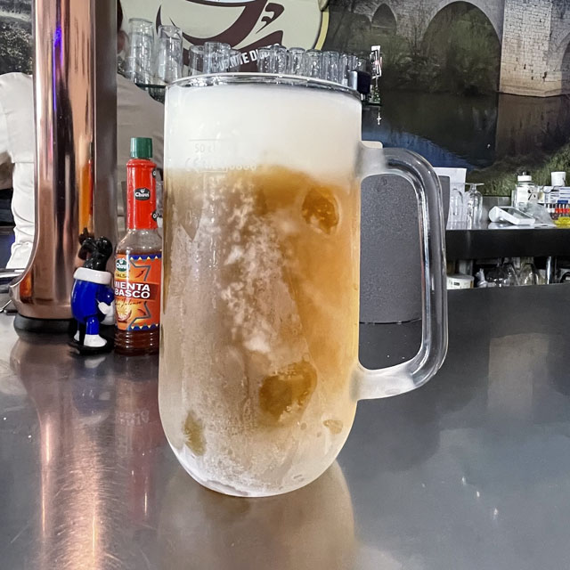 Leider war das Sparkassennetzwerk nicht so gut, dass ich mich auf der anderen Straßenseite an einen Kneipentisch hätte setzen können. Ich musste also im Stehen die noch nicht gesichteten Bilder der Verwandtschaft runterladen und meine Bilder vom gestrigen Tag hochladen. Erst dann gab es gegenüber einen Café con leche und ein Bier aus einem 0,22 (!) Liter-Glas.