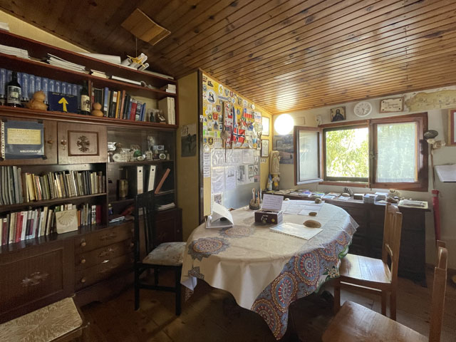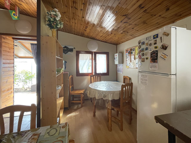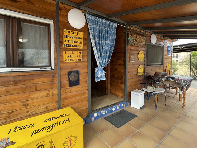 Kurz vor dem Fluss biegt links eine Wohngebietsstraß ab, an der sich ein Gartengrundstück mit einem unscheinbaren Holzhaus befindet. Das ist die kommunale Herberge mit zwei Vierbettzimmern, einer großen Küche und einem gemütlichen Aufenthaltsraum. Alles ganz ordentlich und sauber, wenn man mal vom Geschirr im Schrank absieht.
