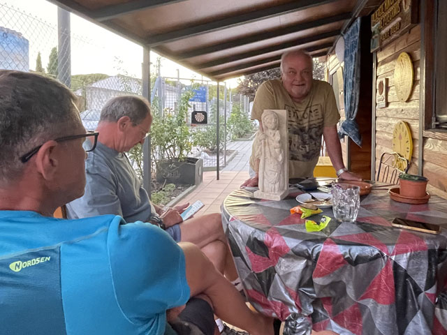 Nach dem Einchecken und Bettenbeziehen habe ich mich zum Einkaufen aufraffen müssen. Dazu ging es über die Brücke (Puente), die sich folgerichtig auf der Karte „Puente de Puente Duero“ nennt. Da die mal für Eselskarren und Reiter gebaut wurde, muss jetzt eine Ampel den Autoverkehr regeln. Dahinter weitet sich die Straße und die Fahrbahnen schließen eine große Grünfläche ein, auf der sich unter anderem Spielplätze befinden. „Bruno“, der Kaufmannsladen ist auf der rechten Seite, links sind auf 100 Metern drei Kneipen. Eine davon lockt mit Spezialitäten, die auf einer Tafel aufgelistet sind. Nach „Oreja“ (Ohr) und „Morro“ (Nase) habe ich das Übersetzungsprogramm nicht weiter strapaziert, sondern bin in die Herberge und habe mir da was in die Mikrowelle geschoben: „Macarrones Boloñesa“ von jener Firma, deren Paella mit Meeresfrüchten ich überlebt habe.