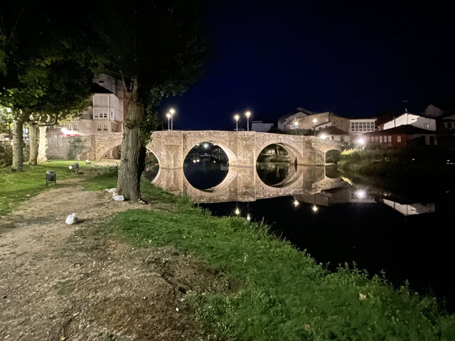 Der Weg raus aus der Stadt führte auf der Fußgängerbrücke über die Bahn, im Zickzack durch einige Straßen und dann ein Stück entlang des noch im Dunkeln liegenden Río Cabe und auf einer alten Steinbogenbrücke über diesen hinweg.