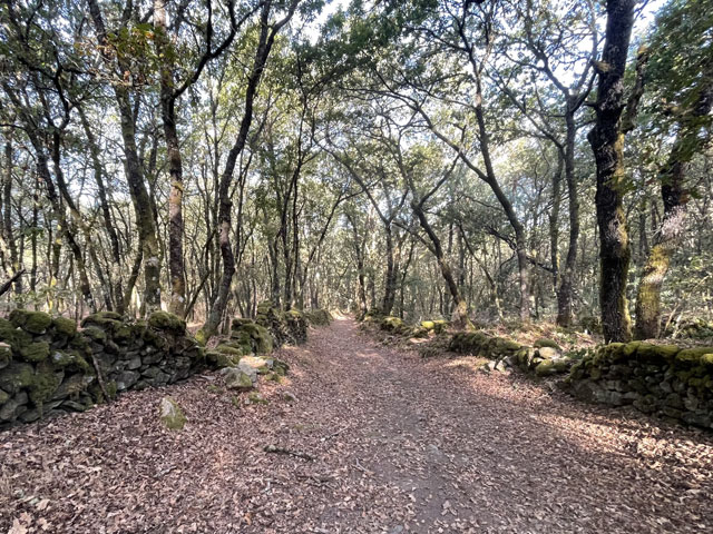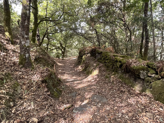 Von Diamondi geht es auf einem steilen Weg im Zickzack am Berghang hinunter ins Tal, von 500 runter auf 200 Meter. Das klingt nicht viel, aber die Beine sind da ganz anderer Meinung. Man kann nicht sagen, dass der Weg gepflastert ist. Da hat mal jemand, wahrscheinlich waren es die Römer, große Felsbrocken nebeneinander gelegt, über die man jetzt abwärts hüpfen muss. Dass dies anstrengend wird, war mir klar, aber ich hätte nie gedacht, dass man für diese 300 Höhenmeter so lange braucht. Als dann vielleicht noch hundert Meter übrig waren, konnte man durch ein paar Lücken im Wald endlich mal runter bis zum Fluss schauen, der da noch so endlos weit entfernt schien.