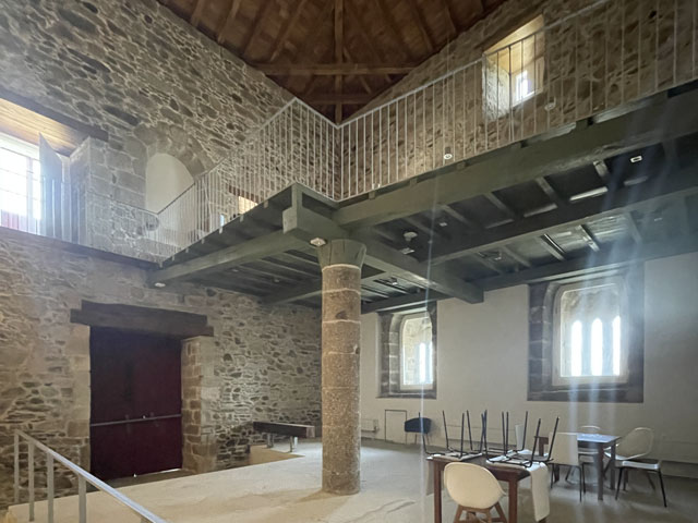 Ich habe also den kleinen Abstecher gemacht und vor der Tür einen Herrn aufgeschreckt, der dort auf Pilger wartete. Dem musste ich nun beibringen, dass ich zwar ein Pilger bin, aber anderswo nächtigen werde. Er hat mich trotzdem mal einen Blick reinwerfen lassen. Das ist wirklich eine originelle Kombination aus alt und neu. Die Kirche selbst ist leergeräumt und nicht zu besichtigen, aber ein an die Kirche angrenzender Saal, in den man den Aufenthaltsraum der Herberge wie eine Empore eingebaut hat. Wirklich toll gemacht, aber ich befürchte, dass der Herr nicht nur heute von 13 bis 22 Uhr (so die Öffnungszeiten der Herberge) vergeblich auf Übernachtungsgäste warten wird. Insgesamt 34 könnten da unterkommen. Wohl selten hat jemand so viel Essen und Trinken dabei, dass er da einfach absteigen kann. Und wenn er nicht aus der hohlen Hand essen will, muss er auch noch Geschirr und Besteck dabei haben, denn während Corona hat man in den kommunalen Herbergen die Küchen aus- und danach nicht wieder eingeräumt. Da bezahlt man nun jemand, der jeden Tag auf Gäste wartet und vermutlich selten was zu tun bekommt, aber für einen Automaten (der sich vermutlich selbst finanzieren würde) ist kein Geld und/oder kein Wille da. Das ist wirklich ärgerlich.