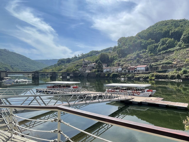 Bevor ich das angehen konnte, brauchte ich unbedingt eine längere Pause. Da traf es sich gut, dass es wider Erwarten unten am Fluss eine Gaststätte gab, die in der Online-Karte gar nicht eingezeichnet, aber in der beim „Standort senden“ verschickten Karte zu sehen ist. Die liegt, ohne Insiderwissen nicht erkennbar, etwas abseits des Camino zwischen der Straße und dem Bootssteg, an dem zwei „Ausflugsdampfer“ auf Fahrgäste warteten.