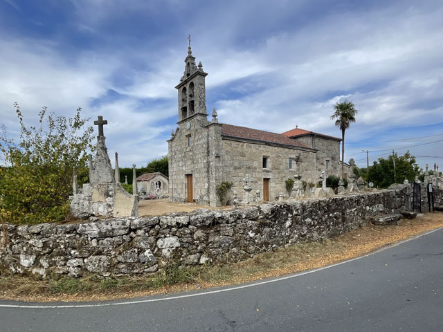 In Diomondi, wo der Camino die Straße verlässt und auf einem holprigen Weg runter ins Tal führt, habe ich mir die dortige Herberge angeschaut. In dem winzigen Dorf gibt es vielleicht fünf Häuser, aber eine romanische Kirche aus dem 12. Jahrhundert und einen angebauten Bischofspalast, wobei hier „Palast“ sehr hoch gegriffen ist. Sagen wir mal, die Kirche hat einen Anbau. In diesen hat ein offenbar renommierter Architekt vor wenigen Jahren für eine Million Euro eine Pilgerherberge eingebaut. Jene, die dort schon mal übernachtet haben, loben den Bau, bemängeln aber, dass es dort nicht mal einen Automaten für Getränke und Essbares gibt. Das muss man sich alles mitbringen und zwar aus dem 23 km entfernten Monforte, wo ich herkam. Ich hatte schon mit den Gedanken gespielt, des tollen Ambientes wegen dort abzusteigen und morgen früh dann ausgeruht den strapaziösen Ab- und Aufstieg runter zum Río Miño und wieder hoch nach Chantada in Angriff zu nehmen. Aber ich hatte nichts zum Essen dabei und ab 14 Uhr für den Rest des Tages Wasser zu trinken und mich im Garten zu langweilen, war auch nicht mein Verlangen. Aber anschauen wollte ich mir wenigstens Kirche und Herberge.