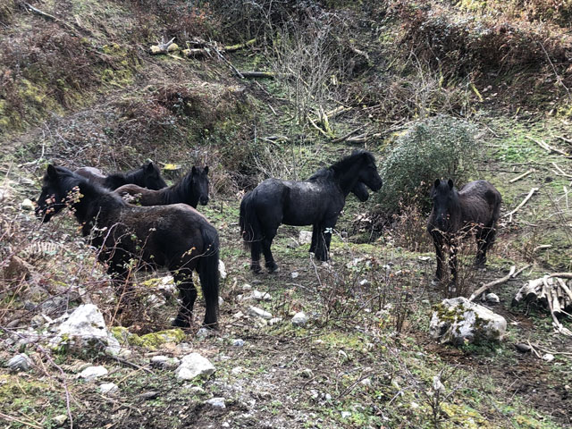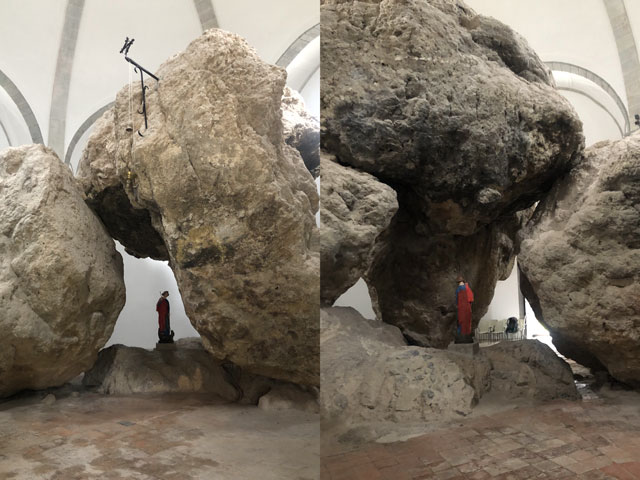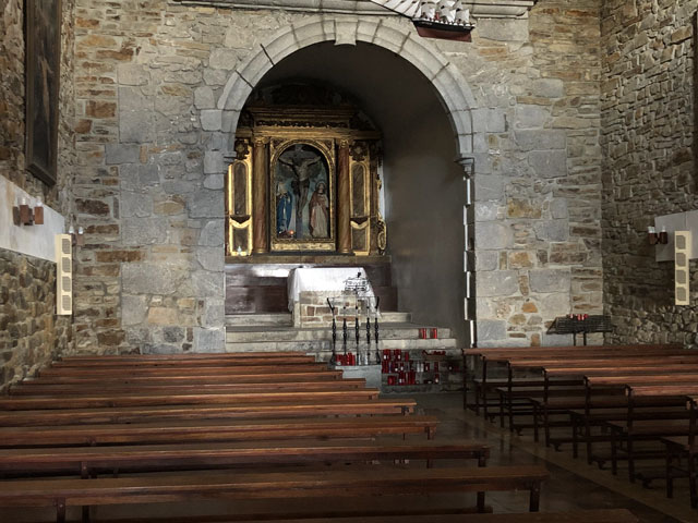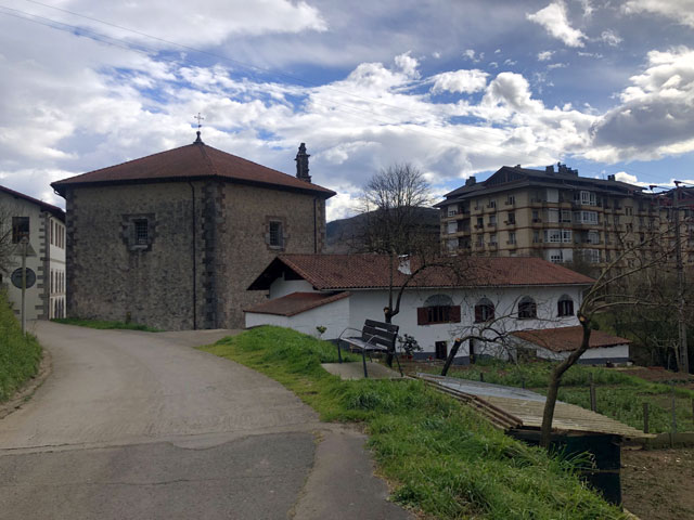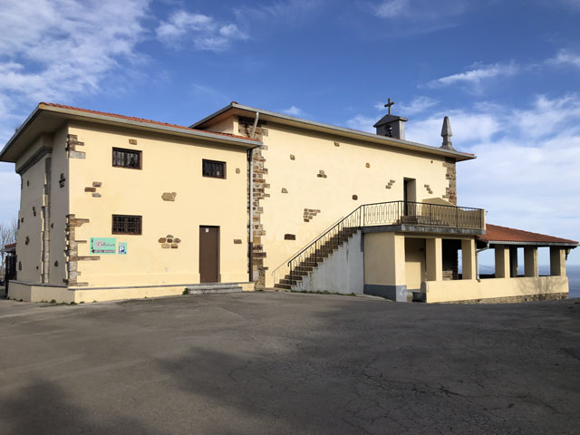 Es ist kurz nach sechs. Aufstehen lohnt nicht, da es erst nach 7 Uhr hell wird. Eine Küche, wo man sich Frühstück machen könnte, gibt es nicht. Außerdem würde man in dem engen Raum alle wach machen. Aber sobald einer beginnt, bin ich dabei, die Sachen zu packen. Gestern waren es knapp 30 Kilometer und heute wird es ähnlich heftig werden. Das eigentliche Tagesziel ist Markina-Xemein, 24 km entfernt mit reichlich Bergen unterwegs. Da es dort aber derzeit nur Pensionen gibt, würde ich gern noch 7,5 km weiter bis zu einem Kloster mit Herberge kommen. Mal sehen, ob das zu schaffen ist. Das Wetter soll ganz gut werden: warm und trocken und vormittags mal ein paar Stunden Sonne. 9.00 Uhr. Inzwischen ist der erste Berg erklommen. Ich sitze im Wirtshaus „Pikua“ und genieße bei einem „Café con leche“ den Blick aufs Meer. Dass das Wirtshaus, in dem man auch übernachten kann, offen ist, ist schon mal ein Wunder, da es nach Auskunft der Hospitalera in Deba nur sehr sporadisch geöffnet hat. Es ist, von Deba kommend, auch nur als Wirtshaus zu erkennen, weil Bierkisten neben der Hintertür stehen. Kein Schild, keine Reklame. Um zu überprüfen, ob offen ist, muss man erst ein paar Meter bergab und über die große Terrasse laufen. Ich habe den kleinen Umweg in Kauf genommen und wollte auf der Terrasse schon umdrehen, weil alles verlassen aussah und keine Tür als Eingang beschildert war. Aber da habe ich drinnen den Fernseher laufen sehen und nach Passieren der einzigen in Frage kommenden Tür drei Leute am Tresen vorgefunden, die Wirtsleute und eine recht schmuddelige Putzfrau, die mir lüsterne Blicke zuwirft. Da wird es wohl Zeit, zu gehen. Ich hatte vorhin schon Begleitung auf dem Weg. Ob’s eine Dame war, weiß ich nicht. Plötzlich tauchte neben mir ein hübscher schwarz-brauner Hund auf, der mich ohne Schlabbern oder Betteln eine ganze Weile begleitet hat. Er lief immer ein Stück vor mir, hat an Gabelungen den richtigen Abzweig genommen und in angemessenem Abstand auf mich gewartet, wenn ich eine Verschnauf- und/oder Fotopause gemacht habe. Nun ist er leider weg, wahrscheinlich war ich ihm zu langsam. Der Weg wird jetzt wohl bald vom Meer weg ein Stück ins ebenfalls bergige Landesinnere führen. Also noch ein letzter Blick aufs Wasser. Kurz vor Olatz geht es auf einem sehr naturbelassenen, mal steinigen, mal mit Wurzeln übersäten Weg von 200 auf 350 und wieder runter auf 200 Meter. Rechts vom Weg, der immer wieder durch Tierschutz-Gatter führt, sind steil abfallende Weiden, auf denen vielerlei Getier (Kühe, Schafe, Ziegen, Esel, Pferde) grast. Die Hangabtriebskraft, von der man uns mal im Physikunterricht erzählt hat, scheint es hier nicht zu geben. Da nicht nur die Kühe, sondern auch einige Esel und Pferde eine Glocke umzuhängen haben, ist es mitunter ein ordentliches Gebimmel, wenn man an solchen Weiden vorbeikommt. In Olatz, was eigentlich kein Dorf, sondern die Ansiedlung einer Handvoll Bauernhöfe ist, gibt es immerhin eine Kapelle und gegenüber eine Taverne. Erstere war natürlich zu und ich habe Gleiches auch von der Taverne erwartet. Aber als ich mich durch den Insektenschutzvorhang zur Türklinke vorgearbeitet hatte, ließ sich die Tür öffnen und ich stand in einem kleinen, sehr ordentlichen Gastraum. Die junge, Englisch sprechende Wirtin kam gerade mit einer noch dampfenden Omelette aus der Küche. Da konnte ich nicht widerstehen und hab mir ein Viertel davon geben lassen. Als ich um 11.11 Uhr aus der Taverne trat, gab die Glocke der gegenüberliegenden Kapelle zweimal 11 Schläge. Das ist sicher ein Programmierfehler, war aber ein guter Auftakt zur Bergetappe. Jetzt ging es nämlich ziemlich stramm auf einen 500 Meter hoch gelegenen Pass - zum Glück überwiegend auf einer gut begehbaren Betonpiste, auf der mir nur ein Auto entgegen kam. Nur das letzte Stück führte wieder über ausgewaschenes Geröll. Oben angekommen ging es, eingerahmt von zwei Weidezäunen, ein paar hundert Meter auf gleichbleibender Höhe voran. Dann zeigte der Weg nach unten, wobei da lt. Wegeprofil noch manche Amplitude zu erwarten war. Am Beginn des Abstiegs saßen die beiden Lemgoer am Straßenrand in der Sonne und haben gegessen. Irgendwo müssen die mich überholt haben. 13.00 Uhr. Jetzt sitze ich an einer überdachten Quelle und widme mich meiner Vorräte. Ich habe Angst, dass das angefangene Päckchen Chorizo-Aufschnitt meinen Rucksack vollsaut. Dazu gibt es einen guten Schluck „Gaseosa“, das ist eine spanische Variante des Margonwassers. Von meinen anderen drei Mitläufern (der Spanier, der junge Franzose und die Koreanerin) habe ich bisher noch niemand getroffen. Der Spanier wollte mich heute früh überreden, von Markina-Xemein zum Kloster mit dem Taxi zu fahren. Aber da es im Vaterunser heißt „Führe mich nicht in Versuchung“ habe ich ihn abgewiesen. Entweder schaffe ich das heute Abend noch zu Fuß oder ich nehme eine Pension. 21.30 Uhr. Der Weg nach Markina-Xemein zog sich noch endlos hin, erst auf 400…500 Meter Höhe und dann steil bergab, zum Glück wieder ein ganzes Stück auf einer Betonpiste. Unten angekommen, fing es an zu regnen, aber während ich die in einem kleinen Laden erworbene Cola unter dessen Vordach getrunken habe, hörte der Regen schon wieder auf. Da es schon weit nach 16 Uhr war und ich ja noch weiter wollte, habe ich mich nicht großartig im Ort umgesehen. Mir ist da auch nichts aufgefallen, was man sich hätte anschauen müssen – abgesehen von der „Ermita de San Miguel de Arretxinaga“, einer Kapelle, die um drei riesige, sich gegenseitig stützende Felsbrocken herum gebaut wurde. Ich habe nur noch eine Herberge angesteuert, die in der Karte eingezeichnet ist, aber bisher nirgendwo erwähnt wurde: „Augusto & Daughter“. Die Tochter war jedoch nicht da und Augusto hat mir mürrisch die Auskunft „cerrado“ (geschlossen) gegeben. Geschlossen war auch, wie schon bekannt, die große Pilgerherberge im Zentrum, aber ohne jede Angab