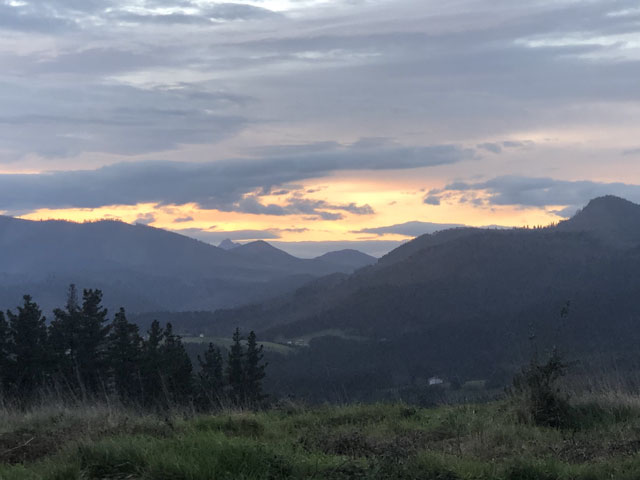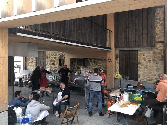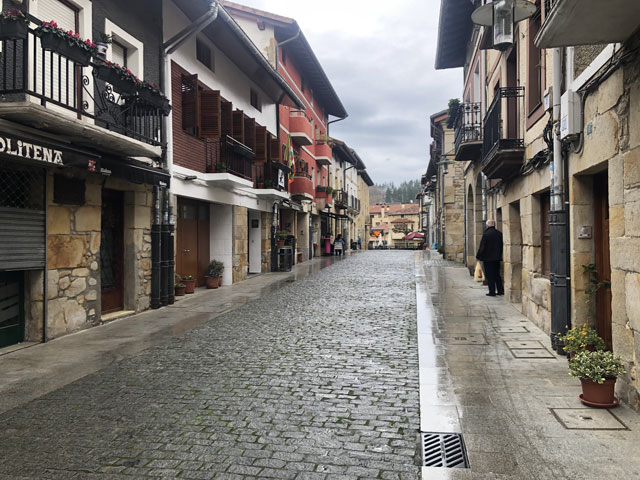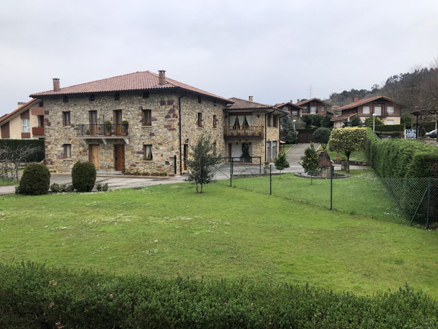 Ich habe die letzte Nacht ganz gut geschlafen, was wohl auch am „Vino Tinto“ lag. Halb sieben bin ich raus aus dem Bett und um viertel acht los. Das Packen hat etwas gedauert, weil ich zur Schonung meiner Kameraden kein Licht anmachen wollte. Die hatten sich nämlich erst zu acht Frühstück bestellt und schlummerten noch. Im nächsten Ort habe ich hinter der kleinen Kapelle ein winziges Einmann-Zelt entdeckt und an dem daneben stehenden Wanderstock erkannt, dass da Antoine drin steckt. Der nette Kerl ist mit wenig Geld unterwegs und spart, wo er kann. Aber wann immer man ihn trifft, bietet er einem etwas zu Trinken oder zu Essen an. Einige Kilometer später hat er mich dann eingeholt und ich habe ihn im nächsten Ort (Larrabetzu) auf ein Bier eingeladen. Das hat er zwar angenommen, aber er wollte sich gleich revanchieren, was ich nun wieder nicht wollte. In Larrabetzu saßen unter allen Arkaden, in einer kleinen Markthalle und unter Partyzelten Männer vor großen, mit Gas oder Holzkohle betriebenen Töpfen, umringt von diversen Zutaten und haben dort Suppen gekocht. Antoine hat in Erfahrung gebracht, dass es sich dabei um einen Kochwettbewerb handelt und dass Tomate und Zwiebeln die Hauptzutaten sind. Mir hat eine Frau auf Anfrage erklärt, dass es sich um eine Wahlkampfveranstaltung handelt - in zwei Monaten sind hier irgendwelche Wahlen. Eine rechte, aber nicht radikale Partei präsentiert sich hier. Ob die das Essen dann untereinander tauschen, verkaufen, oder kostenlos verteilen, habe ich nicht rausbekommen. Als potentieller Parteigänger hätte man hier vielleicht umsonst Futter fassen können, aber bestimmt nicht vor 12 Uhr, weshalb ich hungrig, aber mit einem kleinen Einkauf aus dem Supermarkt „Eroski“ weiter bin. Auf dem Weg nach Lezama kam sogar mal kurz die Sonne raus, was mich zu einem ausgedehnten Picknick auf einer der Bänke am Wegesrand verleitet hat. Hinter Lezama hat mich Quentin überholt und ich konnte ihm mitteilen, dass Antoine gar nicht weit vor uns ist. In Zamudio, dem letzten größeren Ort vor Bilbao, direkt in der Einflugschneise des Flughafens gelegen, bin ich in eine vertrauenserweckende Cafeteria, um mir für den Rest des Weges einen (heute dem ersten) „Café con leche“ zu holen. Und wen treffe ich da? Antoine und Quentin. Ich habe mich dazu gesetzt und wir haben ganz nett geschwatzt. Irgendjemand fiel dabei ein, dass wir ja morgen ein paar Kilometer hinter Bilbao das Baskenland verlassen und es somit höchste Zeit wäre, sich den lokalen Spezialitäten zu widmen, zum Beispiel dem „Patxaran“. Das ist der Anis-Schlehen-Likör, den uns der Wirt gestern nicht kredenzen konnte, weil im Vorjahr die Schlehen-Ernte so schlecht war. Um mich mit den Landesspezialitäten bekannt zu machen, habe ich davon mal eine Runde kommen lassen. Das Zeug schmeckt ganz gut, ist aber nicht unbedingt was für Diabetiker. Antoine hat dann zur Kenntnis gegeben, dass der Cidre hier ganz anders schmeckt, als in der Bretagne. Etwas salzig, wie das Wasser, das gerade auf den Strand trifft. Das wurde gleich probiert. Ich habe zwar nicht herausgeschmeckt, ob der Cidre bei Ebbe oder bei Flut abgefüllt wurde, aber er hat gut geschmeckt. Die Art, wie der aus der Flasche in die Gläser kam, war sehenswert, nämlich mit einer Verrenkung verbunden, die das Getränk in einem langen Strahl über die Schulter ins Glas lenkt. Der Cidre war noch gar nicht ausgetrunken, da fiel Quentin auf, dass der köstliche Wein des Baskenlandes bei unseren Betrachtungen zu kurz gekommen ist, und schon standen drei Gläser Rotwein auf dem Tisch. Der hat geschmeckt, aber als Nicht-Weinkenner habe ich keinen Unterschied zu dem (vermutlich billigen) Wein in der Karaffe beim Abendbrot bemerkt. Weil ich immer gefragt wurde, was man denn so in Deutschland trinkt und ich „Doppelkorn“ zwar in französischer Wikipedia-Version bekanntmachen, aber nirgendwo im Regal finden konnte, habe ich zum vermeintlichen Abschluss nochmal eine Runde Bier kommen lassen. Die war noch gar nicht ganz runtergeschluckt, da stand Florian aus Annaberg (der heimlichen Hauptstadt des Erzgebirges) in der Tür und hat sich mit einem Kaffee und zwei Brötchen zu uns gesellt. Die Höflichkeit gebietet es, in solchem Falle nicht aufzuspringen und loszurennen. Also haben wir ihn in unsere Gespräche eingebunden und als er bekundete, „Patxaran“ nicht zu kennen, hatte er prompt ein Glas vor sich. Da ich mir ziemlich sicher war, dass er auch noch Cidre, Rotwein und Bier probieren soll und man dabei aus Anstand mitmachen muss, habe ich mich aus dem Staube gemacht. Es waren ja noch etwa 6 Kilometer und ein 400-Meter-Berg zu überwinden und ich wollte mich nicht in Dunkeln in Bilbao auf Quartiersuche begeben. Gegen 18 Uhr war ich in Bilbao. So anstrengend der letzte Anstieg war, so schön war der Abstieg. Auf halber Strecke fand gerade ein Mountainbike-Wettbewerb statt, der schon von weitem zu hören war. Als die ersten Häuser erreicht waren, habe ich booking.com wegen günstiger Unterkünfte konsultiert. Und siehe da, ein paar Meter weiter war ein Hostel ausgewiesen, wo die Übernachtung mit Frühstück 17 € kostet. Das „All Iron Hostel“ ist im Erdgeschoss eines Hochhauses und hat 10 Zimmer mit vermutlich je 12 Betten. Küche, Aufenthaltsraum und Sanitäranlagen sind ok. Im Kühlschank gibt es preiswerte Getränke. Der Herr am Tresen wollte zwar erst 19 € haben, aber nach Hinweis auf meinen Booking.com-Rabatt habe ich den niedrigeren Preis bekommen. Eigentlich wollte ich nur mein Gepäck abstellen und in die Stadt gehen. Da es aber anfing, heftig zu regnen, bin ich doch bloß bis zum nächsten Supermarkt und hab‘ mir dort was fürs Abendbrot und für morgen gekauft. Alles zusammen keine 9 €, da kann man sich nicht beschweren. Die beiden Fischbüchsen habe ich nebst Weißbrot gegessen und auch die Gaspacho-Büchse sowie das Glas mit Paprika sind alle. Jetzt kämpfe ich mich durchs Biersortiment und für morgen habe ich Wur
