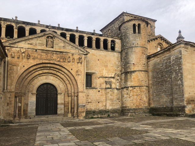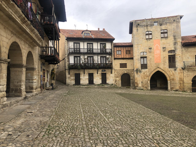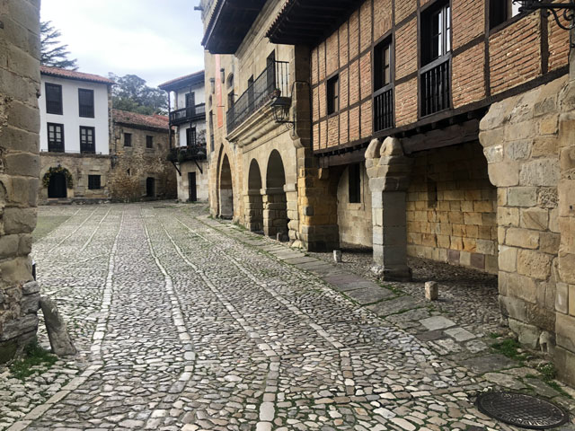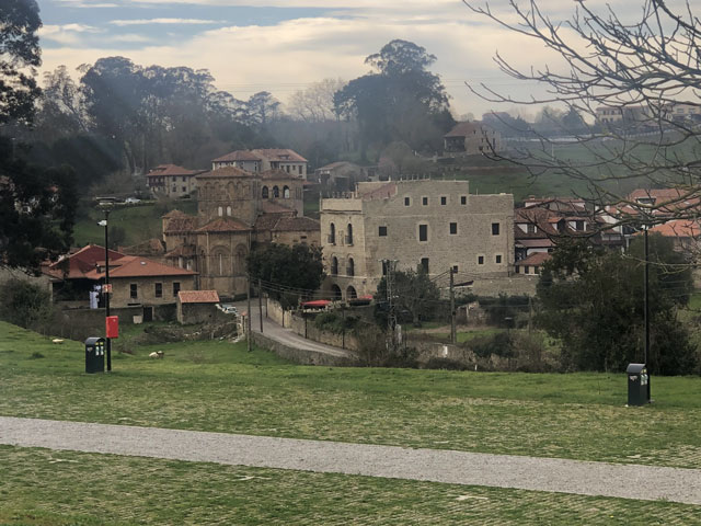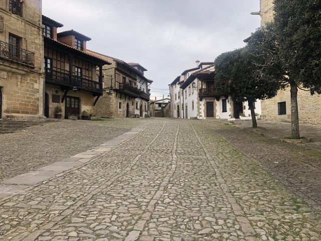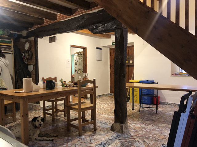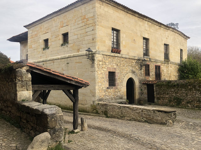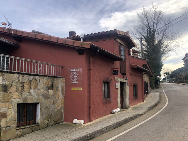 Im letzten Quartier war Frühstück im Preis enthalten, aber erst zu 8 Uhr angesagt. Das ist mir eigentlich immer etwas spät. In der Hoffnung, dass ich schon etwas eher einen Kaffee fassen und dann aufbrechen kann, bin ich schon eine halbe Stunde früher in den Frühstücksraum. Vergebens, der Wirt kam erst drei Minuten vor acht. Aber dann ging es ganz schnell. Binnen weniger Minuten standen warmes Toastbrot, kleine Croissants, Kuchen, Orangensaft und richtige Butter (!) auf dem Tisch, außerdem natürlich Marmelade, die ich gleich weggeschoben habe. Wenn‘s richtige Butter gibt, brauche ich nichts drauf. Kaffee gab es nach Wahl. So bin ich schon am Morgen zu einem „Café con leche“ gekommen. Und sogar noch einen zweiten. Zusammen mit meinen zwei Zimmergenossen habe ich Karte und Herbergsliste studiert, um zu sehen, wo wir abends unser Haupt niederlegen können. Da in deren „Buen Camino“-App einige Herbergen als geöffnet gelistet waren, die bei mir als geschlossen aufgeführt waren, hat Alessandro dort angerufen. Leider stimmte meine „Gronze“-Liste: die machen alle erst am 1. April auf. Da bleibt in Santillana del Mar nur eine übrig, die wir ansteuern werden, wobei ich die beiden laufen lasse und langsam hinterher schleichen werde. Boo, wo wir übernachtet haben, ist vom nächsten Dorf auf dem Weg durch ein kleines Flüsschen getrennt, über das nur eine Eisenbahnbrücke führt. Erst ein ganzes Stück entfernt gibt es eine Straßenbrücke. Es wird hier dringend empfohlen, eine Station mit der Regionalbahn zu fahren, da das Überqueren der Eisenbahnbrücke zu Fuß lebensgefährlich und deshalb strengstens verboten ist. Wer das trotzdem macht, muss damit rechnen, dass er zur Strafe ein paar hundert Meter weiter auf einem gut mit Leitplanke und Geländer gesichertem, aber schlecht gepflasterten Fußweg lang hinstürzt und sich dabei die Rübe aufschrammt. Ich weiß, wovon ich rede. 16.00 Uhr Ein kleines Päuschen sei erlaubt. Seit dem letzten Halt führte der Weg lange entlang einer Straße, dann mal durch etwas heruntergekommene Gewerbegebiete und schließlich in Torrelavega an einer großen Chemiefabrik vorbei. Erst danach trennte sich der Weg von der Straße. Dann ging es endlich wieder durch kleine Dörfer und vorbei an vielen einzelnen Gehöften. Links am Horizont sind zwei Bergketten zu sehen. Eine bewaldete und dahinter eine mit schneebedeckten Gipfeln. Die konnte ich leider nicht so richtig aufs Foto bannen, da es bis vor ein paar Minuten sehr bedeckt war und durch den hellen Randstreifen der Wolke alles im Gegenlicht lag, egal, in welche Richtung man knipste. So sind auf den Bildern wahrscheinlich auch nicht die dicken Rauchwolken zu sehen, die über einem der bewaldeten Hügel aufsteigen. Jetzt weiß ich, warum vorhin die Sirene ging. Hier ist wohl schon die Waldbrandsaison ausgebrochen. Irgendwann tauchte plötzlich eine schon von weitem mittelalterlich aussehende Stadt auf: Santillana del Mar. Irre. Da gibt es fast ausschließlich Häuser aus dem Mittelalter und dazu passendes Straßenpflaster. In den Häusern jede Menge Restaurants, noble Hotels und Souvenirläden. Da unzählige Sorten Schokolade angeboten wurden, muss die Stadt mal was damit zu tun gehabt haben. Zum Glück für den Fotografen waren nur wenige Touristen unterwegs, so dann man mitunter völlig leere Straßen fotografieren konnte. Die Stadt erinnert mich an Lannion in der Bretagne, wo Antoine herkommt, den ich heute noch gar nicht getroffen habe. Kurz nach zwei war ich ca. 3 km vor Santillana am Abzweig zu jenem Dorf, in dem wir uns heute früh eine Herberge ausgesucht hatten. Das war mir viel zu früh, um die Beine hochzulegen. Da habe ich nochmal die Herbergsliste studiert und eine ca. 6 km hinter Santillana gefunden, die gestern (15. März) geöffnet hat. Ein Anruf ergab, dass wirklich offen ist. Dahin bin ich jetzt auf dem Weg, in einer Stunde sollte ich da sein. Nach dem letzten Stop in einer netten Gaststätte auf dem Berg waren es wirklich nur noch wenige Kilometer zur „Albergue de Peregrinos Izarra“, wo ich nach meinem Anruf bereits von Julia erwartet wurde. Sie ist Italienerin und hat vor zwei Jahren diese Herberge, in der sie auch wohnt, gekauft und renoviert. Jetzt betreibt sie die 16-Betten-Herberge auf Spendenbasis. Ich war nicht wenig überrascht, als sie mich fragte, ob ich im Erdgeschoss bei Alex und Alejandro schlafen will. Die beiden hatten exakt die gleiche Idee wie ich, nämlich dass es sinnvoll wäre, sich ein Stück hinter Santillana was zu suchen, statt sich schon am frühen Nachmittag in einer Herberge vor der Stadt ins Bett zu legen. A & A waren auch nicht wenig überrascht, als ich in der Tür stand. Wir teilen uns jetzt die drei Doppelstockbetten im Erdgeschoss mit Blick durch eine große Schaufensterscheibe nach draußen, allerdings nur auf den Parkplatz auf der Rückseite des Hauses. Außer uns ist nur noch der Freund der Wirtin, Pascal aus der Schweiz, und eine Französin, Florine aus den Ardennen, hier. Die ist wohl auch eine Bekannte der Wirtin und ist mit Auto und Hund da - einem ganz braven, großen, weißen mit schwarzen Flecken. Ich denke, es ist ein Dalmatiner. Sie ist bereitwillig ins Obergeschoss, das heißt, auf die auf dicken Balken ruhende Empore mit 5 weiteren Doppelstockbetten gezogen, damit ich bei A & A schlafen kann. Das Abendessen, das Julia mit Florines und Pascals Hilfe bereitet hat, war prima. Nudeln und Linsen zum Mischen sowie alle möglichen Salate, wobei der Fenchel-Salat nicht unbedingt mein Geschmack war. Dazu gab es einen „Vino Tinto“ und interessante Gespräche, die fast ausschließlich auf Englisch geführt wurden, was alle außer mir perfekt beherrschen. Alex hat zum Beispiel erzählt, dass er, bevor er in Bilbao auf den Camino gegangen ist, in Sevilla Urlaub gemacht und dort seine Fallschirmspringer-Lizenz erworben hat. Und zwar die amerikanische, die es im Gegensatz zur deutschen erlaubt, überall und aus jeder Höhe zu springe