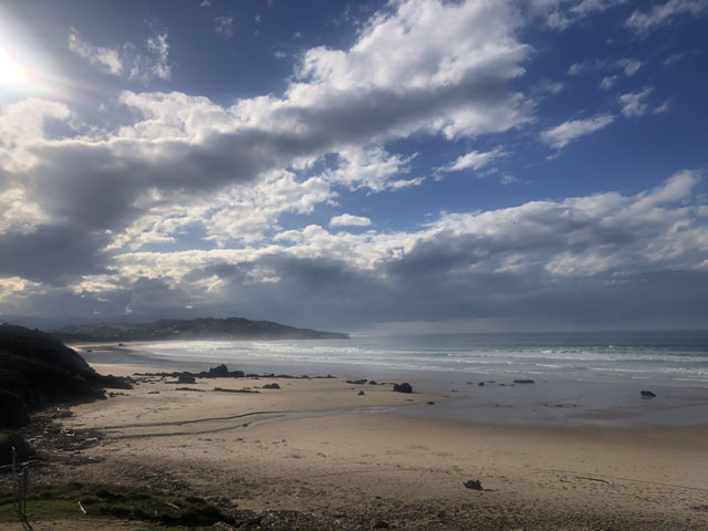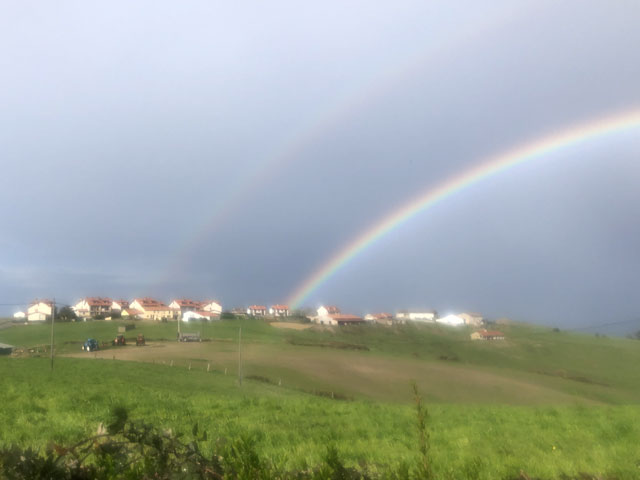 Während ich in meinem Versteck saß, ist jemand vorbei gezogen, den ich zwar als Pilger klassifizieren, aber nicht identifizieren konnte. Ich bin ihm in 50 Meter Abstand gefolgt und habe ihn dann aus dieser Entfernung an der Selfie-Pose vor der grandiosen Küste erkannt: Björn aus Frankfurt. Wir hatten uns in Santander verloren, wo er Quartier hatte und ich noch ein Stück weiter gezogen bin. Der ist allein gestern 41 km gelaufen und glaubte, dass ich weit vor ihm sei. Welch athletischen Eindruck ich doch hinterlasse!