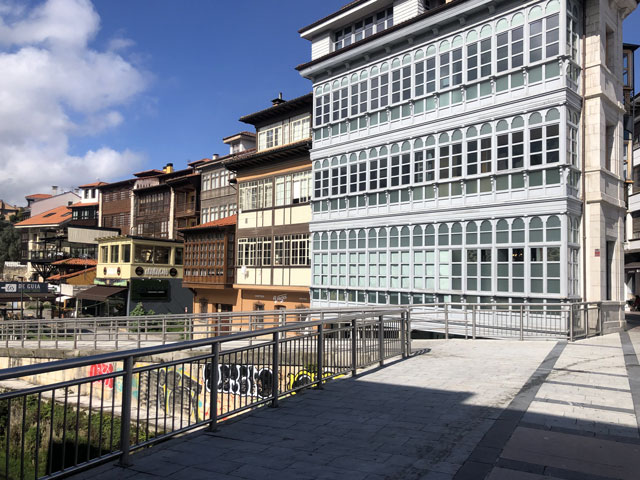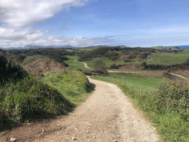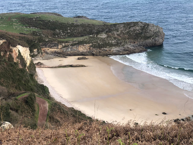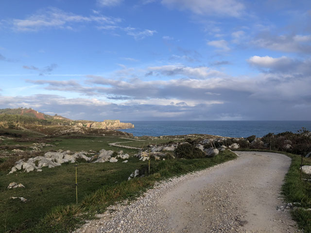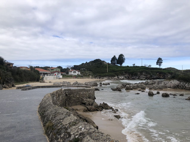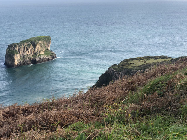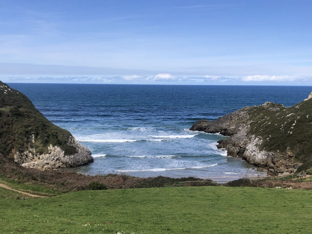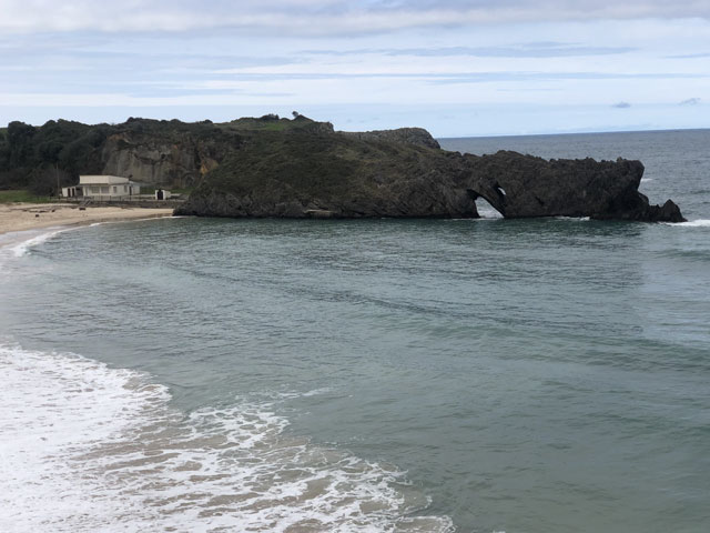 Es ist gestern Abend kein weiterer Gast in die Herberge gekommen, so dass ich mich heute früh richtig austoben konnte: bei vollem Licht alles raus aus dem Rucksack, frische Sachen rauskramen und die Dreckwäsche in den Waschsack. Der ist zwar noch nicht voll, aber es wäre schön, wenn ich den bald einer Waschmaschine anvertrauen könnte. In Piñeres, wohin ich heute möglichst kommen will, ist in einer der Herbergen angeblich Waschmaschine und Trockner im Preis enthalten. Das würde ja passen. Heute früh führte der Weg direkt zum Meer, das heißt auf die Klippen. Dort ging es lange Zeit im Zick-Zack durch die Weiden, auf denen Rinder, Pferde und Schafe grasten. Die Weiden sind alle nur mit Elektro-Drähten eingezäunt, so dass nichts den Blick über diese grüne Landschaft trübte, aus der immer wieder weiße Spitzen des felsigen Untergrundes herausragten. Es ging auf gleicher Höhe vorwärts, nur wenn kleine Bäche den Weg kreuzten, musste man mal runter und wieder rauf. Etwa auf halber Strecke nach Llanes tauchten Wegweiser auf, die zu den „Bufones de Arenillas“ führten. Das sind Fontänen, die in bestimmten Intervallen aus Löchern im Boden schießen. Das funktioniert leider nur, wenn das Wasser in die unter den Löchern befindlichen, zum Meer hin offenen Höhlen gedrückt wird. Aber das ist nur bei Wellengang der Fall und der fiel heute aus. Man konnte jedoch wenigstens das Grollen in den Höhlen hören. Nach einem etwas längeren Anstieg gab es einen wundervollen Blick aufs Meer, direkt unter einem ein grandioser Strand, dem ein großer Felsen vorgelagert ist. Rechts auf einer der Klippen konnte man Pferde erkennen, die da dicht am Abgrund grasen. Links war schon Llanes zu sehen, wo ich gerade meine kombinierte Frühstücks-/Mittagspause mit Sandwich und Café mache. In den zwei Dörfern, durch die ich zuletzt gekommen bin, Andrin und Cue, waren alle Kneipen zu. Hinter der tollen Aussicht habe ich mal absichtlich den Abzweig des Jakobsweges von der Straße verpasst, auch wenn das ein paar Jahre weniger Ablass gibt. Aber der Weg führte vorbei an einem Golfplatz einen Berg hinauf und dann ziemlich hoch über eine Reihe von Hügeln hinweg, die man wahrscheinlich nur aufgeschüttet hat, damit die Pilger hungrig und durstig in Llanes ankommen. Die Straße führte hingegen stets abwärts in den Ort und da mir nur zwei Autos begegneten, war das eine sehr gute Alternative. 14.00 Uhr. Ich sitze am Strand von Palombina, einem Ortsteil von Celoriu, und mache Pause. Die letzte liegt nicht lange zurück, aber es ist hier zu schön, um einfach vorbei zu hetzten, zumal es hier auch Bänke an der Strandpromenade gibt. Llanes, wo ich mir gleich am Ortseingang eine Bar gesucht habe, um das Frühstück nachzuholen, erwies sich als ein ziemlich lebendiges Städtchen, in dem offenbar auch zu dieser Zeit viele Touristen sind. Heute, am Sonntag, vermutlich auch viele Tagestouristen. Es gibt in der Stadt viele Gaststätten und Geschäfte, die heute fast alle offen haben. In einer Boutique habe ich mir einen Pilgerhut gekauft, der rundum Sonnenschutz bietet. Es ist zwar kein Krokodil drauf, aber er ist sicher was Nobles. Mit meinem Basecap sah ich doch einfach viel zu jugendlich aus. Am Ortsausgang von Llanes bin ich auf Alejandro gestoßen, der allein unterwegs war und meinte, die anderen drei seien vorneweg. Ich habe versucht, ein paar Meter mit ihm Schritt zu halten, und dabei den Abzweig des Jakobsweges nach rechts zur Küste verpasst. Bei Alejandro war aber auf der Karte ein Weg links, parallel zur Straße ausgewiesen und der Abzweig zu diesem Weg war auch mit der Muschel gekennzeichnet. Als dieser Weg nach ein paar hundert Metern wieder auf die Straße stieß und Alejandro längst außer Sichtweite war, bin ich auf der anderen Straßenseite durch ein paar verwinkelte Gassen zum Küstenweg, da ich mir den der schönen Aussichten wegen nicht nehmen lassen will. Selbst wenn ich erst ein…zwei Stunden später am Ziel bin, weil der Weg länger und hügliger als die Straße ist, will ich den jetzt weiter gehen und genießen. 16.15 Uhr. Ich liege gut im Plan. Es sind noch 6 km bis Piñares. Das hat mich dazu verleitet, nochmal einzukehren und eine Kleinigkeit zu essen. Eigentlich habe ich an sowas wie ein Stück Tortilla gedacht, aber da sehe ich doch in der finsteren Dorfkneipe eine Frau mit einem leckeren „Cordon Bleu“ vor sich. Das habe ich mir prompt bestellt. Mal sehen, ob Alejandro hier auch noch rein schneit. Bei der Pause am Strand stand der plötzlich wieder neben mir. Aber ich hatte zwischenzeitlich ein Getränk aus dem Rucksack meinem Körper zugeführt, wodurch Ersterer leichter und Letzterer gestärkt wurde. Nun bin ich ihm davongezogen und vermutlich hat er mich irgendwann nur noch als schwarzen Punkt am Horizont wahrgenommen. Ich war schon bei vorangegangenen Caminos der Meinung, dass dieses Getränk, „Estrella Galicia“ genannt, ein Zaubertrunk ist. Der Weg ging jetzt wieder ein Stück weg vom Meer und ständig, aber mäßig auf und ab, bis er auf eine Landstraße stieß. Entlang dieser Straße, zusammen mit der Autobahn und der Eisenbahnlinie, die hier aus Platzgründen durch einen Tunnel geführt wird, ging es um einen Felsen herum und dann ziemlich geradeaus weiter. Der Weg führt dann eigentlich von der Straße weg und parallel zu ihr an der Rückseite der Dörfer entlang. In Anbetracht dessen, dass es auch so 35 km werden, habe ich diese Umwege aber weggelassen. Zum sogenannten „Cordon Bleu“, das ich inzwischen zur Hälfte runtergewürgt habe, sei gesagt, dass dieses doch anders aussah als das, was ich bestellt habe und insgesamt schlimm war. Die Pommes waren vor Fett triefend und weicher als zerkochte Nudeln. Aus dem Fleisch, bei dem die Zutaten obenauf und nicht wie beim „Cordon Bleu“ innen drin lagen, weil es nur einlagig war, spritzte das Fett heraus, wenn man mit Messer oder Gabel hineinstach. Wahrscheinlich war es alt und hart und ist mit reichlich Fett wi