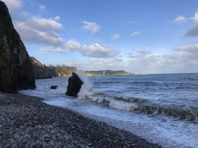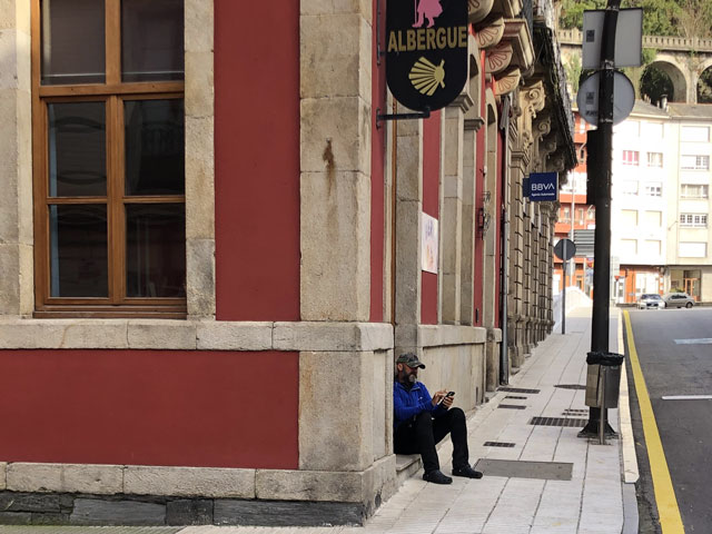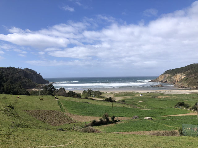 Ich habe die Nacht in Santa Marina ganz gut geschlafen, obwohl der aus Decken und Laken bestehende Bettdeckenersatz etwas schwer auf mir lastete und mich tief in das weiche Bett drückte. Der nächtliche Harndrang hat sich genau zur Zeitumstellung eingestellt, so dass ich live miterleben konnte, wie die Uhr auf dem Smartphone von 1.59 Uhr auf 3.00 Uhr sprang, ohne dass ich an einem Rädchen drehen oder die Frage beantworten musste, ob ich die Zeit umgestellt haben will. Unser Minister für Digitales verkauft das sicher als künstliche Intelligenz. „KI“ ist ja jetzt Mode wie einst CAD/CAM. Als ich mir als Student ein paar Groschen durchs Straßenbahnfahren verdienen musste, habe ich gern bei der Zeitumstellung die Nachtschicht übernommen, weil da eine Stunde mehr bezahlt wurde, als man gefahren ist - so auch im Herbst, wenn die Uhr wieder zurückgestellt wurde. Die Hose ist übrigens mit dem von der Pension gesponserten Seifenstück sehr sauber geworden. Ich habe sie ordentlich ausgewrungen, in das pensionseigene Badehandtuch gewickelt und nochmal gewrungen und schließlich locker mit dem Bund nach oben über mehrere Kleiderhaken verteilt aufgegangen. Trotzdem war der Bund heute früh noch feucht. Aber da gibt es ja den Trick, während der Morgentoilette die Hose in das noch warme Bett zu legen und ordentlich zuzudecken. Nach einer halben Stunde war die Hose nicht nur trocken, sondern auch warm und glatt, als wäre sie gerade gebügelt worden. 12.00 Ihr. Die beste Zeit für ein stärkendes Getränk und eine Kleinigkeit dazu. Ich bin jetzt in Cadavedo, dem Endpunkt der 18-km-Etappe, die ich halbiert habe. Nun kommen noch die 15 km der nächsten Etappe bis Luarca. Von Santa Marina bis hier habe ich ganz brav alle Schluchten mitgenommen. Gleich am Ortsausgang ging es runter in die erste, auf einem steinigen Weg, der zugleich als Bachbett dient. Unten war zum Glück eine Brücke über den von links kommenden Bach - aber nur über den ersten. Hundert Meter weiter war der nächste zu überqueren, dieses Mal erneut von Stein zu Stein balancierend. Dann ging es hoch bis zur Straße und nach dem nächsten Ort (Ballota) wieder runter und 200 Meter vor der Mündung des Rio Cabo, der dieses tiefe Tal gegraben hat, über eine Brücke und auf der anderen Seite des Baches nochmal hoch bis zur Landstraße. Ich bin auch noch die 200 Meter von der Brücke bis zur Wasserkante gelaufen und war begeistert. In der schmalen Lücke zwischen den Felsen der Steilküste haben Wellen über Jahre hinweg rund geschliffene Steine zu einem hohen Wall aufgetürmt. Jede Welle, die kommt, versucht die Steine noch ein Stück höher zu schieben, was einen hohen Ton ergibt. Und beim Zurückweichen der Welle rollen die Steine wieder ein Stück herunter, was einen tiefen, grollenden Ton ergibt. Das ist die perfekte Untermalung, wenn man zuschaut, wie die Wellen auf den Wall, gegen die Steilküste und einzelne im Wasser stehende Felsen knallen und hoch aufspritzen. Ich musste vorhin abbrechen, weil ich plötzlich Antoine vor der Gaststätte entdeckt habe. Ich hab die Tür aufgerissen und ihn herein gerufen. So konnte ich mich gleich für das gestern Abend für mich hinterlegte Bier revanchieren. Wir sind danach ein Stück zusammen gelaufen und haben noch Selfies gemacht, bevor er sich in einem kleinen Park zum Mittagessen aus dem Rucksack niedergelassen hat. Er wird in einer sehr preiswerten Herberge in der Nähe von Luarca übernachten. Morgen sehen wir uns bestimmt wieder. Nach der Überquerung des Rio Esva gab es noch einmal eine schöne Begegnung mit dem Meer. Hinter der dem Augenschein nach sehr guten Herberge „Playa de Cueva“ am Hotel „Canero“ geht es unter einer hohen Autobahnbrücke hindurch. Der ausgeschilderte Weg biegt dann links in den Wald ab. Hier empfiehlt es sich, noch ein paar Meter weiter bis zum Strand zu laufen. Der Aufstieg geht einem dadurch nicht verloren, der kommt dann nur etwas später. Es ist ein Sandstrand und dahinter wieder ein Wall von rund geschliffenen Steinen. Heute war ordentlich Wind und die Wellen kamen mit solcher Wucht an den Strand, dass die Gicht unter der Autobahnbrücke hindurch in das Tal getrieben wurde und dieses in Nebel hüllte. Danach führte der Weg mal entlang der Landstraße, mal durch Wald und dann wieder über Wiesen mit Blick auf das Meer. Schon einige Kilometer vor Luarca tauchte der Weg in ein großes Siedlungsgebiet ein und durchquerte viele kleine Siedlungen. Nun musste der Karte nach Luarca kommen und nach der nächsten Kurve, wo mir der Wind die Mütze vom Kopf gerissen hat, tat sich plötzlich der Blick auf die tief unten liegende Stadt mit ihrem Hafen auf. Hier gab es Fotomotive ohne Ende und beim Weg hinunter in die Stadt konnte man alles nochmal aus einer anderen Perspektive fotografieren. Die Herberge in Luarca ist im Erdgeschoss eines Stadthauses untergebracht und gehört zum gegenüber liegenden Hotel. Wir sind hier nur zu sechst: John und Tori, Alex und Björn und ein Michael aus Düsseldorf, der schon ein paar Camino Francés hinter sich hat und nun diesen Weg probiert. Alex ist gut drauf und war heute schon zeitig hier. Björn hat hingegen immense Fußprobleme und dazu noch eine Grippe. Der war schon gestern hier und wollte sich heute auskurieren. Aber da es nicht besser geworden ist, gibt er hier auf und fliegt nach Hause. Wieder einer von denen, welche die Kilometer runterreißen und nicht dran denken, dass die Kraft noch für den nächsten Tag reichen muss. Immerhin hat er es geschafft, mit Alex und mir in eine Pizzeria zu kommen, wo wir sehr gut gegessen haben. Ich habe noch gar nicht auf die Karte geschaut, was sich morgen als Absteige anbietet. Da ich gut im Plan liege, werde ich vermutlich nicht die über 30 km bis A Caridá laufen, sondern mir vorher was suchen. Die darauf folgende Etappe hat nur 22 km und ist flach, da kann man sicher den Rest der vorherigen dranhängen. Wenn nichts dazwischen kommt und die Beine mitmachen, werde ich woh