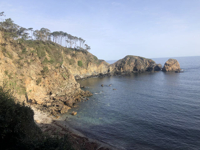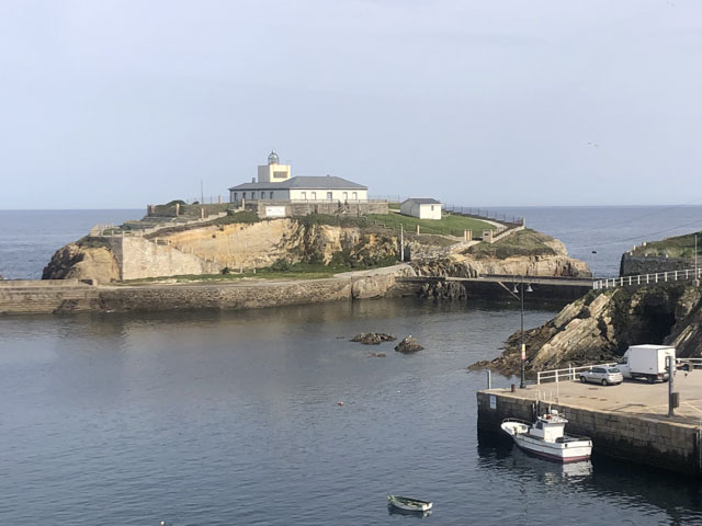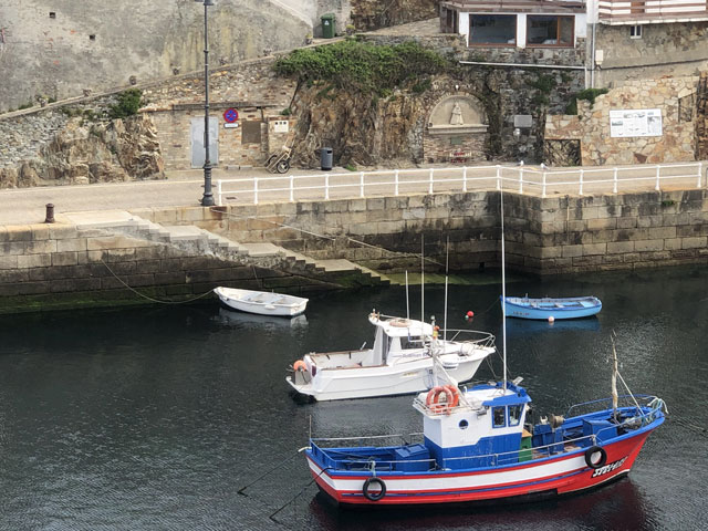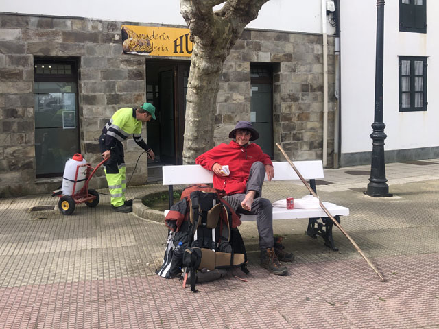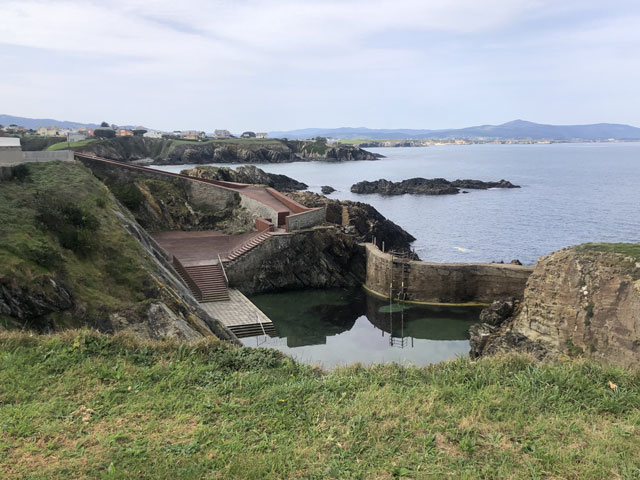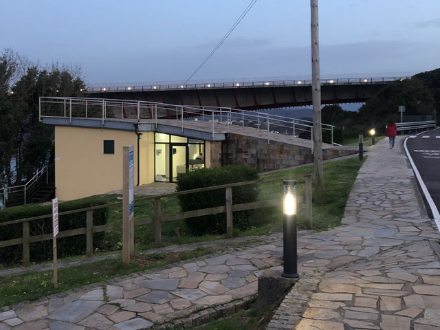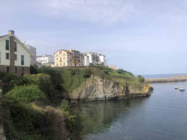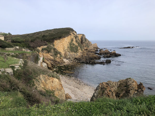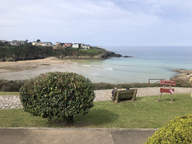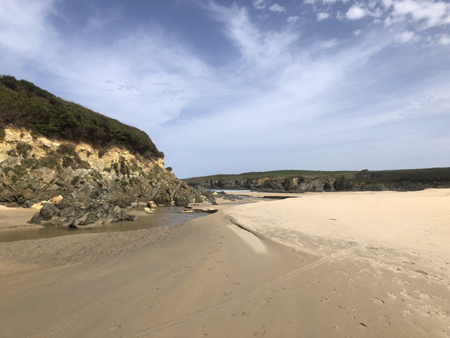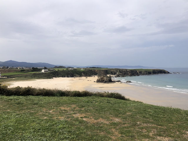 Ich habe in der 7-Euro-Herberge in A Caridá hervorragend geschlafen. Kurz vor sieben waren alle wach, aber jeder hat leise im Dunkeln gepackt und keiner hat sich getraut, das Licht anzumachen. Da alle noch was vom abendlichen Einkauf übrig hatten, haben wir bis auf die beiden Spanier, die schon unterwegs waren, zusammen um den großen Tisch im Vorraum gesessen und was gegessen. Leider waren der Kaffeeautomat außer Betrieb und die Küchenausstattung etwas dürftig. Die vom abendlichen Ravioli-Essen übrig gebliebene Butter musste mit dem Löffel aufs Brot geschmiert werden, weil es keine Messer gab. Das ging aber. Tragischer war, dass es als Trinkgefäße nur Biergläser gab, die nicht in die Mikrowelle passten, so dass keine Möglichkeit bestand, heißes Wasser für einen löslichen Kaffee zu bereiten. Mit dem Hellwerden sind Alex und ich aufgebrochen. Ich musste ihn aber bald laufen lassen, weil ich da nicht mithalten kann. Außerdem tat mir, wie seit Wochen immer mal, ein Knie weh. Aber das war wahrscheinlich noch nicht auf Betriebstemperatur, denn nach einer halben Stunde ging’s. Als Trost fürs Hinterherhinken fand ich nach einer Weile auf einem Markierungsstein eine Büchse „Mahou“, die mir Alex da hingestellt hat. Ich konnte mich später mit einer Socke revanchieren, die einst an seinem Rucksack baumelte und nun vor mir auf dem Weg lag. Der Weg führte überwiegend auf ausgestorbenen Landstraßen an der Küste entlang. Aber immer so weit entfernt, dass man nur ab und zu mal zwischen den Hügeln das Wasser zu sehen bekam. An einer Stelle, wo in der Karte ein kleiner Strand und davor eine Aussicht eingezeichnet waren, bin ich mal abgezweigt und die paar hundert Meter dorthin gelaufen. Das hat sich gelohnt, weil man von der Aussicht aus gut die Lücke zwischen den Felsen und den dort liegenden Strand einsehen konnte. Leider war gerade gar kein Wellengang, das wäre sonst bestimmt wieder ein brausendes Erlebnis geworden. In Tapia de Casariego, einem kleinen Hafenstädtchen bin ich wieder vom Weg runter, der geradewegs durch den Ort führt. Ich bin bis ans Wasser ran und habe eine wunderbare Promenade gefunden, die hinter den Häusern in etwa 20 Meter Höhe an Hafen und Strand entlang führt. Zwischendrin immer mal schöne Sitzgelegenheiten. Eine davon habe ich fürs zweite Frühstück benutzt - mit Blick auf den Leuchtturm und den schräg unter mir liegenden Hafen. Zurück auf dem Weg habe ich vor der Kirche Antoine getroffen, der da barfuß auf einer Bank saß und seine zerschundenen Füße gepflegt hat. Hier in Tapia bot sich auch erstmals die Möglichkeit, einen Kaffee zu trinken. Zum Glück ist bei mir die Kaffeesucht nicht mehr so ausgeprägt wie früher. Sonst wäre es eine Tortur, sich den ganzen Vormittag ohne Koffein im Leib zu quälen. Am Ortsausgang von Tapia windet sich die Straße um einen weit ins Land hineinreichenden Strand mit schönen Parkanlagen und Autostellplätzen drum rum. Ein Stück weiter bin ich erneut vom Weg runter zur Küste, weil dort ein Strand angepriesen wurde. Und da es morgen von der Küste weg geht, könnte das schon fast der letzte sein. Der Strand war tatsächlich sehr schön, groß und mit feinem Sand sehr einladend. Ein Herr hat mir geraten, unterhalb der Steilküste am Strand weiter zu laufen, bei der herrschenden Ebbe wäre das ungefährlich. Ich habe auch einen Anlauf gemacht, den ich dann aber am ersten Wasserlauf abgebrochen habe, der sich über den Strand zog. Den hätte man durchwaten müssen, aber ich hatte keine Lust, mir dafür die Schuhe auszuziehen und bin stattdessen wieder zurück auf den Weg. Von Ferne habe ich da schon jemand mit rotem Kopftuch gesehen, der auf mein Winken hin anhielt: Thomas aus Leipzig. Mit dem bin ich dann bis ans Ziel gelaufen. Inzwischen war es ziemlich warm geworden und als der Weg mal wieder (dieses Mal auf einem ordentlichen Holzbohlenweg) an einem Stand vorbei führte, beschlich uns die Hoffnung, dass wenigstens eine der von weitem sichtbaren Gaststätten offen hat. Aber die eine gehört zu einem Campingplatz und macht vermutlich erst in der Saison auf, die andere war ebenfalls geschlossen, aber drinnen war jemand am Schaffen. Der sagte uns, dass er dabei ist, alles für die Eröffnung am Sonnabend vorzubereiten. Erfreulicherweise hatte er schon den Kühlschrank befüllt und in Betrieb genommen. Er war so nett, uns zwei Büchsen „Mahou“ zu verkaufen und hat uns sogar zwei Stühle auf die noch leere Terrasse gestellt und Knabberzeug gebracht. Das ergab eine richtig schöne Pause mit Blick auf den noch menschenleeren, von kleinen Felsen eingerahmten Strand. Frisch gestärkt ging es dann weiter bis zur Autobahnbrücke über die Ria (Mündung) des Rio Eo, der hier zugleich die Grenze zwischen Asturien und Galicien bildet. Auf der endlos lang erscheinenden Brücke, die beidseits einen schmalen Gehweg aufweist, habe ich also das Fürstentum Asturien, wie die Autonome Gemeinschaft (Provinz) offiziell heißt, verlassen und Galicien erreicht. Anders als auf dem Camino Francés wird man nicht durch einen eindrucksvollen Grenzstein begrüßt, sondern nur durch ein über der Autobahn hängendes grünes Schild. Am Ende der Brücke trennten sich unsere Wege. Thomas ist nach links in den Ort, wo er ein Hotel gebucht hat und ich bin theoretisch nach rechts, aber praktisch in vielen Windungen unter der Autobahn hindurch abgebogen. 100 Meter neben der Brücke, oben auf der Klippe an der Ria gelegen, befindet sich die angepeilte 12-Betten-Herberge, die laut Pilgerführer immer ganz schnell voll ist. Ich hatte deshalb Alex, der auch dort absteigen wollte, gebeten, mir ein Bett freizuhalten. Das war aber nicht nötig, denn als ich kam, war er noch der Einzige in der Herberge. Später kam noch ein Dritter (Spanier) und um 22 Uhr, als der Hospitalero schon weg war, noch ein Engländer, der mit dem Flieger nach Santiago und von dort mit dem Bus hier her ist, was wohl länger als gedacht gedauert hat. Alex hat schon 