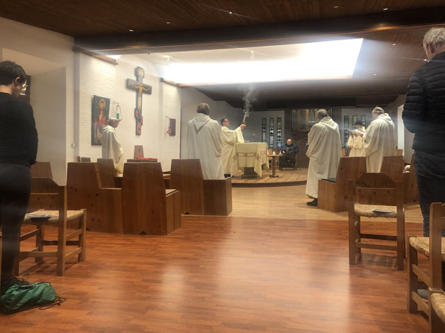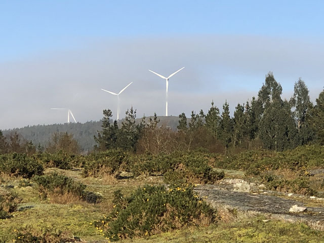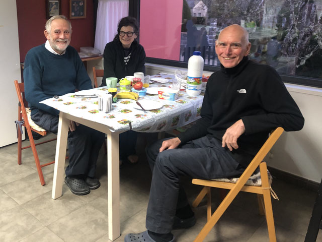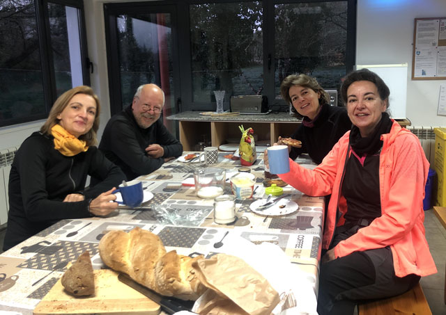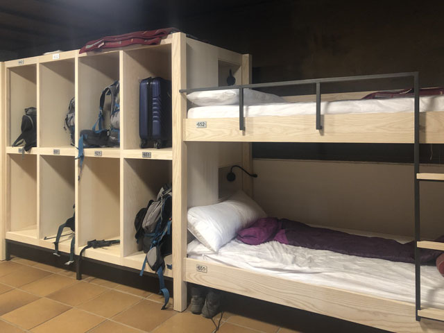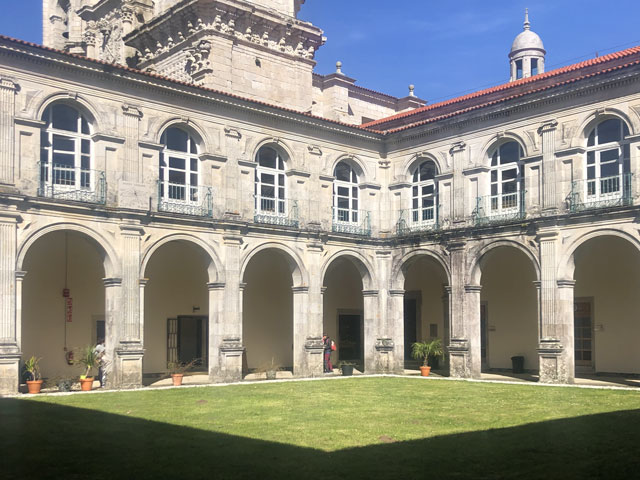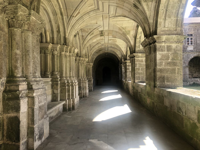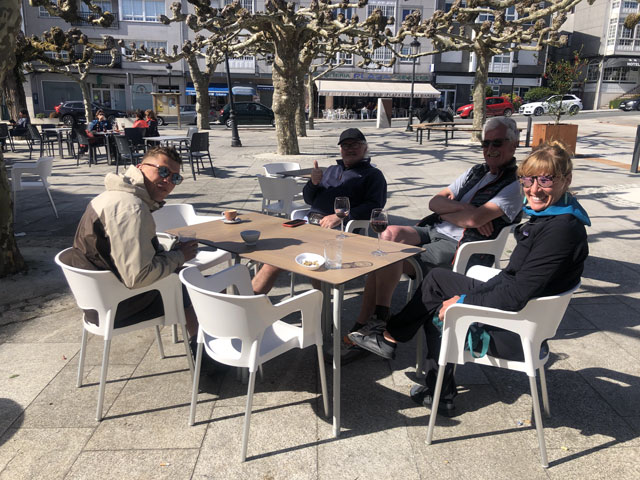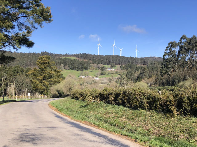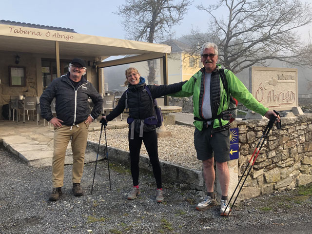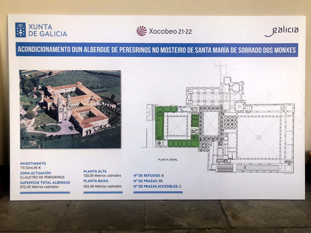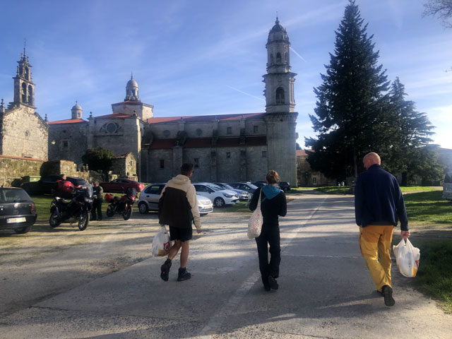 Der Tag begann mit einem guten Frühstück, serviert von den englischen Hospitaleros: reichlich Kaffee, getoastetes frisches Weißbrot, Butter und Marmelade, die ich durch Chorizo aus meinem Rucksack ersetzt habe. Mit am Tisch saßen die drei Spanierinnen, die sich als sehr nett erwiesen, zumal sie behaupteten, dass ich nicht geschnarcht hätte. Da ich um sechs auf dem Rücken liegend nochmal für eine gute Stunde eingeschlafen bin, statt nur zu schlummern, kann das gar nicht sein, denn auf dem Rücken liegend schnarche ich immer - wird zumindest zuhause behauptet. Die Spanier sind halt nette Leute. Die Drei sind übrigens Schwestern. Ana ist Lehrerin, Bea (Beatriz) und Mathy (Maria-Theresia) sind Ärztinnen. In der Nacht war nur ein Grad und um halb Zehn, als ich nachgeschaut habe, waren es immer noch nur vier Grad, aber als dann die Sonne raus kam, wurde es ganz schnell wärmer. Allerdings hielt sich der Morgennebel sehr lange und es sah aus, als würden sich die Windräder bemühen, ihn zu vertreiben. Und tatsächlich war er auf der mit Windrädern besetzten Seite des Weges schneller verschwunden, als auf der anderen Seite. Der erste Teil des Weges war insofern interessant, als er wieder von den verschiedensten Steinmauern eingefasst war oder über felsigen, nur spärlich bewachsenen Felsboden führte. Später führte der Weg überwiegend entlang einer wenig befahrenen Landstraße, die an der Grenze der Provinzen Lugo und A Caruna ihren Namen von LU-934 in AC-934 änderte. Es ging immer nur sehr sachte auf und ab, so dass ich gut voran kam, obwohl hier mit 710 Metern der höchste Punkt des Camino del Norte zu bewältigen war. Die erste Einkehrmöglichkeit am Wege, eine Herberge ca. 5 km hinter Miraz, habe ich gar nicht als solche wahrgenommen, sondern mich nur gewundert, dass die Pilger hinter mir plötzlich verschwunden waren. Erst später habe ich gelesen, dass in der Herberge auch eine Bar ist. Pech gehabt. Erst 15 km weiter kam wieder eine Bar, nicht weit von Zielort entfernt. Dort wollte ich eigentlich nur etwas Flüssigkeit zu mir nehmen, aber dann habe ich gesehen, dass die Einheimischen alle Schälchen mit weißen Bohnen und etwas Fleisch hinterschlingen. Das habe ich mir dann auch bestellt, was nicht verkehrt war. 2…3 km vor dem Ziel bin ich dann mal falsch bzw. nicht abgebogen und erst nach einem Umweg wieder auf der Route gelandet. Der Schrecken war groß, als ich sah, dass da zwei Gruppen an „Bettbewerbern“ nahten, denen ich nun nur wenige Schritte voraus war. Mit meinem berüchtigten Eilschritt gelang es mir aber, diese abzuschütteln. Dabei kam mir zu Hilfe, dass diese an einem hübschen See am Wegesrand zum Fotografieren anhielten, während ich im Vorbeieilen zwei Bilder aus der Hüfte schoss. Frei von Verfolgern schritt ich nun dem Kloster zu und fiel vor Schreck fast um, als just 10 Meter vor mir zwei andere Gruppen aus einer Seitenstraße kamen und mir die Poleposition streitig machten: Kieran mit den drei spanischen Schwestern und eine junge Spanierin, die mir schon mehrmals über den Weg gelaufen ist, mit drei noch unbekannten Spaniern. Nicht mit mir! Ich habe die von hinten so in ein Gespräch verwickelt und zum Fotografieren animiert, dass ich plötzlich mitten drin war und mit ihnen in die Rezeption des Klosters schlüpfen konnte, deren Tür immer nur einen Spalt geöffnet wurde, um kleine Grüppchen einzulassen. Da wir nun gut durchmischt waren, konnte hinten jeder behaupten, dass er zu einem da vorn gehört. Und so saßen wir dann zu neunt in der Rezeption und konnten miterleben, wie die Dame bei jedem der gleich aussehenden Personalausweise (Kieran‘s englischer Pass mal ausgenommen) suchte, wo denn die Nummer, der Name, das Geburtsdatum etc. stehen. Das hat zusammen eine halbe Stunde gedauert. Dann hat uns ein sehr gut Englisch sprechender Mönch abgeholt und zu unserem Zimmer, Refugio 6, geführt. 9 Personen / 10 Betten - passt. Wir sind nun also alle im gleichen, sehr modern eingerichteten Raum gelandet. Der geht wie die anderen Zimmer, die Küche, die Toiletten usw. vom Kreuzgang ab. Der Mönch, der uns noch Vieles gezeigt und erklärt hat, wies auch darauf hin, dass der Supermarkt heute am Sonntag zwar geschlossen hat, dass der Inhaber aber gleich daneben wohnt und den Laden aufmacht, wenn jemand was braucht und anklopft. Vor einer der Gaststätten am Platz vor dem Kloster habe ich alle möglichen Bekannten wiedergetroffen: Alex, Thomas (der nebenan im Hotel wohnt), Tori & John und die Franzosen. Dazu Kieran. Nach einem Wiedersehenstrunk sind ein paar von uns losgezogen, um was zum Abendbrot zu kaufen, denn im Kloster gibt es eine sehr gut eingerichtete Küche und Alex hat angeboten, was zu kochen. In der uns genannten Straße fanden wir dann plötzlich zwei gegenüber liegende Supermärkte mit je einer Haustür links und rechts. Wo soll man nun klopfen? Der erste Versuch war ein Volltreffer. Eine Minute später kam eine Dame, schloss einen der Supermärkte auf, schaltete das Licht ein und ließ uns in Ruhe suchen. Wir haben Ihr letztlich auch einen ganz guten Umsatz beschert und dann in der Küche aus dreißig Eiern und einem Haufen Gemüse ein prima Rührei mit Paprika etc. für 6…8 Personen bereitet. Es hat nicht nur geschmeckt, sondern war ein tolles gemeinsames Abendessen. Zwischendurch war ich um 19 Uhr zur Vesper in der gut besuchten Kapelle des Klosters. Sieben Mönche standen um den Altar, auf dem ein Weihrauchfass stand, und sangen und beteten mit langen Pausen, was durch eine wechselnde Beleuchtung sehr stimmungsvoll war. Später, um 21.15 Uhr, als die anderen sich schon auf ihre Zimmer verteilt hatten, bin ich auch noch zur Komplet, d. h. zum Tagesabschluss mit lateinischem Gesang in die Kapelle. Dieses Mal habe ich den Weg nur mit der Nase gefunden. Das Licht in den Gängen war schon ausgeschaltet und teilweise waren schon Absperrungen aufgestellt, aber der Weihrauchduft hat alle Absperrungen überwunden und mir den Weg gewiesen. Di