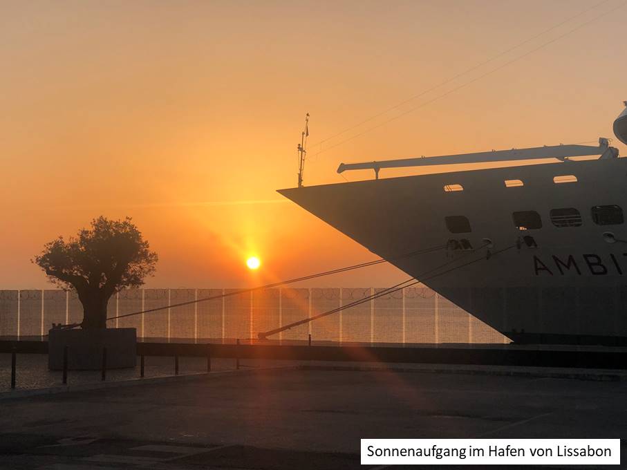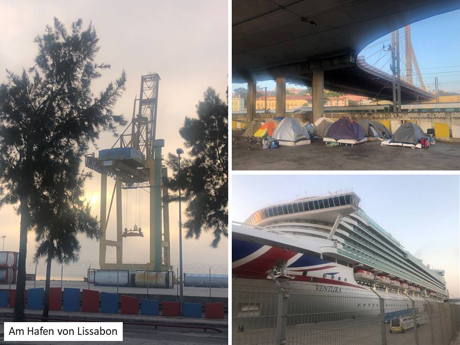Weiter ging es durch enge, verwinkelte Gassen mit vielen Fado-Bars, die jetzt verlassen und fast unheimlich waren. Irgendwann bin ich nach rechts vom Weg abgekommen und im Hafen gelandet, wo ein riesiges Kreuzfahrtschiff, die „Ventura“ einer britischen Gesellschaft, festgemacht hatte. Höher und viel länger als unser früherer Neubaublock in Hellersdorf. In dem würde ich nicht gern Urlaub machen wollen und daran ändert sich auch nichts, wenn Wasser statt Rasen ringsum ist. Das daneben liegende Schiff, in Höhe und Länge vielleicht die Hälfte der Ventura, sah dagegen wie ein Fischkutter aus.