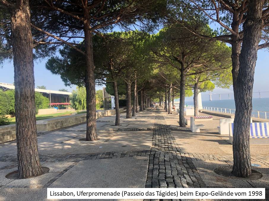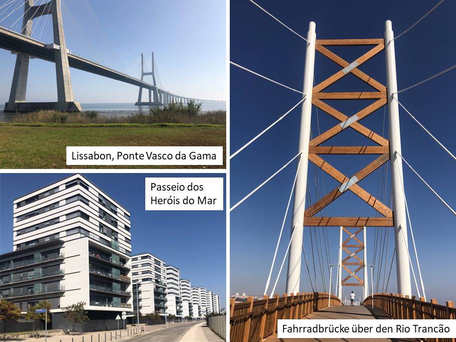 Der Camino führt entlang einer breiten Straße zu einem sehr futuristisch anmutenden Wohngebiet, das rings um die Ausstellungspavillons der Expo 98 entstanden ist und immer noch wächst. Die Pavillons der Weltausstellung 1998 haben längst neue Nutzung erfahren. Geblieben sind viele Gaststätten an der immer noch sehr beliebten Flaniermeile durch das Gelände. Bei einem Wetter wie heute (mittags 24 Grad, später sogar 27 Grad) bot es sich an, die Promenade direkt am Wasser zu benutzen, die gut von Bäumen beschattet ist. Parallel zu dieser Promenade, genau über der Uferlinie verkehrt eine zur Expo eröffnete Seilbahn. Da man aus der heraus aber auch nicht viel mehr sieht als von der Promenade, sind nur wenige bereit, für eine Fahrt 7 Euro zu bezahlen. Darum stand sie wohl auch bis auf einen Probelauf den ganzen Tag. Eine Attraktion des Geländes ist am nördlichen Ende, an der Seilbahn-Endstation, das Myriad-Hotel, das aussieht wie der kleine Bruder des Burj El Arab in Dubai, nur dass man hier meines Wissens selbst als Promi nicht oben mit den Hubschrauber landen kann. Dafür kann man aber als (zahlungskräftiger) Normalsterblicher mit dem Fahrstuhl hochfahren und sich umschauen, was sicher lohnt. Von da oben kann man die imposante Vasco-da-Gama-Brücke über die Bay aus einem ganz anderen Blickwinkel begutachten. In Ufernähe überspannt die Brücke mit zwei Schrägseilelementen in großer Höhe die Fahrrinne und führt im weiteren Verlauf nur wenige Meter über dem Meeresspiegel zum anderen Ufer der Bay, wo sie nochmal kurz in die Höhe führt, um großen Schiffen die Durchfahrt zu ermöglichen.