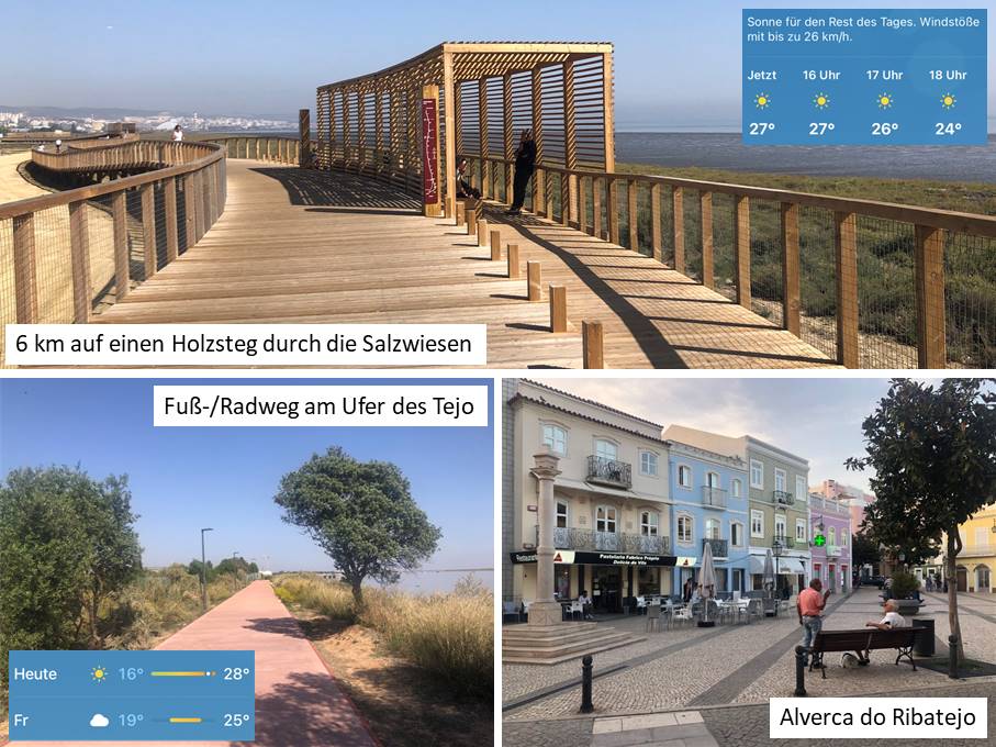 Hinter der Vasco-da-Gama-Brücke verläuft der Camino auf teils fertigen, teils noch im Bau befindlichen Wanderwegen entlang des Wassers. Damit war früher an der Mündung des Rio Trancão Schluss. Ab da ging es durch Sacavém und dann jenseits der nachfolgenden Orte, also auf deren Westseite, im Zickzack nach Norden. Kürzlich wurde aber eine Fußgänger-/Radfahrerbrücke über diesen Fluss gebaut und dahinter ein auf Stelzen durch die Salzwiesen am Ufer führender Weg eingerichtet: etwa 3,30 Meter breit und über 6 km lang! Aus Leisten errichtete „Tunnel“ und Vogelbeobachtungsstationen spenden dem Wanderer, Jogger oder Radfahrer stellenweise etwas Schatten. Da, wo der Laufsteg zu Ende ist, geht es auf einem breiten Weg mit Tartanbelag zwischen den Gewerbegrundstücken und dem Wasser weiter. Auch hier kann man viele Wasservögel, darunter auch Flamingos, beobachten.