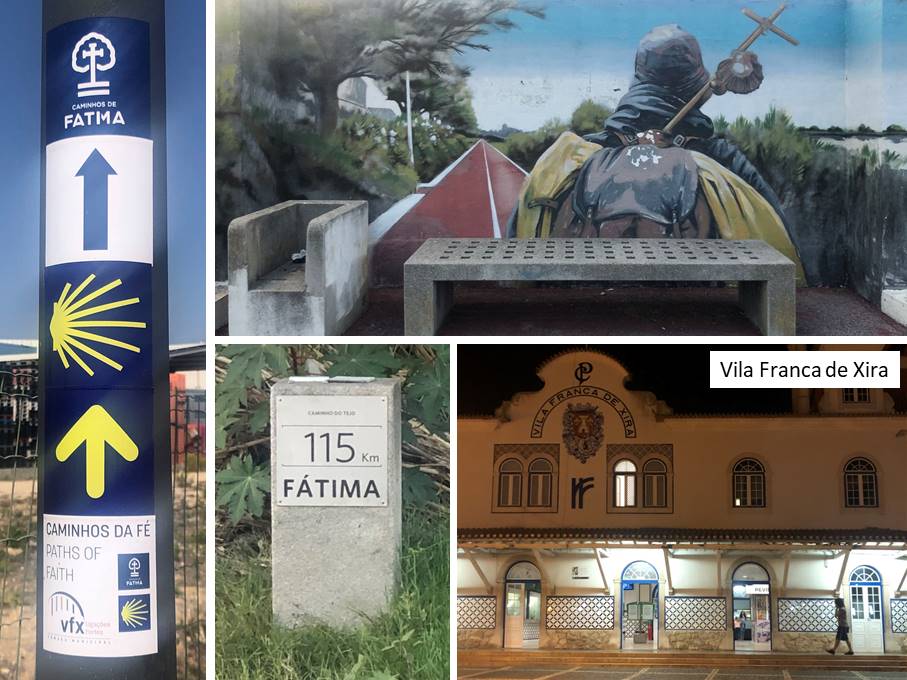 Da ich gern entlang von Häfen spaziere und eh schon genug Altstadtgassen gesehen habe, bin ich am Wasser geblieben. Irgendwann traf ich wieder auf den Jakobsweg, der in der Stadt etwas sporadisch ausgeschildert ist - und wenn, dann mitunter nur als Weg nach Fatima mit einem blauen Pfeil. Weiter draußen klebt dann beides untereinander: das Symbol des Weges nach Fatima mit einem blauen Pfeil und die Jakobsmuschel mit einem gelben Pfeil. Eine fünfte Plakette verweist gelegentlich auf die Caminhos da Fé, die „Wege des Glaubens“, womit wohl die beiden zuvor genannten Wege zusammengenommen gemeint sind.