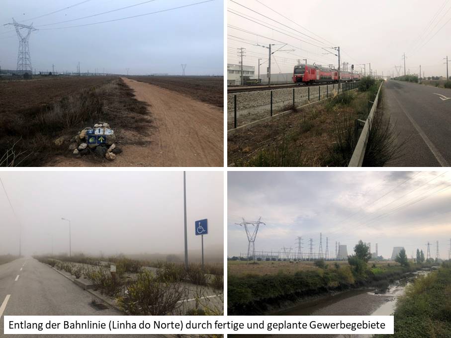 Wie ich schon vorgewarnt wurde, ist das Landesinnere von Portugal nicht unbedingt ein touristisches Highlight. Aber ich versuche, das als Pilger und nicht als Tourist zu sehen. Der Weg führte heute fast ausnahmslos entlang der Bahnlinie nach Norden. Auf der anderen Seite der Bahn reihte sich ein Logistik-Zentrum an das andere, riesige Hallen mit über hundert Toren. Alle direkt an der Bahn gelegen, aber keines mit Bahnanschluss. Hier wird auch alles mit dem LKW transportiert. Unter den vielen Zügen, die an mir vorbeigerast sind, war nicht ein Güterzug. Auf meiner Seite der Bahn wechselten sich frisch gepflügte Felder und halb fertige Gewerbegebiete ab. Über mehrere Kilometer verliefen Erschließungsstraßen mit Unmengen an Parktaschen parallel oder rechtwinklig zur Hauptstraße. Alles mal für viel Gewerbe gedacht, das nicht kam. Inzwischen ist das Unkraut, das auf den Parktaschen wächst, hüfthoch.