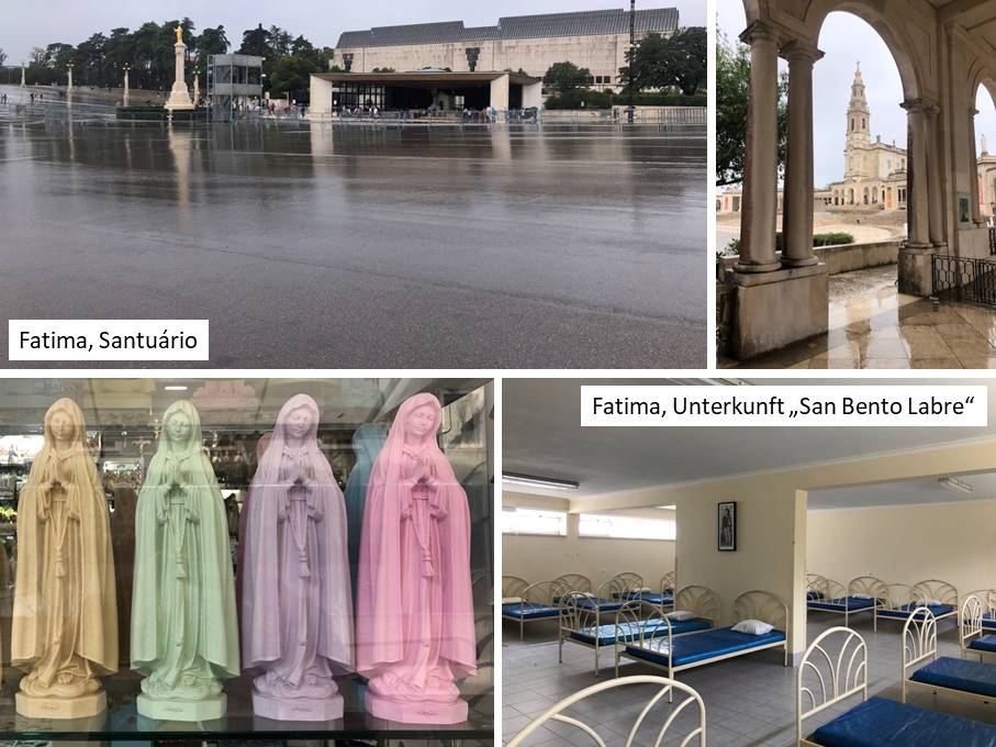 Ich bin dann ins Santuário und habe mir dort nochmal alles angesehen. Ich finde die Anlage wirklich beeindruckend, selbst bei diesem traurigen Wetter. An der „Brennkammer“ für die Kerzen habe ich versucht, durch dichtes Herantreten meine nassen Hosen zu trocknen, aber mir war bange, dass sich die Flammen über meinen Poncho hermachen. Am Infostand habe ich nach einer Herbergsliste für den weiteren Weg gefragt. Diesbezüglich bin ich an die Touristeninfo verwiesen worden, allerdings konnte mir die Dame sagen, dass ich als Fußpilger gegen eine Spende im Besucherzentrum „Casa S. Bento de Labre“, nicht weit von der Basilika entfernt, übernachten kann. Dort bin ich hin, nachdem ich mir im Touristenbüro ein Prospekt zum Pilgerweg und den Link zu einer Webseite mit Adressangaben (vialusitana.org/en/albergues_eng) geholt habe. Dabei bin ich durch eine der ans Santuário angrenzenden Straßen und war erschrocken, wie viele Andenkenläden es da gibt. Marienfiguren bekommt man in allen Größen und Farben. Ein Schaufenster mit lauter pastellfarbenen Figuren hat mich stark an die früher so geliebten süßen Pfeffi-Varianten erinnert.