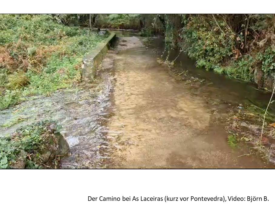 Hinter Pontevedra führte der Weg überwiegend durch dichten, nach dem Regen stark duftenden Eukalyptuswald. Der Boden war glatt gewalzt und neben dem Weg war für das Regenwasser eine in Stein gefasste Rinne. Ab und zu wurde das Wasser über den Weg geführt, aber stets in einer steinernen Mulde, die man meist mit einem großen Schritt überwinden konnte. Wenn das querende Bächlein mal etwas größer war, fand sich ein aus großen Steinblöcken gefertigtes Brücklein. So bin ich trockenen Fußes bis zur „Albergue A Portela-Barro“ gekommen, aus der ich oben berichtet habe.